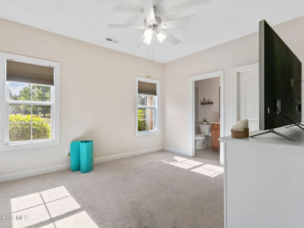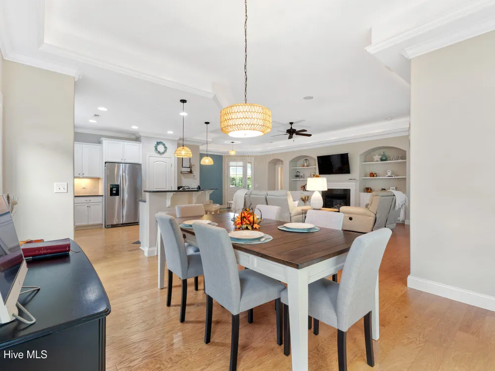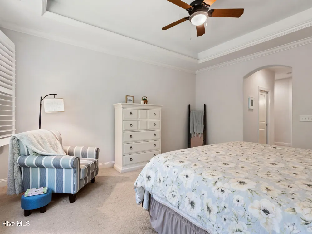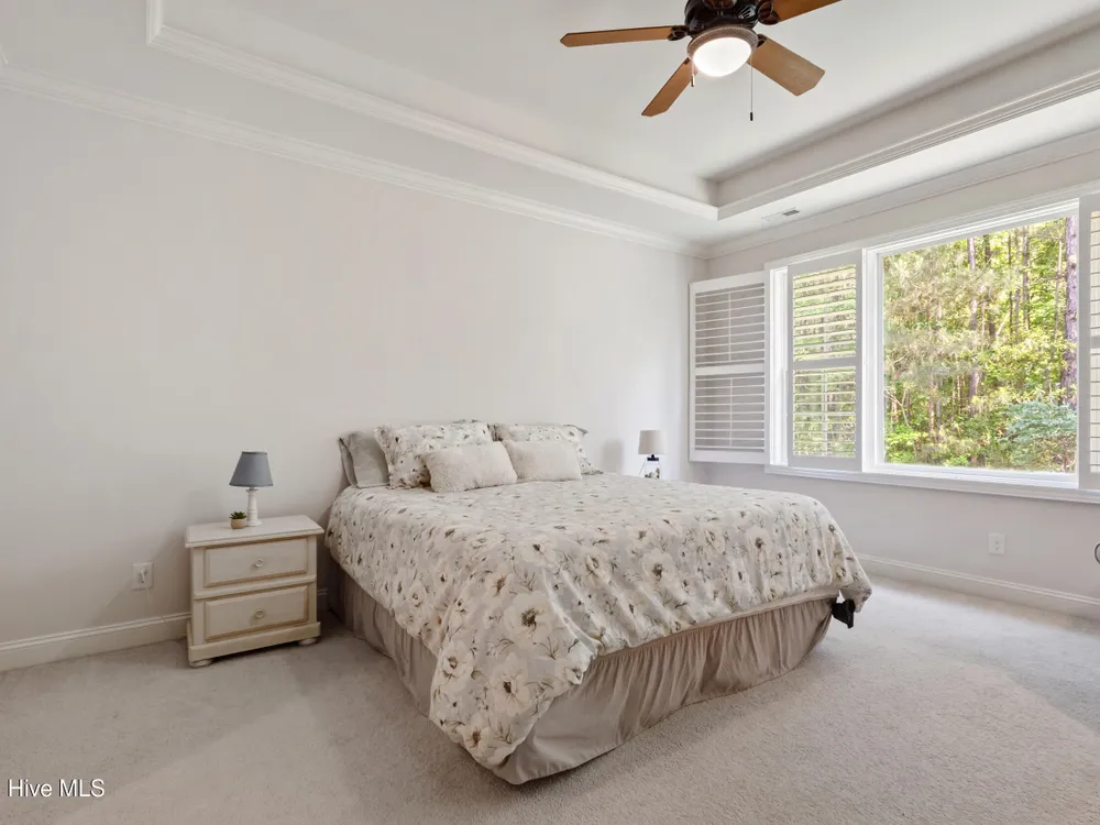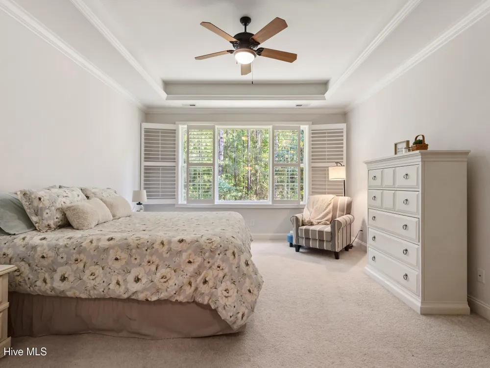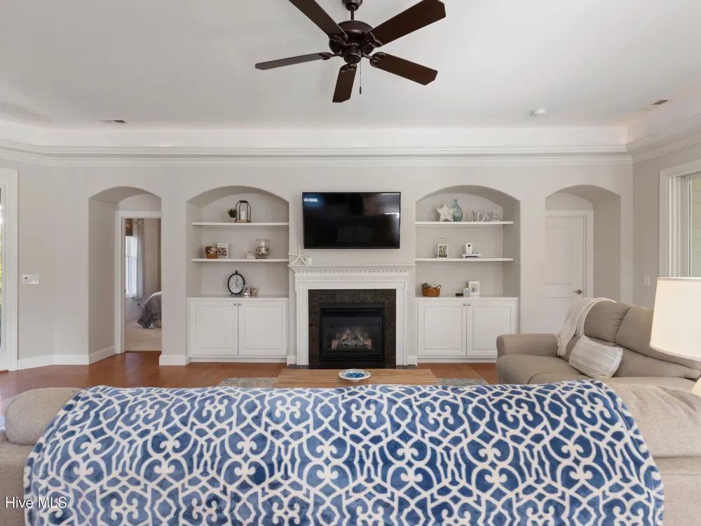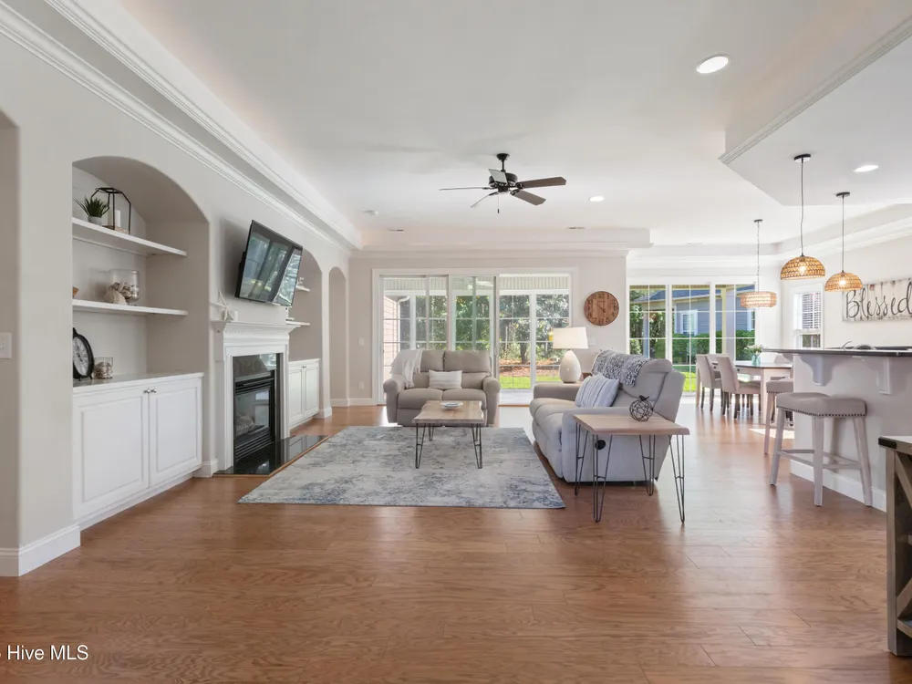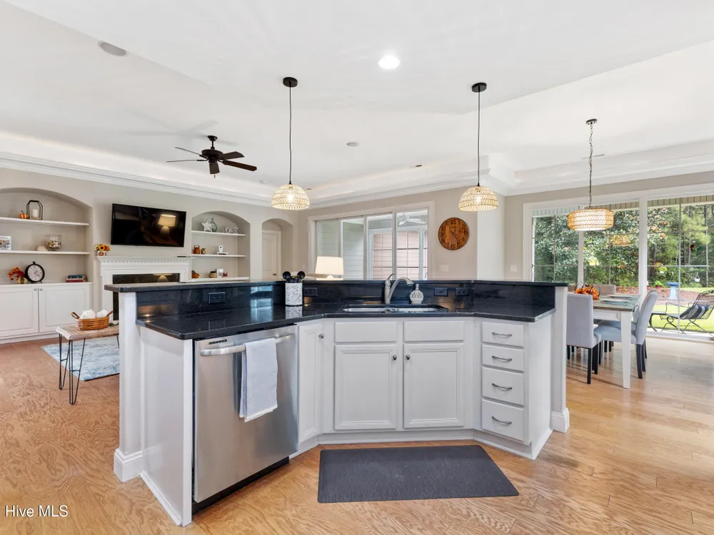 - Blinds/Shades, Tray Ceiling(s), Walk-In Closet(s), Walk-in Shower, Pantry, Entrance Foyer, Master Downstairs, Kitchen Island, High Ceilings, Gas Log, Ceiling Fan(s), Bookcases