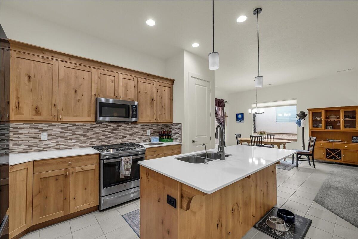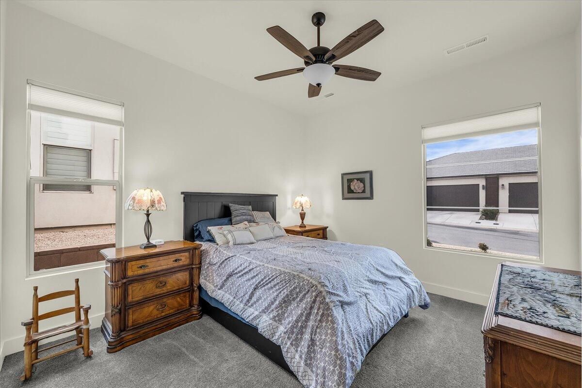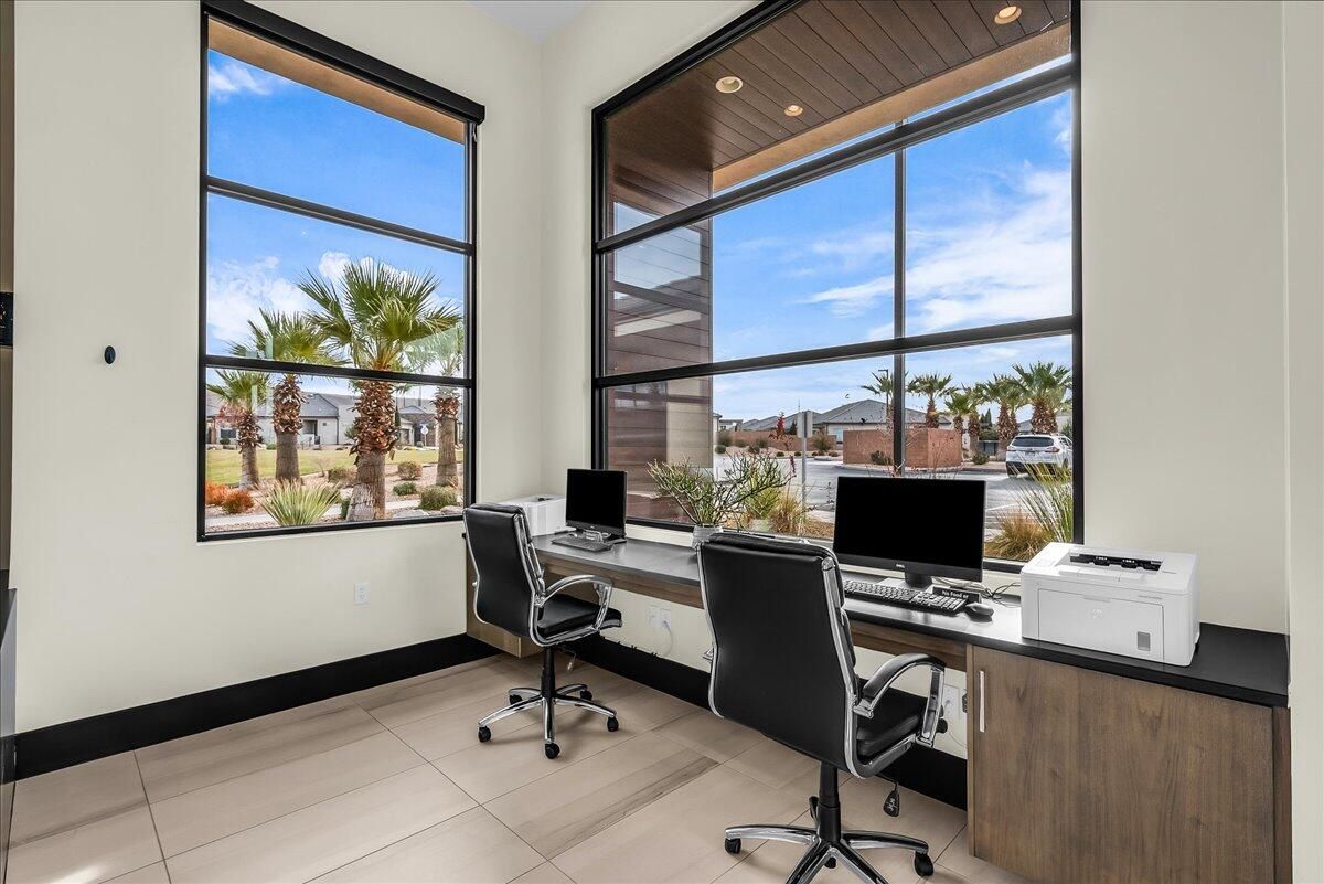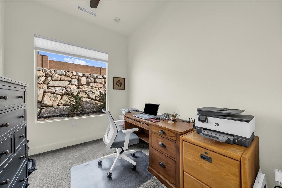 Discover the most popular twin home model in this 55+ community. The spacious 1,681 square foot floor plan offers energy efficiency, style, and comfort, and has been meticulously maintained by the seller. Work from home in the flex room that includes a solid wood desk with USB connections. Upgraded carpeting and all appliances included, as well as most of the furniture. Lots of storage in the garage with installed shelving and extra space in front of vehicles. Soft water system included. Laundry room has lots of cabinets for even more storage. Master bathroom has a walk-in shower, upgraded mirrors, and a solar tube for natural lighting during the day. Solar screens on the front windows regulate temperatures during the summer. Beautiful security screen door provides airflow during the day.