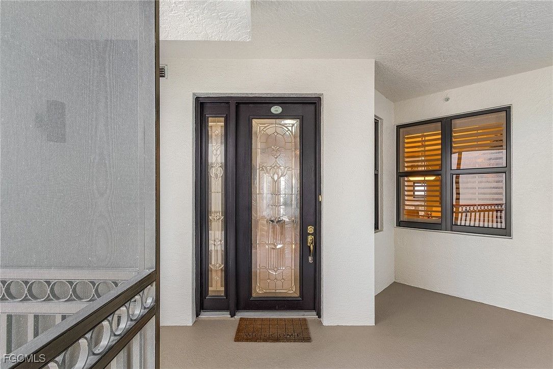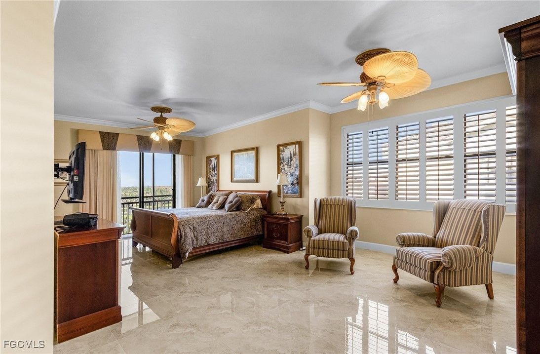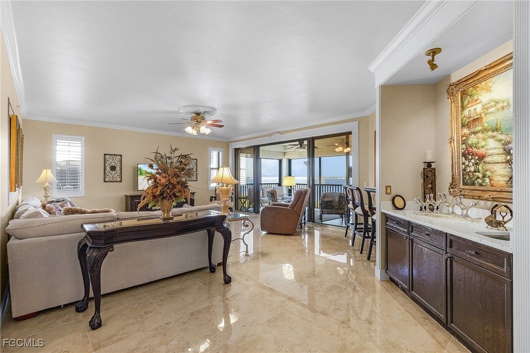 Welcome to 11620 Court Of Palms Unit 501, an exquisite residence in the prestigious Palmas del Sol community within Gulf Harbour Yacht & Country Club. This 5th-floor unit offers breathtaking panoramic views of the Caloosahatchee River and the meticulously maintained golf course. This Alhambra II floor plan spans approximately 2,555 square feet and features 3 bedrooms and 2.5 bathrooms. The spacious great room, complete with a wet bar, opens to a waterfront lanai, providing an ideal space for entertaining or relaxing while enjoying the serene vistas. The updated kitchen boasts white cabinetry, and stainless steel appliances, catering to both culinary enthusiasts and casual dining. Adjacent to the kitchen, the formal dining area and dinette offer picturesque river views. The master suite serves as a private retreat with a sitting area, a balcony overlooking the golf course, and an en-suite bathroom featuring a tub, shower, and walk-in closet. Additional highlights include diagonal tile flooring in living areas, tray ceilings, crown molding, solid core doors, electric storm shutters, and impact-resistant windows. Residents of Palmas del Sol enjoy access to a clubhouse with a pool and spa, and a deep-water marina with slips available for lease or purchase. Experience luxury waterfront living at its finest in this exceptional Fort Myers property.