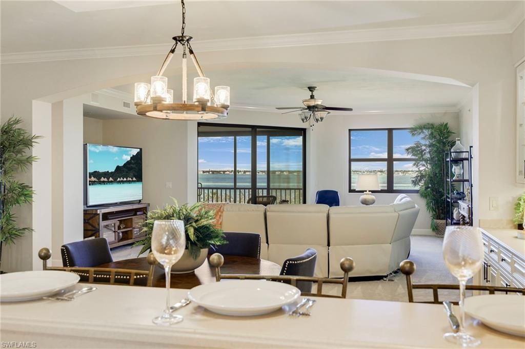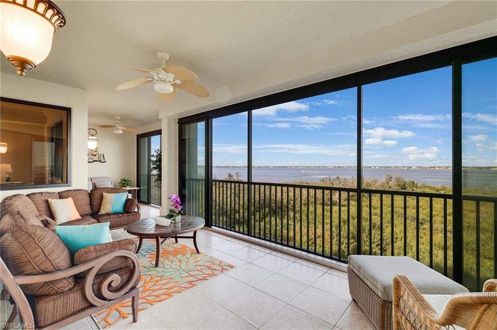 Welcome to Palmas Del Sol, one of the most desirable enclaves within Gulf Harbour Yacht & Country Club. This warm and inviting 2,526 sq.ft. Barcelona II residence offers 2 bedrooms plus a den, 2.5 baths, all framed by sweeping views of the Caloosahatchee River.Step inside to an open, thoughtfully designed layout ideal for both relaxed living and effortless entertaining. The kitchen features 42" white wood cabinetry, tranquil blue mosaic tile, premium stainless steel appliances, a center island with cooktop, and a separate pantry—combining style, function, and a touch of coastal charm. The spacious dining room is anchored by a custom wet bar with glass cabinetry and accent lighting, setting the stage for memorable dinners and evening gatherings.The living room flows seamlessly to the expansive enclosed terrace, where peaceful mornings and unforgettable sunsets unfold against the backdrop of the river. The primary suite offers a serene retreat with direct terrace access, a custom walk-in closet, an ensuite bath with dual vanities, a large walk-in shower with bench seating, and a jetted soaking tub. A comfortable guest bedroom and versatile den provide excellent flexibility for visitors, a home office, or creative pursuits.A standout feature of this residence is the private 2-car garage located directly beneath the building—an uncommon convenience in high-rise living that offers both security and ease.Additional updates include a new tile roof (2024), a 5-ton HVAC system (2019), and a 53-gallon water heater (2025).Protected by impact-resistant windows, this residence sustained no hurricane damage. Over the past 14 months, Palmas Del Sol has undergone an impressive $12M+ community-wide enhancement, including new exterior paint, a full roof replacement, and targeted stucco and moisture remediation—elevating both the beauty and long-term durability of the buildings.Within the gates of Gulf Harbour Yacht & Country Club, residents have the option to join a variety of world-class amenities, including golf, tennis, a deep-water marina, and a premier wellness center. The club is also in the midst of an extraordinary $19 million renovation, transforming the clubhouse with expanded indoor-outdoor dining and bar spaces, additional seating, and modern coastal-inspired architecture. The grand debut is planned for Fall 2026.This exceptional Palmas Del Sol residence seamlessly blends refined comfort, exclusivity, and stunning waterfront views within one of Fort Myers’ most prestigious communities.