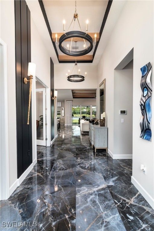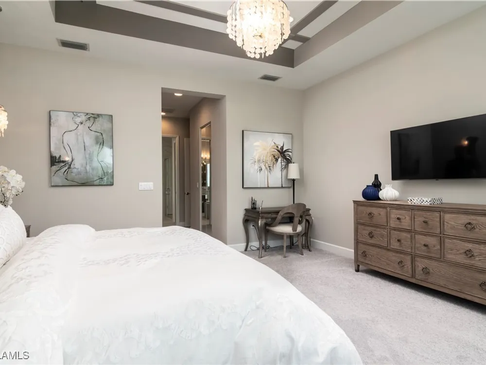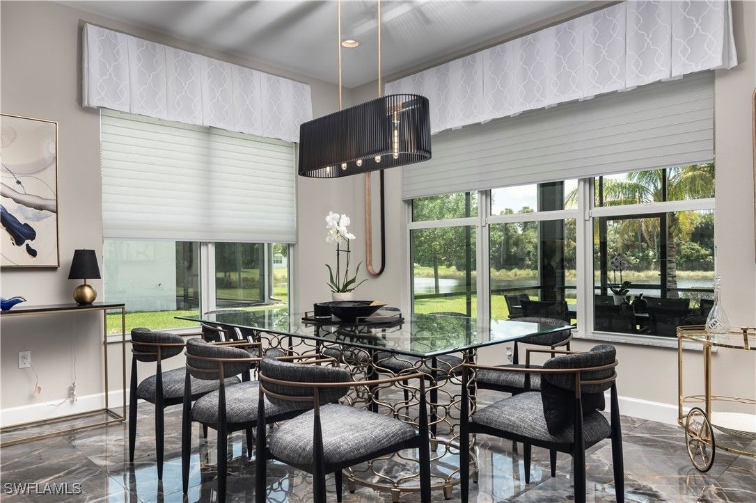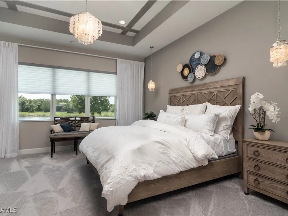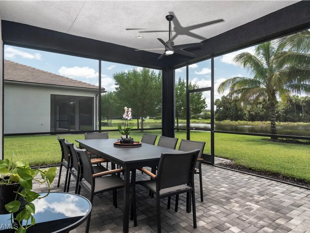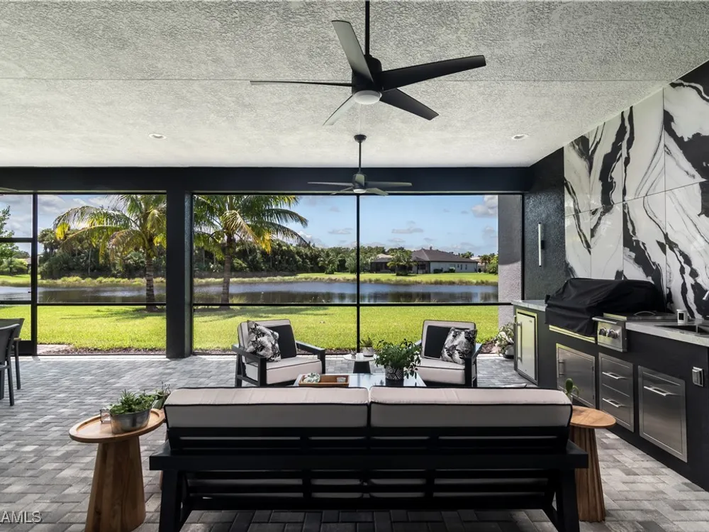 Stop and view the most beautiful Sunrise Home for sale in Valencia Trails - and it's the desired Southern Exposure! From the gorgeous oversized and private lake front lot to the stunning interior features and design - you will not be disappointed! Be ready to Move right in. Every possible upgrade and design feature has been tastefully incorporated in the home. Look at the photos and you will fall in love. Walk into the 14-foot-high foyer with custom designed wall treatment and wood beams and wagon wheel chandeliers and follow into the open concept kitchen and living area where you will find 24 x 48 Porcelain tile flooring for a luxury look. The chef's kitchen has been remodeled to add all upgraded GE Cafe appliances and an additional double wall oven and built-in wine cooler . Cooking is with Gas! Upgraded White Cabinetry with roll out pantry drawers and custom hardware. Backsplash is a spectacular showstopper in black and white marble, and the outdoor kitchen matches this perfectly. The huge kitchen island is the heart of the kitchen. The great room has built-in cabinetry to match and Custom wood ceiling beams to top off the design. All the rooms have designer drapes, valances, and silhouette shades. Walking through the rest of this beautiful home you will find the same custom built-ins, designer window treatments, lighting fixtures and accent walls and ceilings. The three-car garage has additional shelving and epoxy flooring. You will see that no detail has been spared. When you walk out to the oversized rear screened patio you will find a full kitchen for cooking and barbecuing for your next party as well as comfortable lounging and dining areas. The lot is large enough to add a private swimming pool and spa. And what a peaceful and private view! Don't miss out on this beautiful home. This home is a must see! Valencia Trails is the pinnacle of 55+ living. This beautifully landscaped community features World Class Amenities which include; Wide Walking and Biking Paths, a Dog Park, Many Pickle Ball and Tennis Courts, a beautifully appointed 43,000 square foot Clubhouse with a Full Service Restaurant and Bar, Resort Style Pools, Fitness Center, Spa and Beauty Salon, Craft and Card Rooms, a Theater Room which hosts Fabulous Concerts and Shows, and too many clubs and classes to mention! Come and explore this vibrant, active community today