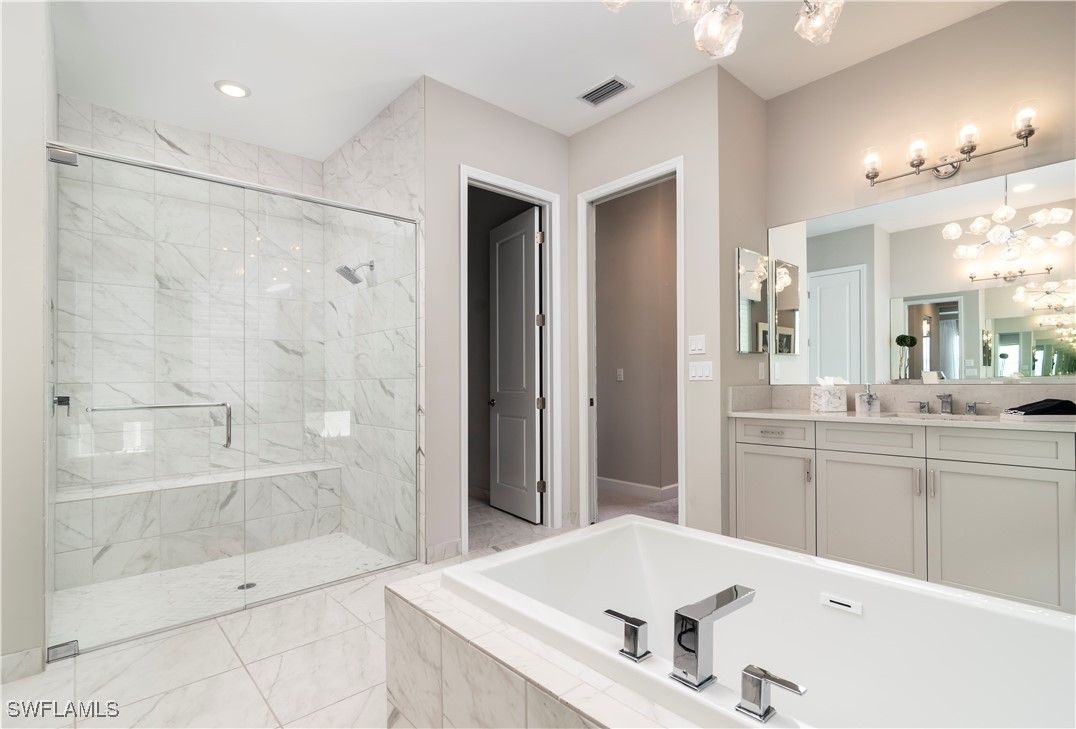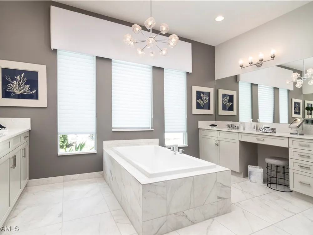 - Breakfast Bar, Built-in Features, Bedroom on Main Level, Bathtub, Closet Cabinetry, Coffered Ceiling(s), Dual Sinks, Entrance Foyer, Family/Dining Room, Jetted Tub, Kitchen Island, Living/Dining Room, Multiple Shower Heads, Custom Mirrors, Main Level Primary, Pantry, Split Bedrooms, Separate Shower, Cable TV, Walk-In Closet(s), Window Treatments