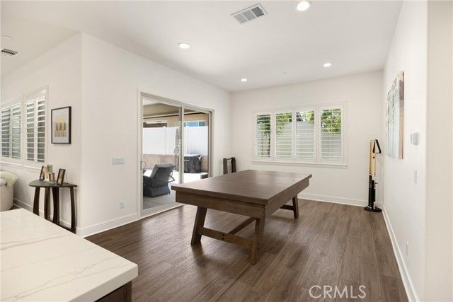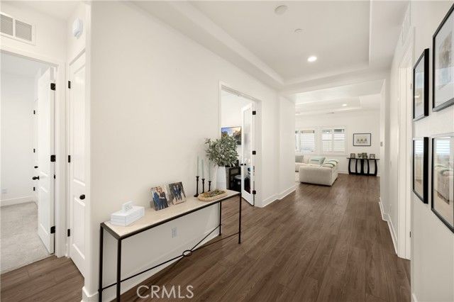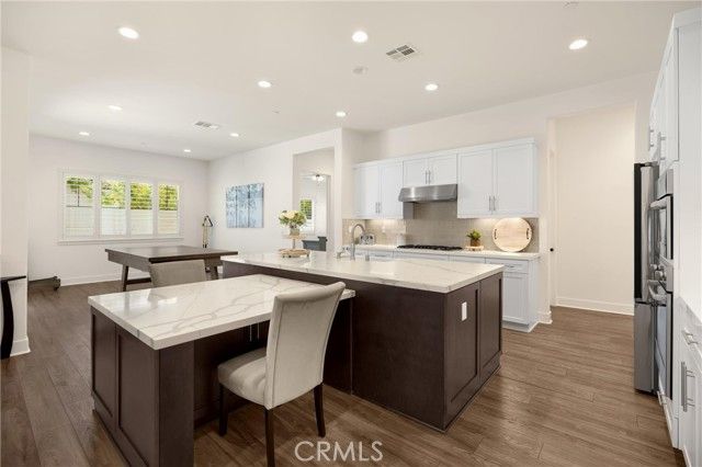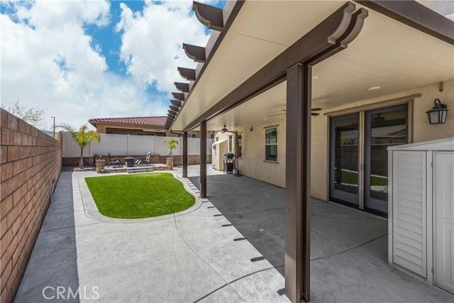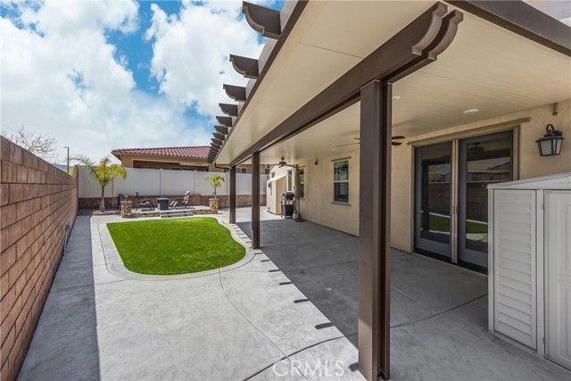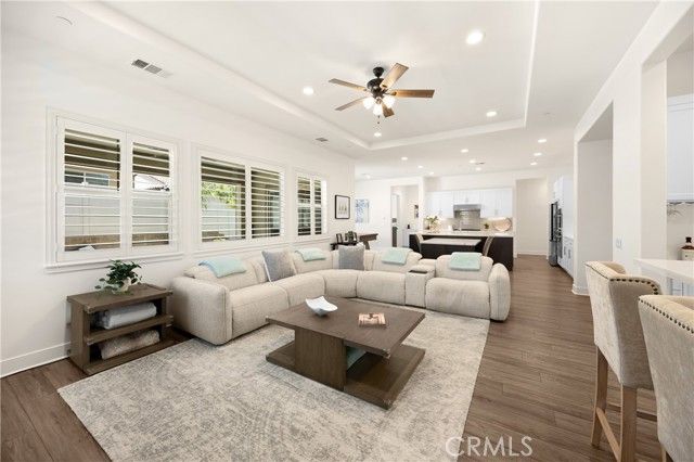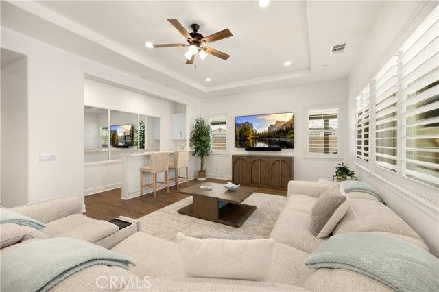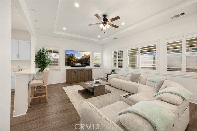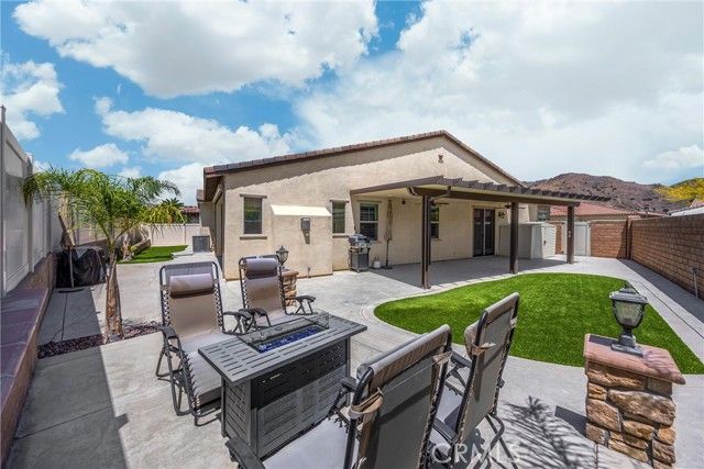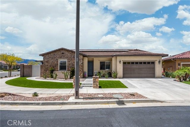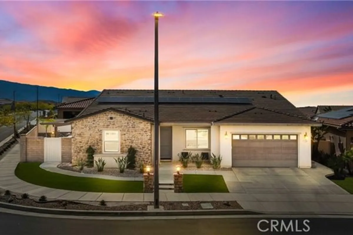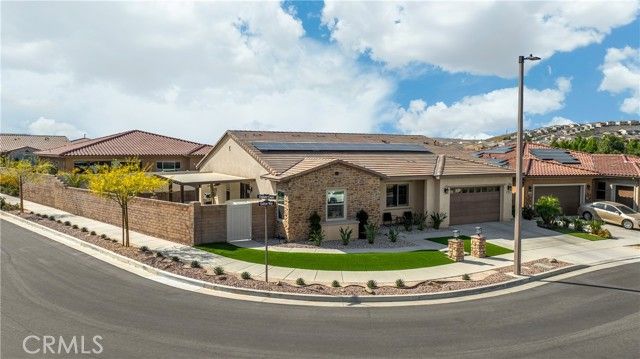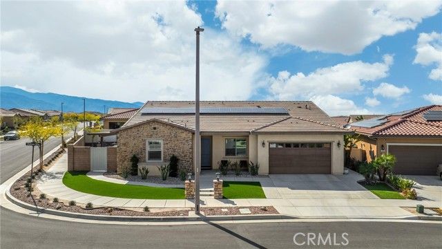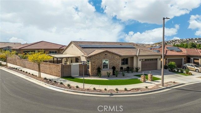 Welcome home to 11638 Oakton Way, a stunning single-story corner lot home nestled in Corona’s premier 55+ gated community of Terramor, where the views are unmatched, and the lifestyle is second to none. This meticulously maintained home feels brand new and offers a perfect blend of luxury, comfort, and entertainment.Step inside and fall in love with the open concept floor plan featuring 3 spacious bedrooms, each with its own private en suite bathroom, a powder bath for guests, and a versatile flex room with glass doors, ideal for an office, craft room, or game space. The chef’s kitchen is the heart of the home, complete with quartz countertops, sleek white thermofoil cabinetry, built in stainless steel appliances, a walk in pantry, gorgeous blue tile backsplash, and a massive island with an extended table height breakfast bar, perfect for morning coffee or entertaining guests. Adjacent to the kitchen is a dining area that’s large enough for a formal table, or even a pool table! Add in the custom full-size bar with a wet bar sink, beverage fridge, and barstool peninsula, and this home becomes an entertainer’s dream.Seamlessly transition to indoor-outdoor living in the beautifully designed California room, complete with electric fireplace, ceiling fans, TV hookup, and a motorized floor to ceiling sunscreen for year-round enjoyment. The backyard offers breathtaking mountain views, stamped concrete, a second covered patio, low-maintenance landscaping, and even a storage shed. Throughout the home, you’ll find luxury wood vinyl plank flooring, soaring 10’ ceilings, and elegant plantation shutters. The spacious primary suite includes a spa-like en suite bathroom with an oversized walk-in shower, dual vanities, and a huge walk-in closet. Additional features include a 13 panel Sunrun solar system, drought tolerant landscaping with turf, whole house water softener, and a 2-car garage with 220V- perfect for electric vehicles. Living in Terramor is more than just owning a home, it’s an experience. Residents enjoy resort style amenities including three pools (one adult-only), spa, gym, sauna, tennis and pickleball courts, bocce ball, dog parks, scenic walking trails, a clubhouse, outdoor cooking spaces, and even a full bar and event room. All just minutes from the 15 freeway for easy access to everything. This is more than a home, this is your next chapter in luxury living.