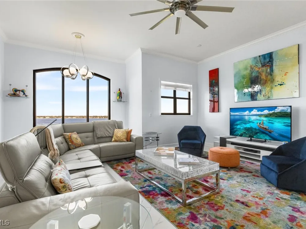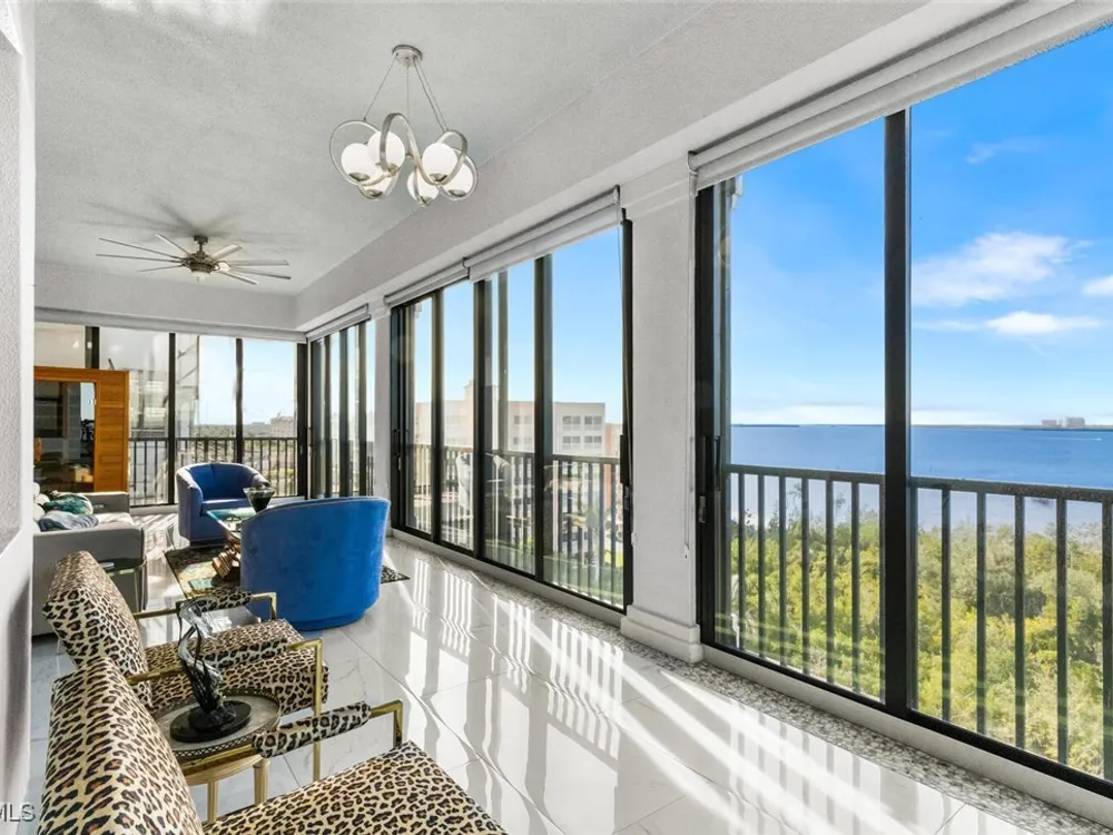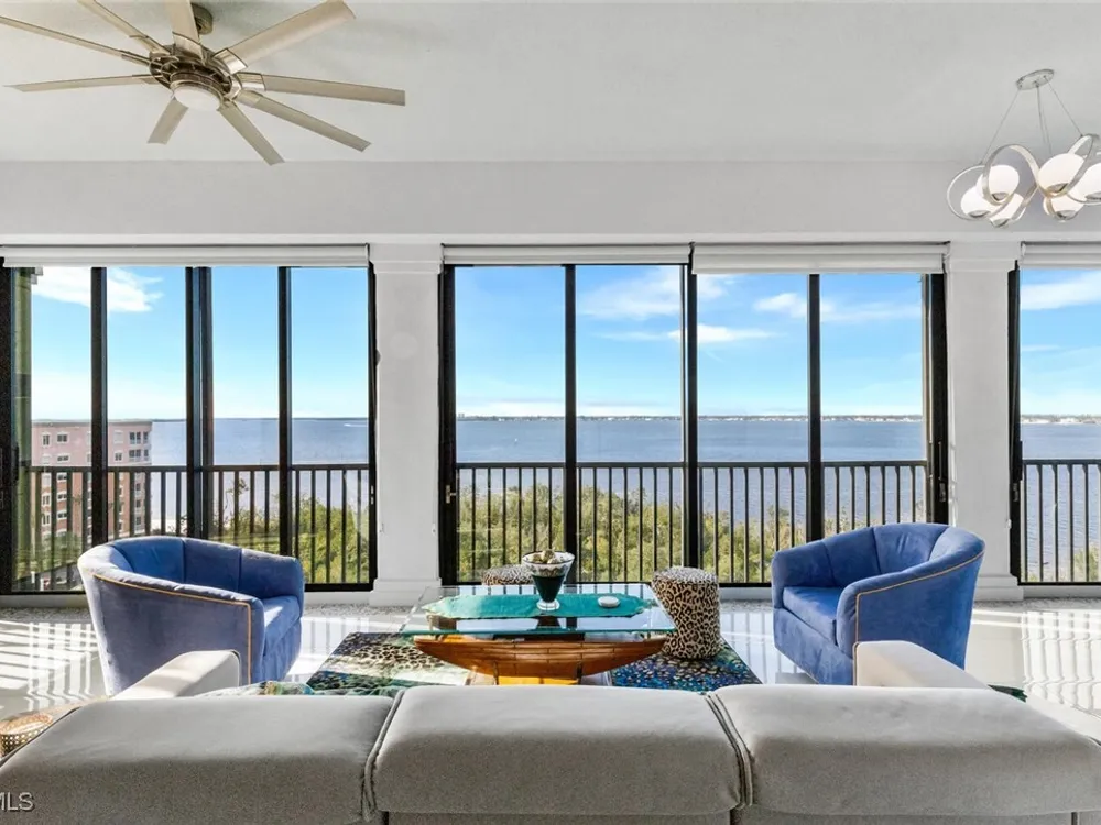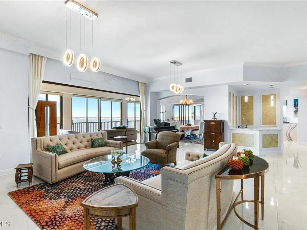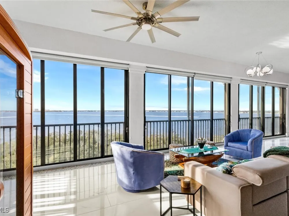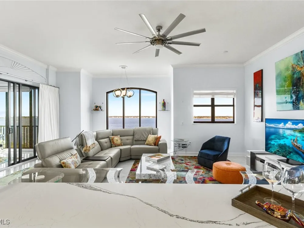 Welcome to this spectacular 8th-floor penthouse in Palmas Del Sol, located within the prestigious Gulf Harbour Yacht & Country Club. Offering a total of 4,421 square feet, this turnkey furnished property is the epitome of sophistication and comfort. This meticulously designed penthouse features 3 spacious bedrooms and 3.5 beautifully appointed bathrooms, each bedroom with its own ensuite bathroom. The grand master suite includes an expansive 420-square-foot private, open-air patio, providing the perfect space for relaxation. The ensuite bathroom is a serene retreat, complete with a jetted tub, large shower, dual sinks, and two walk-in closets. The gourmet kitchen is a chef’s dream, outfitted with top-of-the-line GE Monogram appliances, including a 48-inch Subzero refrigerator, double wall oven, induction cooktop, and microwave. A KitchenAid dishwasher and 48-bottle wine fridge ensure every convenience is at your fingertips. The kitchen flows seamlessly into the wet bar area, perfect for entertaining guests. Adjacent to the kitchen, a formal dining room offers an elegant space for hosting memorable dinners. The 700-square-foot lanai has been thoughtfully converted into additional living space, offering panoramic views of the Caloosahatchee River from every room. The residence features stunning 48-inch floor tiles, adding a touch of elegance to the expansive living areas. This property also includes a two-car garage conveniently located under the building, ensuring secure and private parking. Residents of Palmas Del Sol enjoy exclusive amenities separate from the Gulf Harbour Yacht & Country Club offerings. These include a resort-style pool and spa, a clubhouse with billiards, a meeting room, a kitchenette, a big-screen TV, and a BBQ area, providing everything needed for a vibrant and social lifestyle. Gulf Harbour Yacht & Country Club offers the ultimate in luxury living with access to world-class amenities, including a private marina, championship golf course, fitness center, and dining options. With its prime location, breathtaking views, and unmatched amenities, this penthouse is a true gem in one of the most sought-after communities in Southwest Florida.