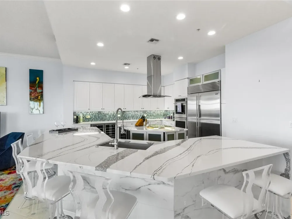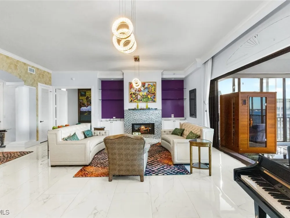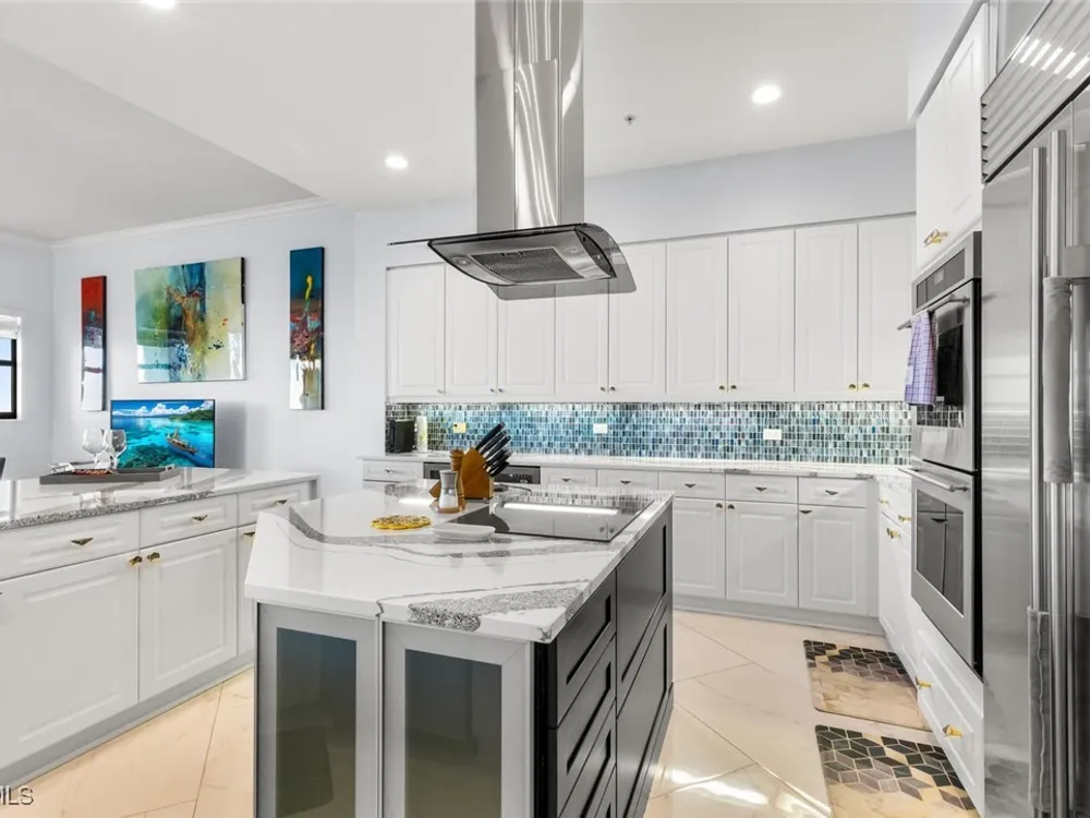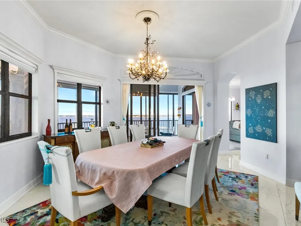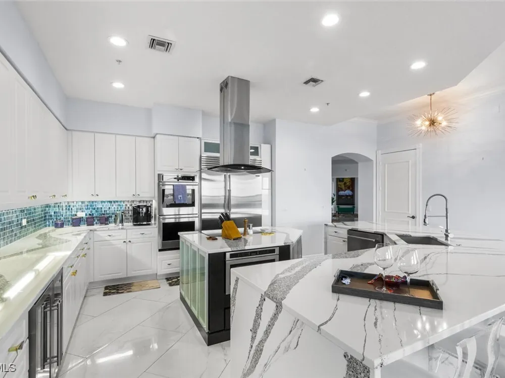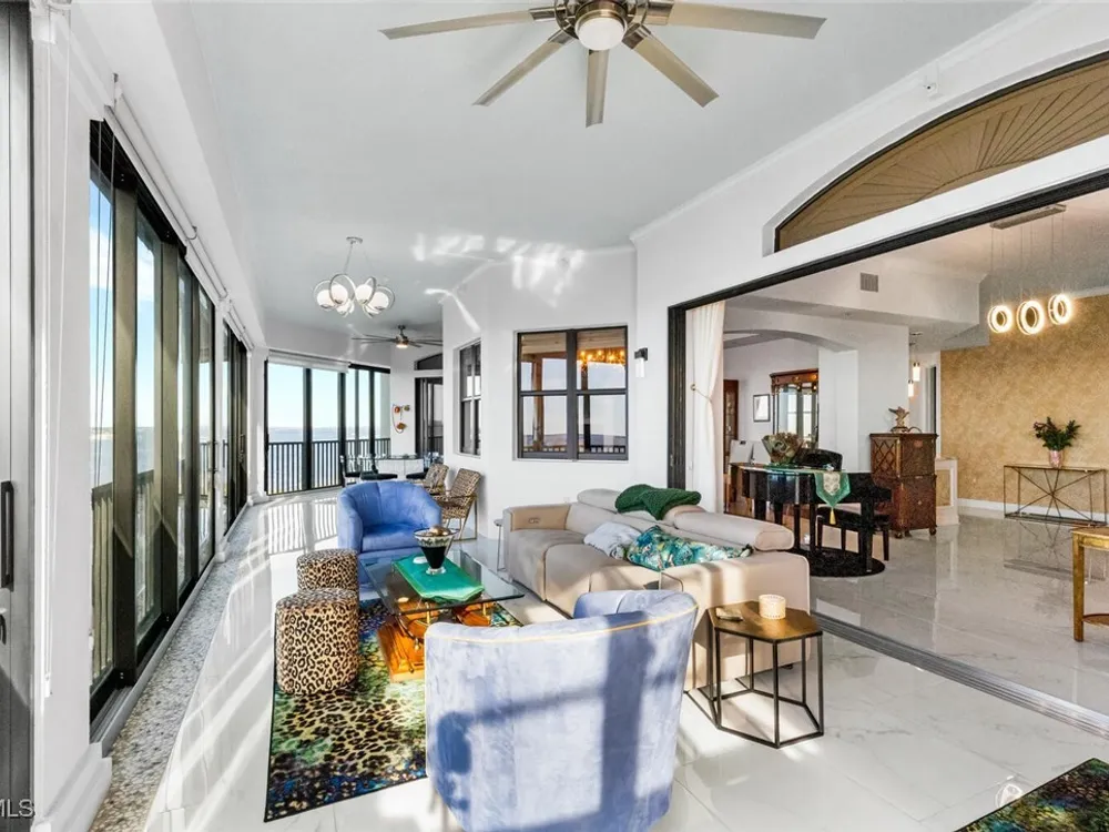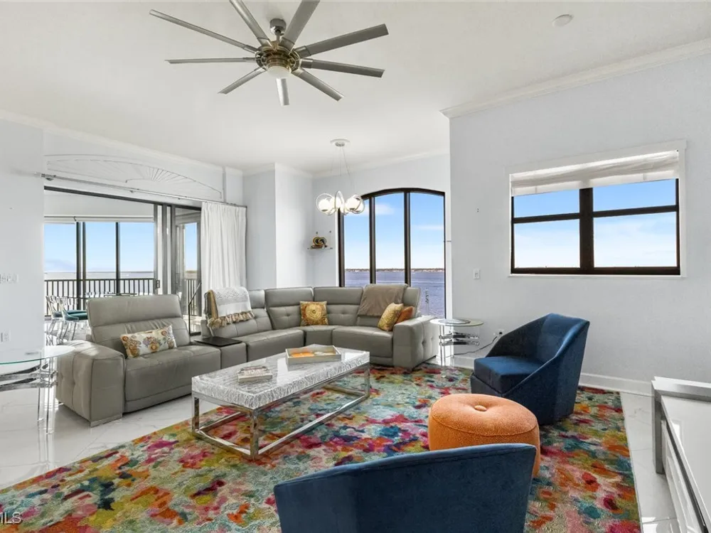 Welcome to this spectacular 8th-floor penthouse in Palmas Del Sol, located within the prestigious Gulf Harbour Yacht & Country Club. Offering a total of 4,421 square feet, this turnkey furnished property is the epitome of sophistication and comfort. This meticulously designed penthouse features 3 spacious bedrooms and 3.5 beautifully appointed bathrooms, each bedroom with its own ensuite bathroom. The grand master suite includes an expansive 420-square-foot private, open-air patio, providing the perfect space for relaxation. The ensuite bathroom is a serene retreat, complete with a jetted tub, large shower, dual sinks, and two walk-in closets. The gourmet kitchen is a chef’s dream, outfitted with top-of-the-line GE Monogram appliances, including a 48-inch Subzero refrigerator, double wall oven, induction cooktop, and microwave. A KitchenAid dishwasher and 48-bottle wine fridge ensure every convenience is at your fingertips. The kitchen flows seamlessly into the wet bar area, perfect for entertaining guests. Adjacent to the kitchen, a formal dining room offers an elegant space for hosting memorable dinners. The 700-square-foot lanai has been thoughtfully converted into additional living space, offering panoramic views of the Caloosahatchee River from every room. The residence features stunning 48-inch floor tiles, adding a touch of elegance to the expansive living areas. This property also includes a two-car garage conveniently located under the building, ensuring secure and private parking. Residents of Palmas Del Sol enjoy exclusive amenities separate from the Gulf Harbour Yacht & Country Club offerings. These include a resort-style pool and spa, a clubhouse with billiards, a meeting room, a kitchenette, a big-screen TV, and a BBQ area, providing everything needed for a vibrant and social lifestyle. Gulf Harbour Yacht & Country Club offers the ultimate in luxury living with access to world-class amenities, including a private marina, championship golf course, fitness center, and dining options. With its prime location, breathtaking views, and unmatched amenities, this penthouse is a true gem in one of the most sought-after communities in Southwest Florida.