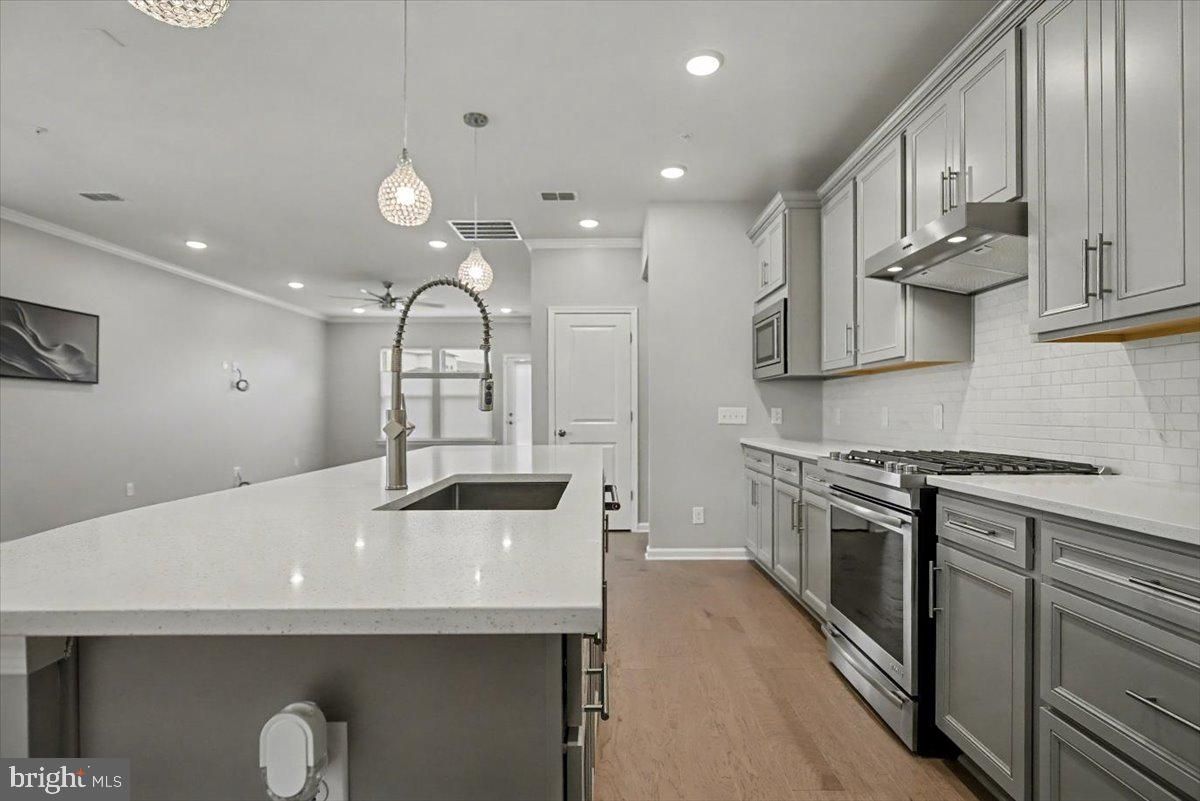 - Crown Moldings, Dining Area, Entry Level Bedroom, Floor Plan - Open, Kitchen - Gourmet, Kitchen - Island, Pantry, Recessed Lighting, Sprinkler System, Walk-in Closet(s), Window Treatments, Wood Floors