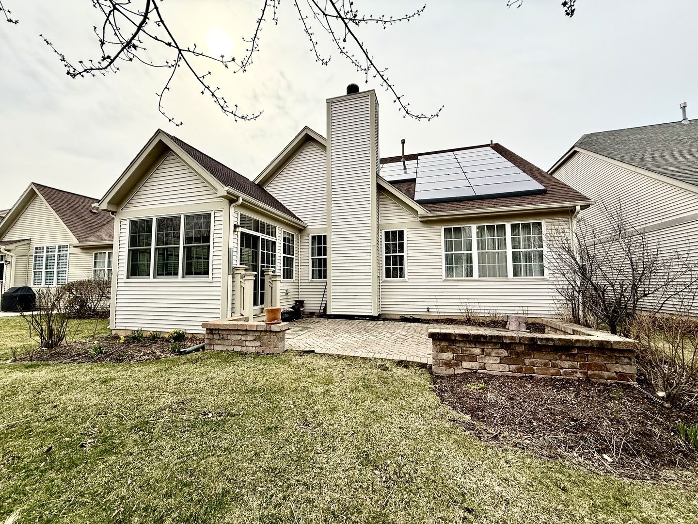 Experience maintenance-free living at its finest in this spectacular, fully renovated home located in desirable Stonegate West. Every detail has been thoughtfully updated to blend modern luxury with timeless comfort. The show-stopping gourmet kitchen is completely new and designed to impress, featuring high-end custom cabinetry, upgraded quartz countertops, a designer backsplash, and an expansive 7-foot island-perfect for casual dining and entertaining. The inviting Family Room showcases a striking stone fireplace with gas logs, creating a warm and elegant focal point. Just beyond, the beautiful Sunroom offers three walls of windows, flooding the space with natural light and providing the perfect place to relax year-round. Rich new hardwood flooring flows throughout the main level, which also includes a convenient first-floor Primary Suite with a luxurious spa-inspired Bath, complete with an oversize shower and new quartz countertops on the double sink vanity. An Office or Den on the main floor offers flexible space for work or quiet retreat. It is easy to expand the Dining area to whatever size of gathering you are hosting. Conveniently located adjacent to the Sunroom. High soaring ceilings in almost every room. 2 spacious Bedrooms offer generous walk-in closets and a well-appointed Hall Bath. The impressive 1,300 sq ft finished basement expands your living space even further, featuring a 4th Bedroom, 3rd full Bath, a large Recreation Room, Game Room and a dedicated Workshop. Step outside to enjoy the beautifully designed brick patio, a perfect outdoor oasis for entertaining, grilling, or simply unwinding. All windows in the sunroom area our new Anderson Windows. The front door system with side lights are Anderson and were replaced in 2024. Hvac, hot water heater, humidifier were all replaced in 2024. The owner purchased solar panels that have been installed on the roof and will be transferred to the new owner and included in the sale. This exceptional home truly has it all-Style, Space, and Sophistication in a prime location.