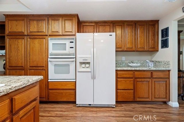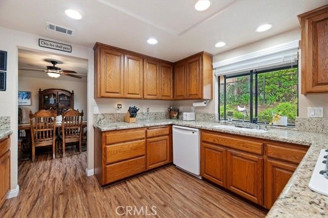 Discover the comfort and convenience of 55+ living in this beautiful gated community. This well-situated home offers picturesque views and a peaceful backyard with no rear neighbors. Featuring 3 oversized bedrooms and 2.5 bathrooms, the home includes a cozy family room with a fireplace, a formal dining room, and an elegant kitchen with granite countertops, oak cabinetry, and an additional dining area. The spacious primary suite boasts a walk-in closet and an en-suite bathroom with dual sinks, a tile vanity, and a walk-in shower. A convenient powder room is located just down the hall for guests, while the secondary bathroom features a tub and tile vanity. Laminate flooring flows throughout the home, with tile in the bathrooms. Additional highlights include direct garage access, laundry located in the garage, and guest parking conveniently located directly across from the home. Enjoy the lushly landscaped front and backyard, complete with fruit trees, fenced yard for privacy and pet safety, and walkways throughout the outdoor space. The community offers an impressive array of amenities, including a swimming pool, hiking trails, tennis courts, pickleball, clubhouse, and RV storage. Come experience this amazing community for yourself—you’ll quickly see why this is the perfect place to call home.