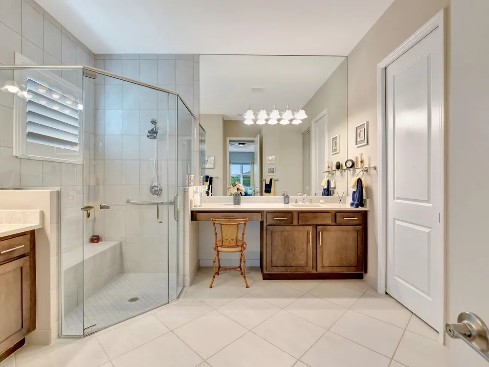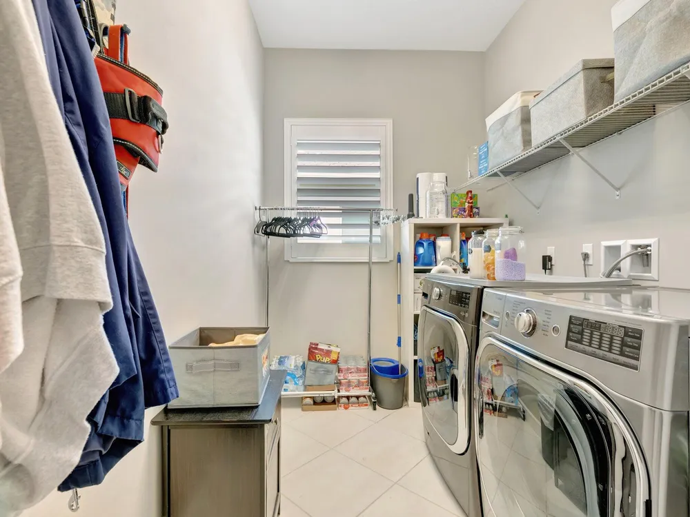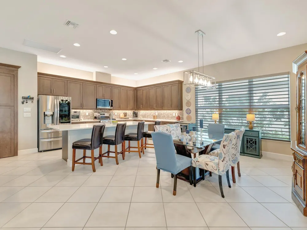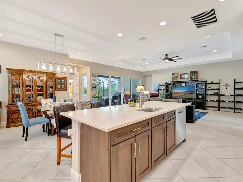- Built-in Shelving, Closet Cabinetry, Entrance Foyer, Kitchen Island, Pantry, High Ceilings, Walk-In Closet(s), Cabana Bath, Home Office, Family Room, Great Room, Breakfast Area, Living/Dining Room, Kitchen/Dining Combo, Double Hung Metal Window(s), Impact Glass, Dual Sinks, Primary Downstairs, Separate Shower