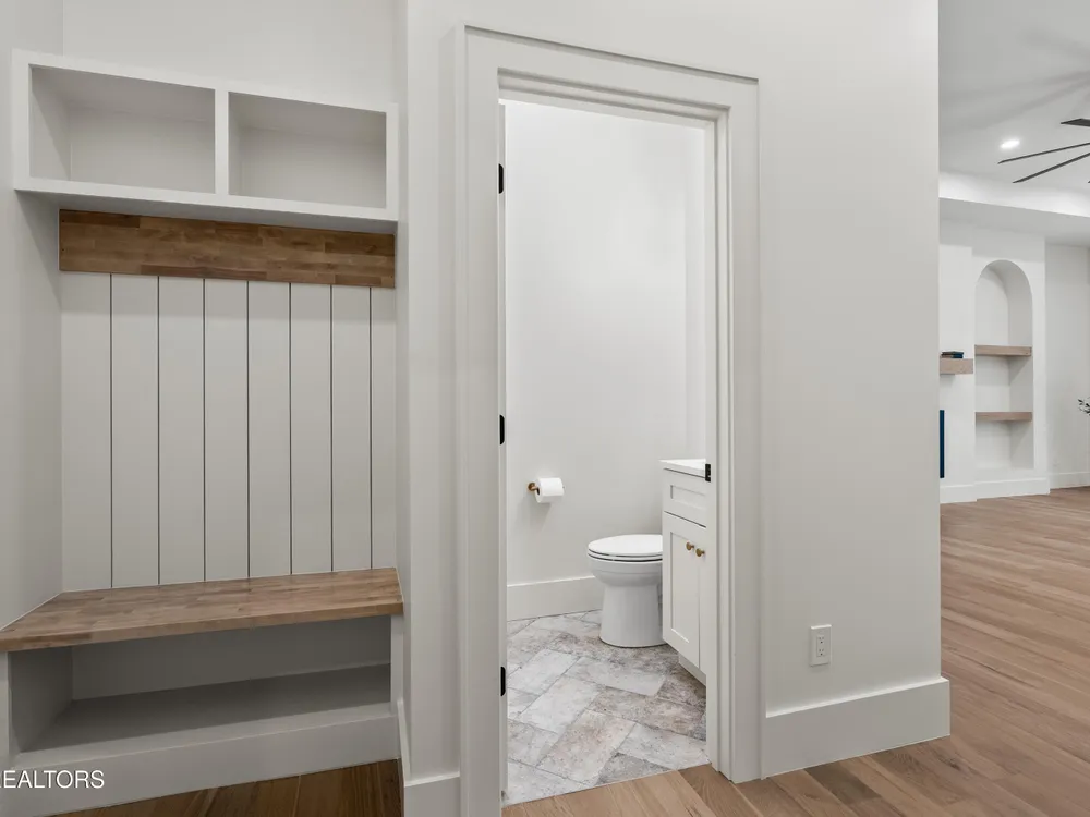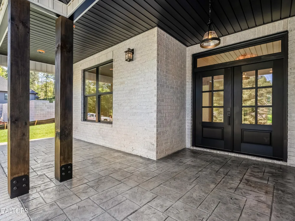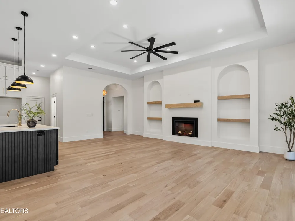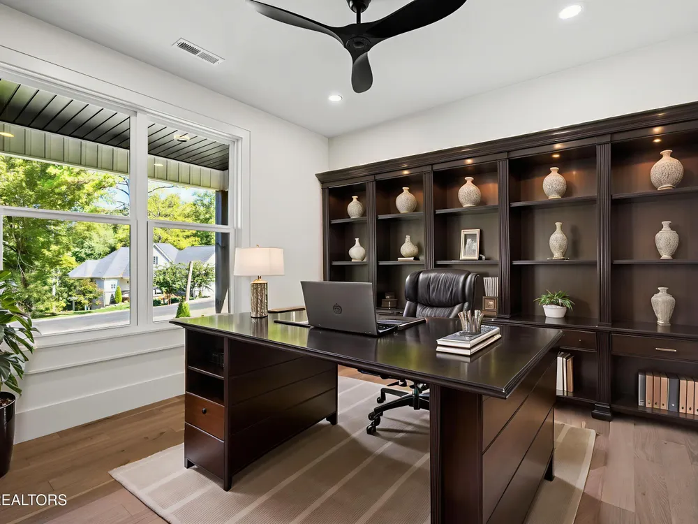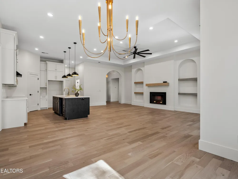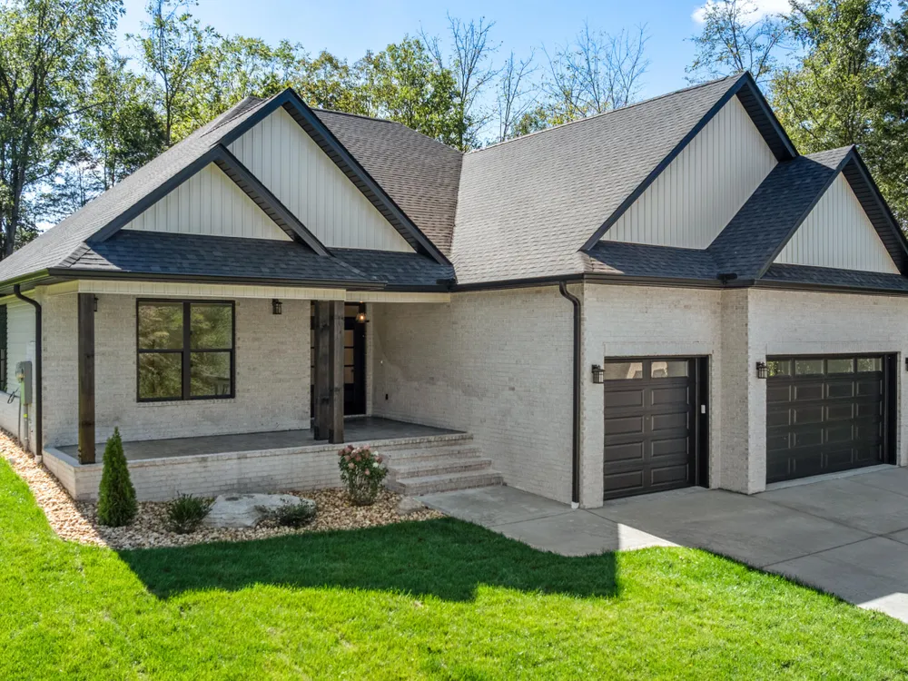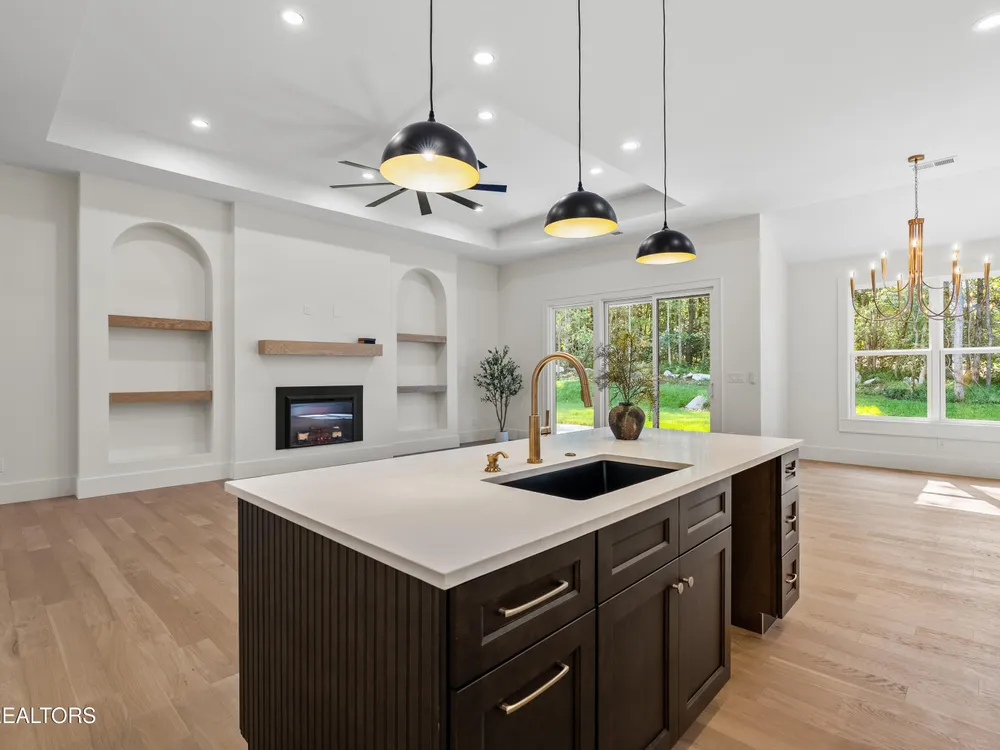 Experience the ultimate in new construction - stylish, striking, and completely move-in ready - with peaceful water views from your front porch or private office! Perfectly situated in Mialaquo Coves on a low-maintenance, mostly flat lot, this 3-bedroom + office, 2.5-bath home features brick and board & batten siding on the front with vinyl and a brick foundation wrapping the rest. Step onto the large stamped front porch with decorative posts, and through double fiberglass doors into a bright, open floor plan. A welcoming foyer with chandelier and graceful arch leads to the living room, where a stunning electric fireplace with built-in arched shelves is framed by an almost 12-foot tray ceiling and warm engineered hardwood floors. Gourmet kitchen includes a large wood-accent island, SS appliances, black hood, built-in microwave, pot filler, under-cabinet lighting, quartz backsplash, and a walk-in pantry. A butler's pantry offers added storage with cabinetry, wine rack, and beverage cooler. Cozy dining area accented by a beautiful chandelier. Spacious primary suite boasts tray ceiling and spa-like bath with double vanities, expansive mirror, extra linen shelving, soaking tub with accent wall, and a curbless walk-in shower with rain head, handheld sprayer, and bench + a custom walk-in closet. Built-in accent shelving in the office with water views. Guest and powder baths showcase custom tile work. A large laundry room with cabinetry and a drop zone adds everyday convenience. Outdoor living shines with a stamped, covered deck overlooking common property, plus side concrete pads for grilling. The yard is professionally landscaped with irrigation. Designed for modern living, this home blends comfort with true elegance. Don't miss your chance; schedule your showing today! Buyer to reimburse Seller at closing the one-time Loudon County Impact tax $1.00 per finished sq.