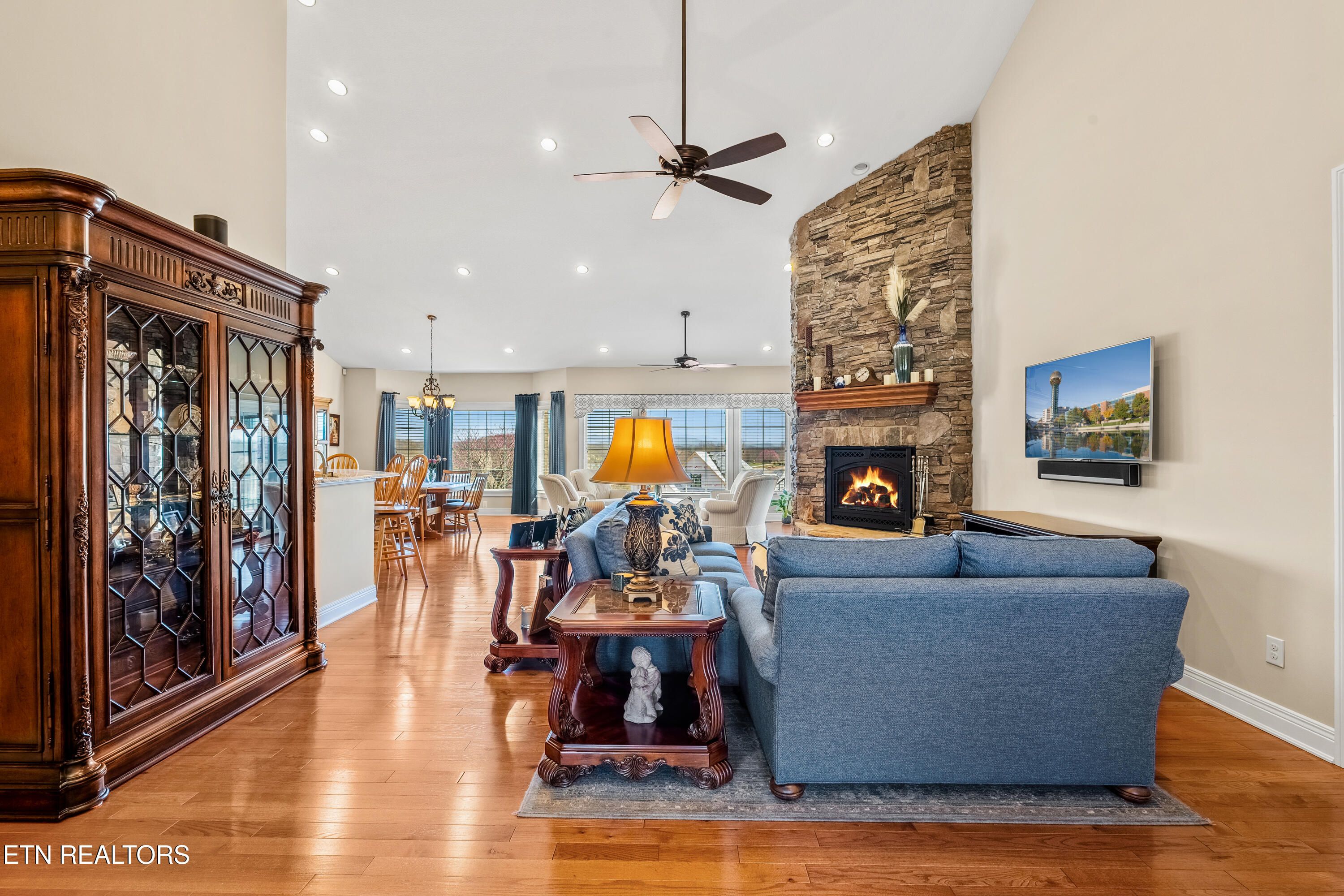 Luxury Living with Unmatched Views in Rarity Bay! The interior has been freshly updated with neutral paint & trim painted. Discover the perfect blend of elegance, functionality, and scenery in this meticulously maintained 3,064 sq. ft. home, built in 2014. Nestled on a beautifully landscaped homesite, this residence offers views of the mountains, lake, and golf course. Stunning Exterior & Thoughtful Upgrades With a stately brick and stone exterior, this home radiates curb appeal. The oversized 878 sq. ft. two-and-a-half-car garage is a standout, featuring epoxy flooring, a built-in workshop with cabinets, ample storage, and a dedicated electrical circuit panel for a remote generator. The professionally landscaped yard boasts river stone beds, low-voltage uplighting, and a fully remote-controlled irrigation system. Refined Interior with High-End Finishes Step inside to an open floor plan with soaring cathedral ceilings, hardwood floors, and an impressive floor-to-ceiling stone fireplace with a gas insert in the great room. The kitchen is a chef's dream, featuring: -Gas cooktop burners -Double electric ovens -Blanco double sink & additional Blanco vegetable sink on the island -Under-counter lighting & granite countertops The primary suite is a true retreat with tray ceilings, a custom-built closet, and a spa-like en-suite bath. A versatile room on the main level can serve as an office or formal dining space. Upstairs, a multi-functional suite—ideal as a fourth bedroom, media room, or in-law suite—includes a mini kitchen and full bath. Unparalleled Comfort & Efficiency -Three-zone Carrier Infinity HVAC with natural gas backup. -Rinnai tankless water heater with circulating instant hot water -Built-in security system with burglar/fire alarm and remote callout -Conditioned, lighted crawl space for additional storage Outdoor Living at Its Finest Enjoy the views from the 150 sq. ft. three-season room, screens, and shades—perfect for year-round enjoyment. This exceptional home combines timeless design, top-tier craftsmanship, and a prime location. Don't miss your chance to experience luxury living in Rarity Bay—schedule your private tour today!
