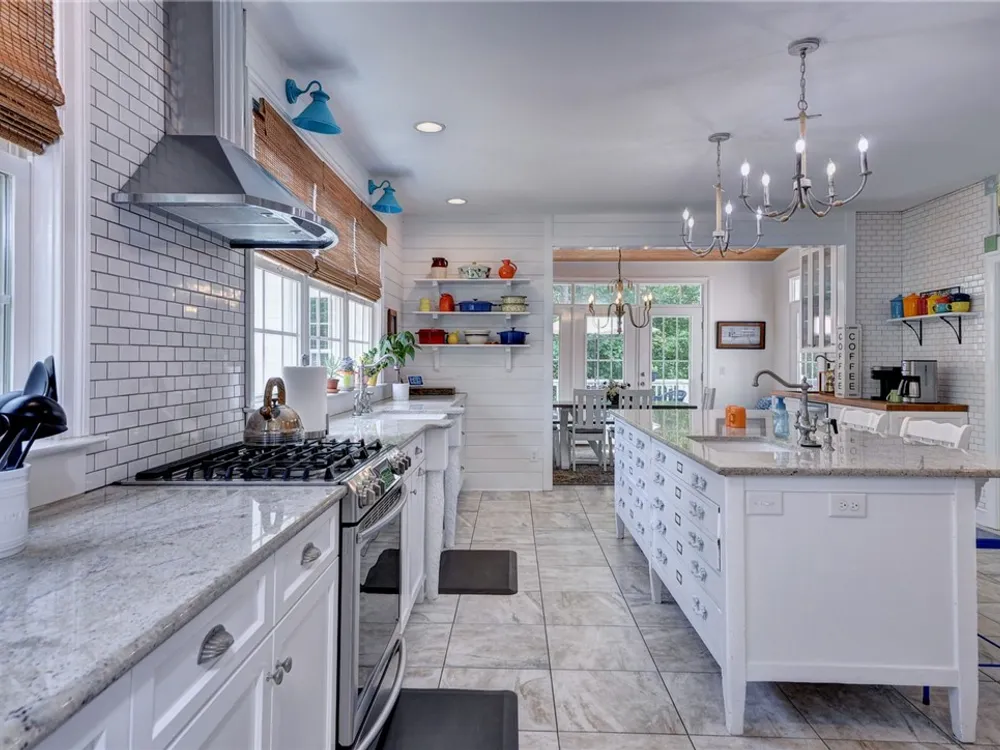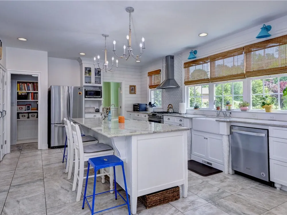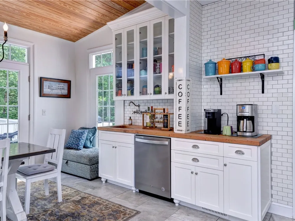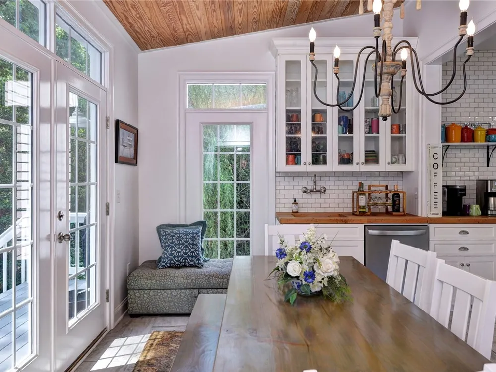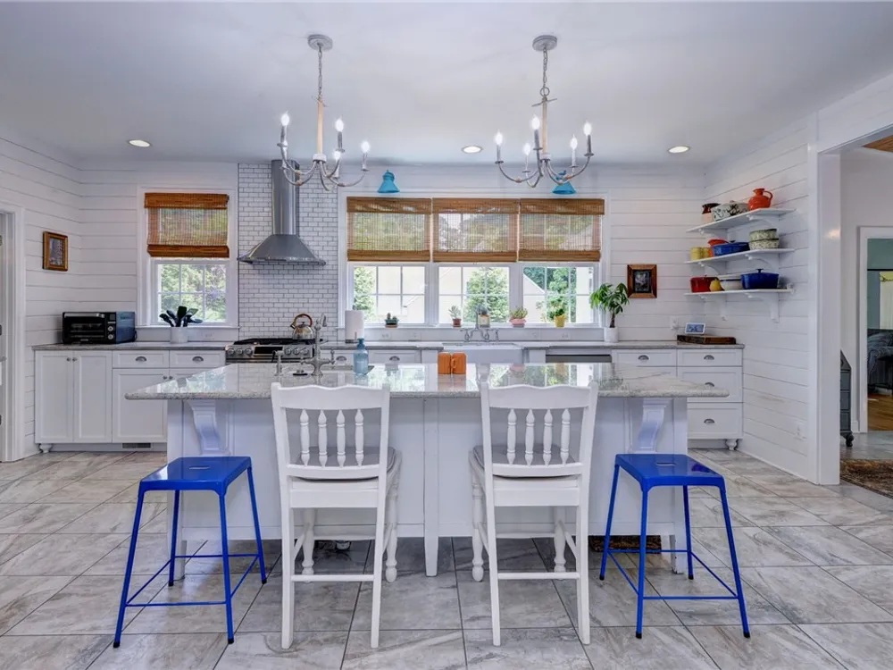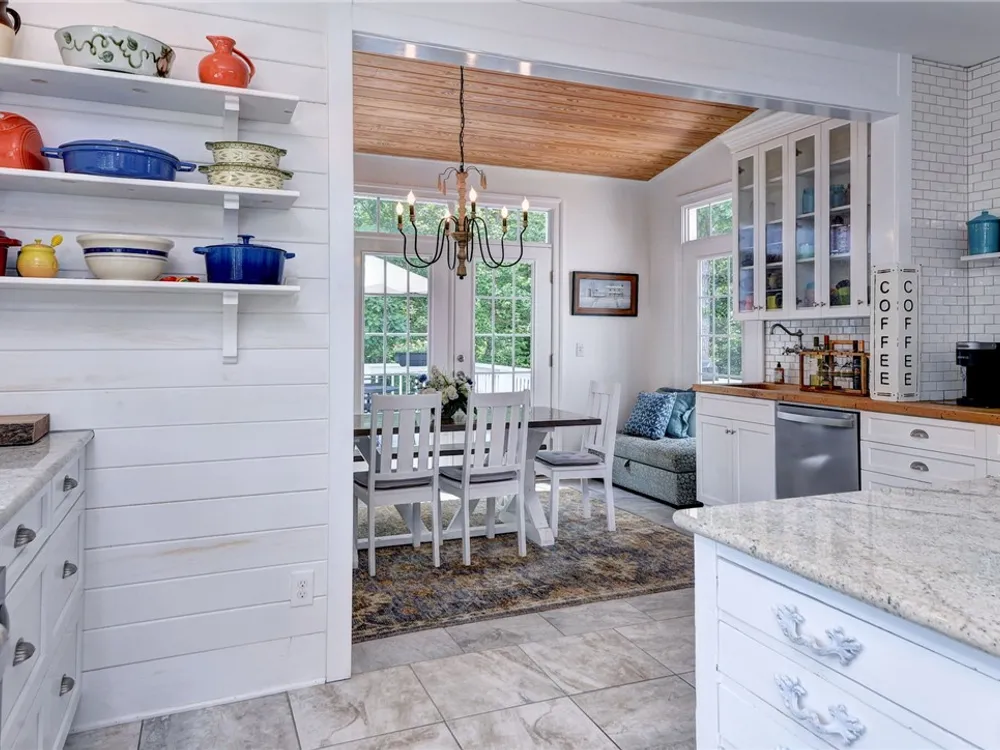 Welcome to your dream farmhouse—where timeless charm meets modern luxury. This one-of-a-kind home is bursting with character, from stained glass transoms and rich wood floors to shiplap walls and stunning chandeliers that light up every corner with personality. A jaw-dropping kitchen designed to impress. Centered around a custom island crafted from a 1920s map chest and featuring a conversation-starting bowling alley countertop at the coffee/bar station, it's a chef’s paradise with three sinks, two dishwashers, two refrigerators, tiled walls, and multiple pantries. With five bedrooms and multiple en-suites, the layout is perfect for multigenerational living or hosting guests in style. Both levels feature private suites—downstairs has its own laundry, while upstairs boasts a spa-like retreat with a soaking tub and cathedral ceiling with exposed beams. A 4-car garage and finished basement adds even more space, and the outdoor deck offers serene wooded views on a .43-acre lot. Charm, comfort, and character—all in one unforgettable home.