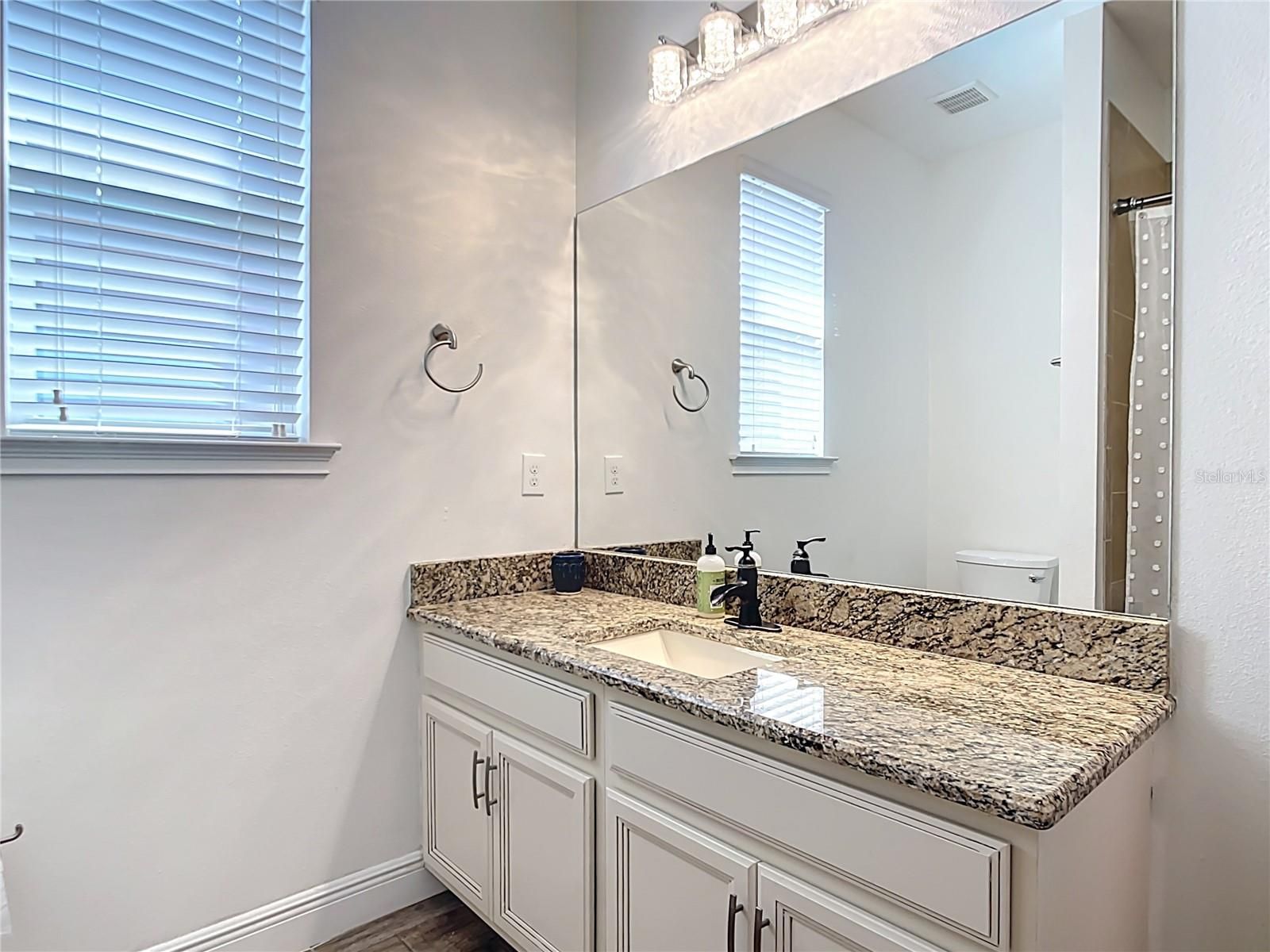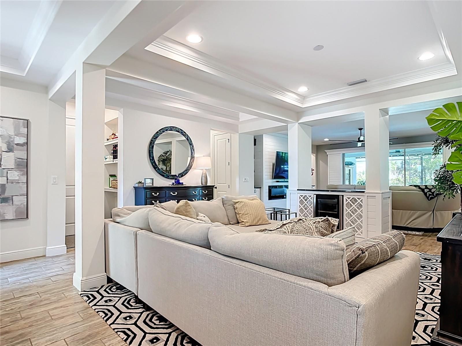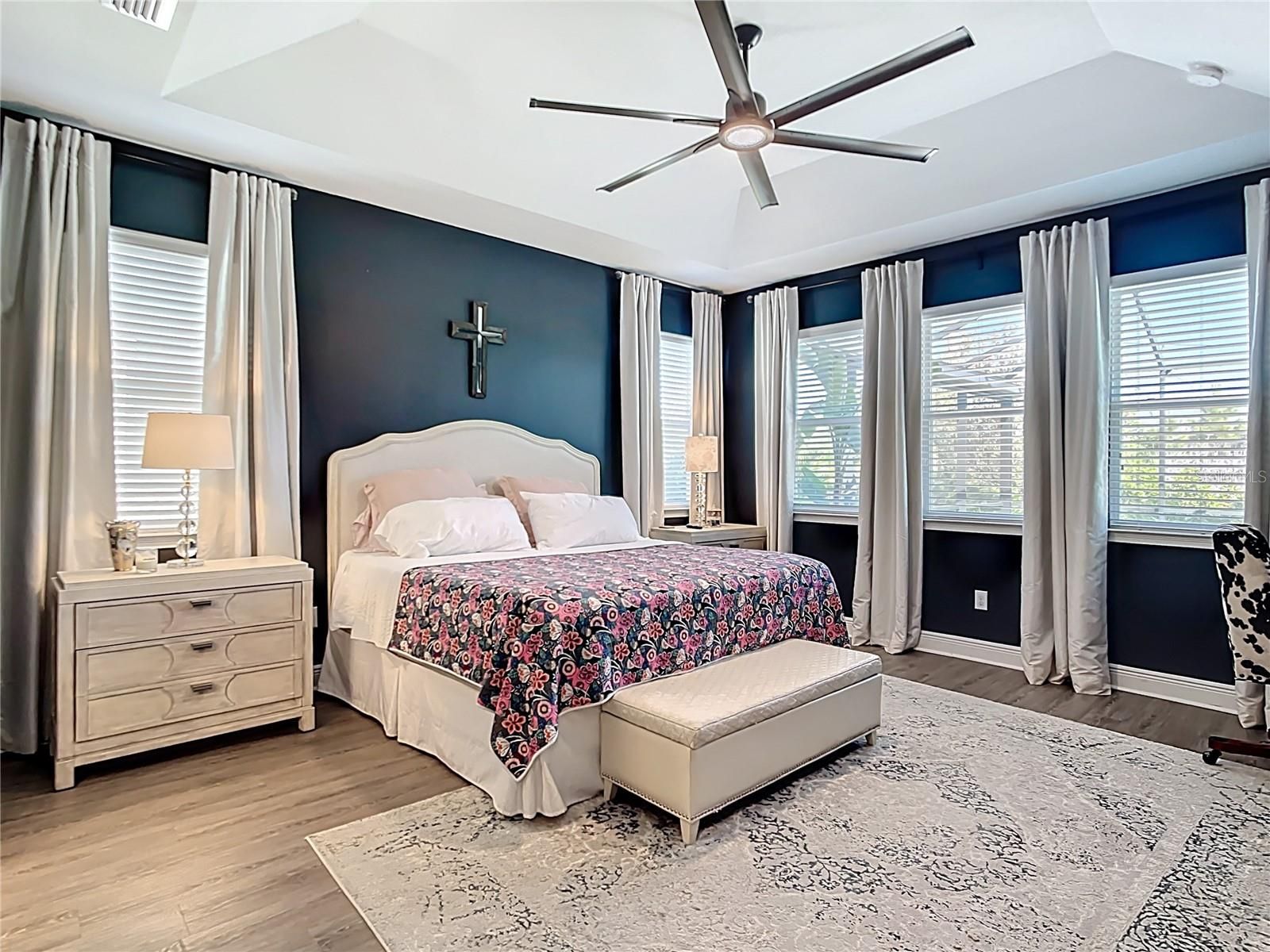 - Built-in Features, Ceiling Fan(s), Eat-in Kitchen, High Ceilings, In-Wall Pest Control, Kitchen/Family Room Combo, Open Floorplan, Main Level Primary, Solid-Wood Cabinets, Split Bedrooms, Stone Counters, Thermostat, Tray Ceiling(s), Walk-In Closet(s), Window Treatments
