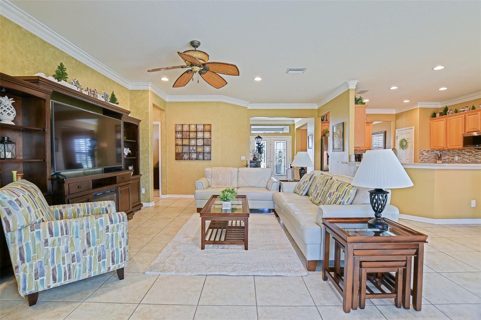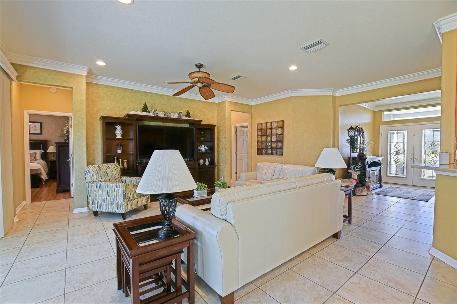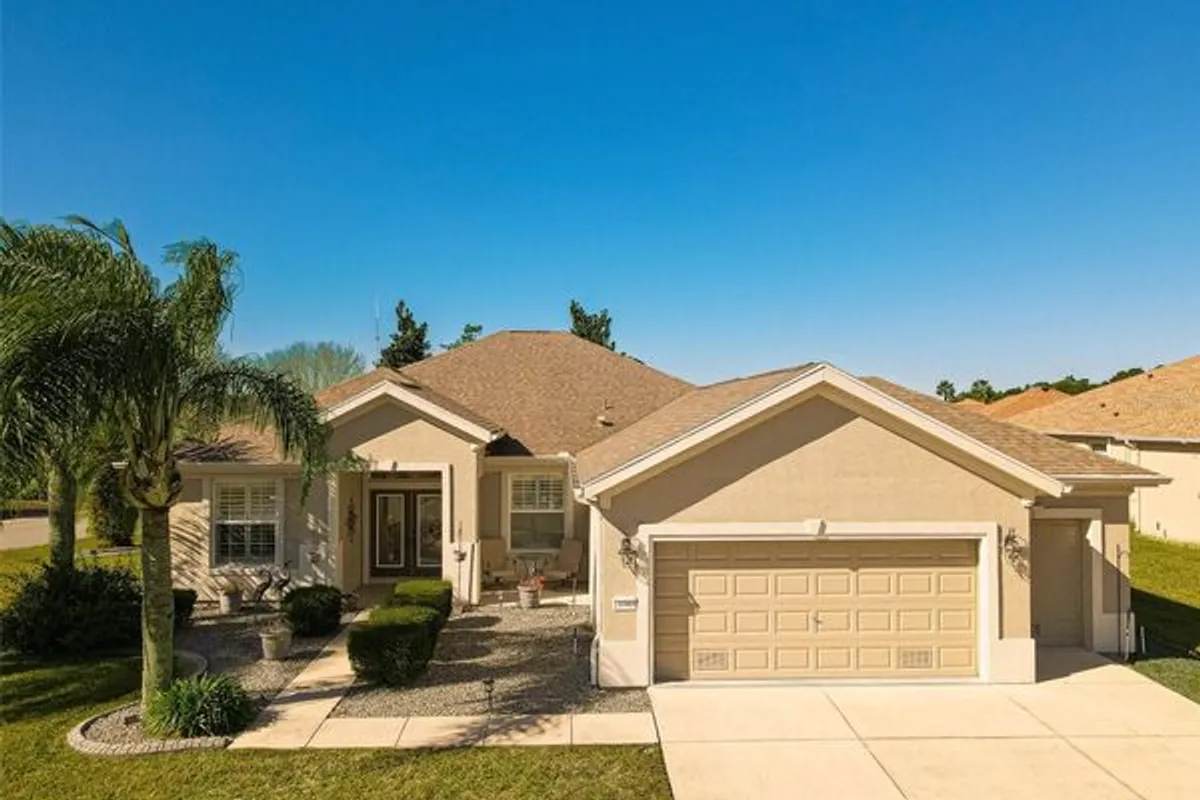 Jaw-dropping and absolutely gorgeous, this three-bedroom, two-bath Hanover floor plan is a concrete block and stucco home perfectly positioned on a corner, semi-private lot in the highly sought-after Del Webb Spruce Creek Golf & Country Club. Offering a private well, extended garage plus golf cart garage, and exceptional upgrades throughout, this home blends elegance, comfort, and peace of mind. The easy-maintenance landscape is enhanced with concrete curbing, gutters, and down spouts, while a stunning tiled covered front porch and open patio welcome you inside through leaded glass double entry doors. Step into a beautifully appointed interior featuring tile flooring throughout all main living and wet areas, complemented by Hamilton-style crown molding in nearly every room. The formal dining room showcases tile floors, crown molding, and plantation shutters, while the main living area and breakfast nook continue the seamless tile design. Cornices frame the double sliding glass doors that lead to the beautifully redone Lanai, creating an inviting indoor-outdoor flow. The chef’s kitchen is a true showstopper with solid wood cabinetry, tile back splash, cabinet pull-outs, Corinne countertops, newer stainless-steel appliances (2022), breakfast bar, and new LED lighting throughout the entire home. All of this overlooking the great room, with its open floor plan is great for entertaining. The primary suite offers luxury vinyl flooring, plantation shutters, and a spa-inspired bath featuring tile floors, a raised solid oak vanity, raised toilets, plantation shutters, and a tiled shower with grab bars for added safety. Bedroom two, currently used as an office, features tile flooring and plantation shutters, while bedroom three offers cozy carpeting, plantation shutters, and a decorative cornice. The guest bath includes a raised vanity and toilet with a tub-shower combination. The fully enclosed Lanai, updated in 2019, features custom full-view argon glass windows, and power solar shades, overlooking a large, deep, semi-private backyard enhanced with a large brick paver patio, perfect or entertaining guests or just relaxing and enjoying nature, the mature landscaping allows for maximum privacy. The laundry room includes added cabinetry and a sink for extra convenience. Major updates include a complete repipe (2021), new roof and vents (2018), exterior repaint (2024), HVAC replacement (2017), water heater (2017), added insulation (2023 & 2017), new garage door motors(2024), attic fan and garage insulation vents (2017), well pump (2016), Hydrowise sprinkler control (2021), and a transferrable termite warranty!