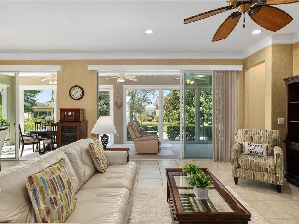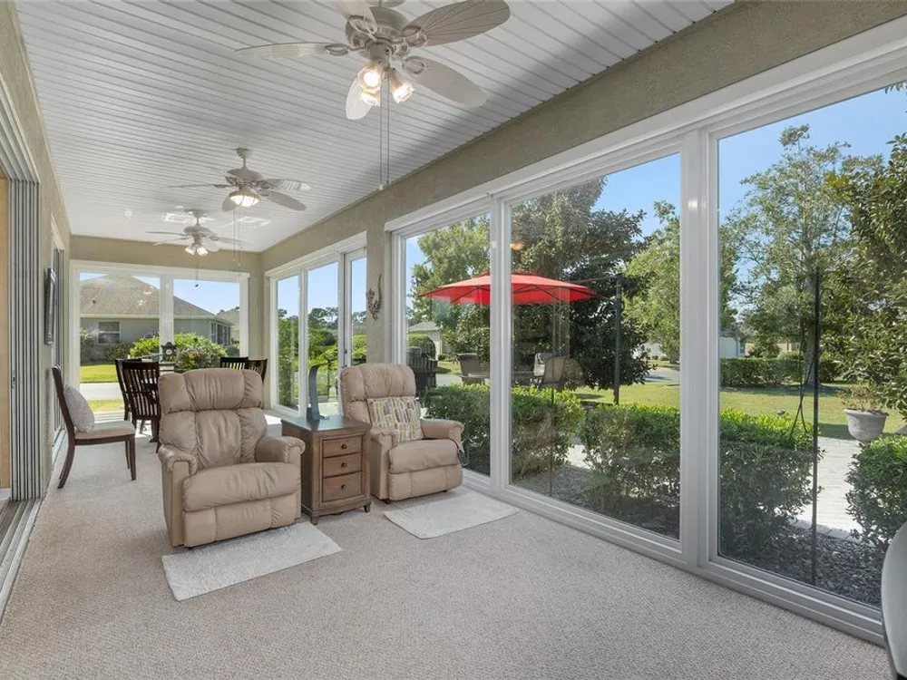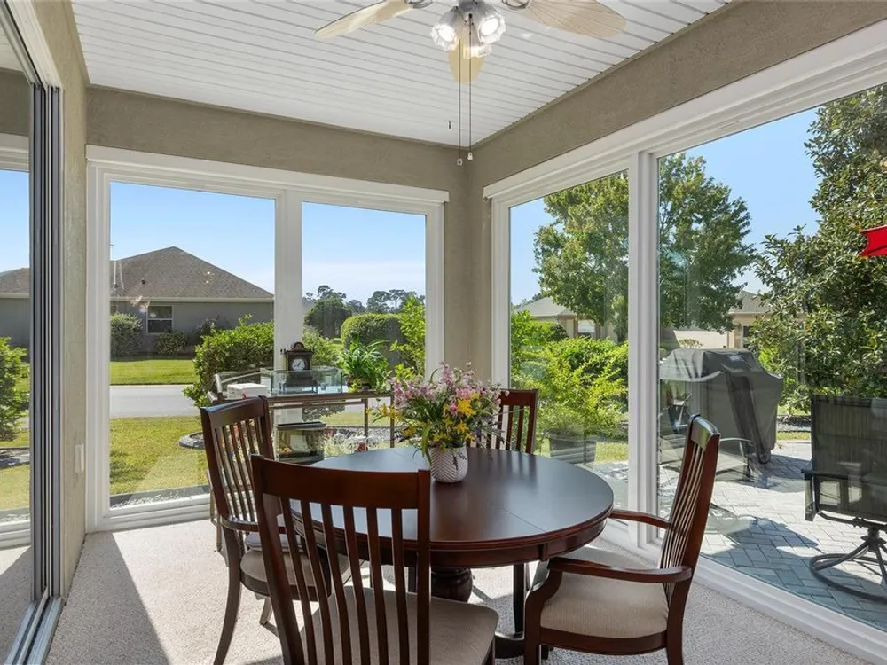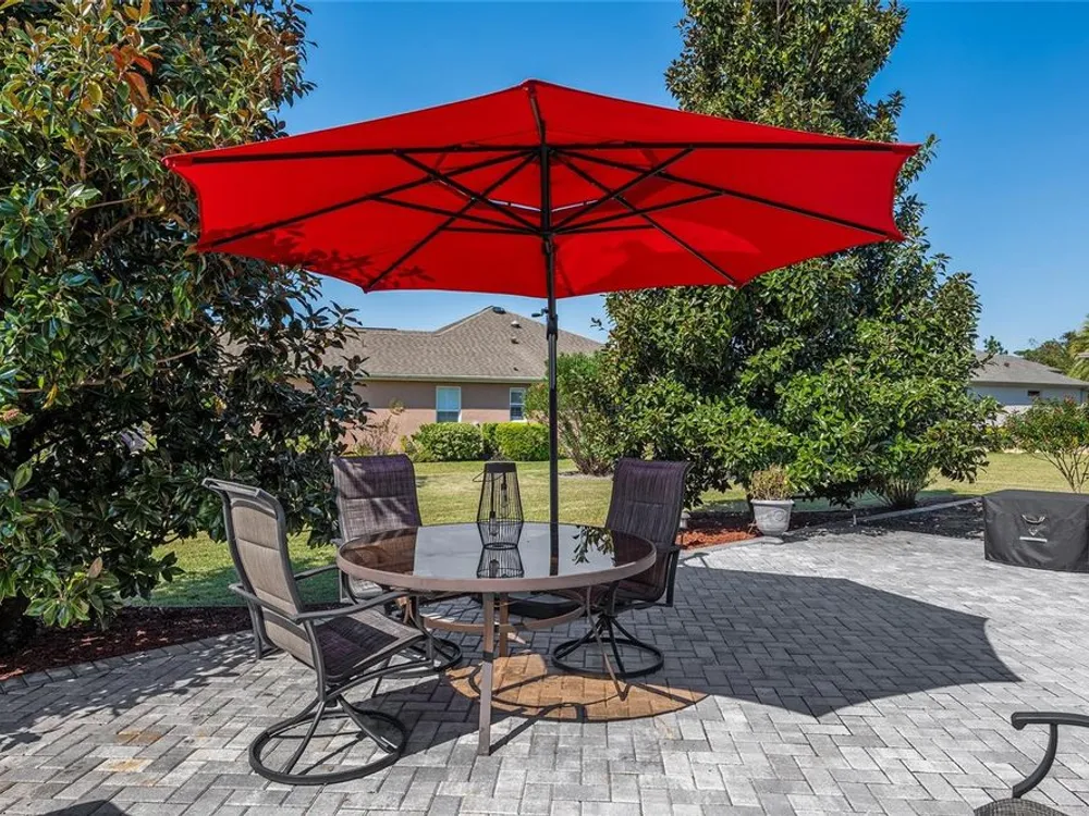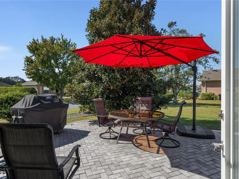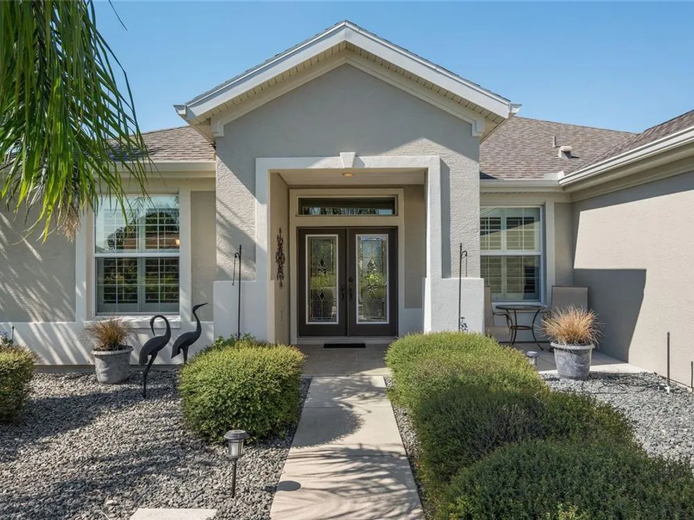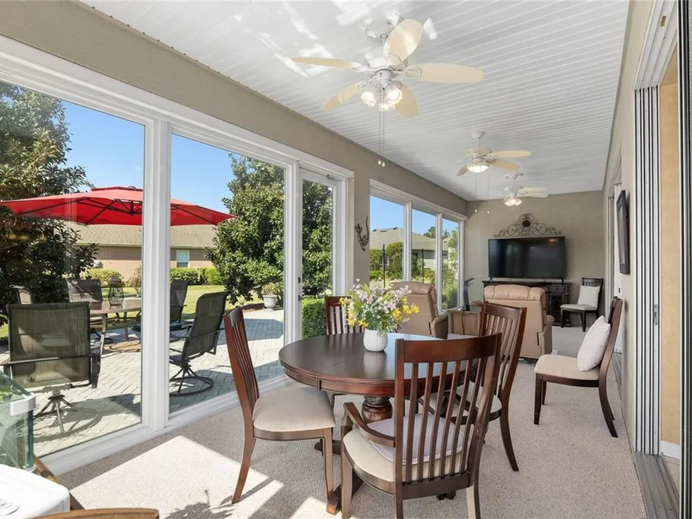 Right out of a magazine, this stunning HANOVER sits on a 1/3 acre oasis in the neighborhood of SHERWOOD. This extremely well maintained 3/2 boasts Concrete Block Stucco Construction, beautiful leaded glass double door entry. This spacious floor plan offers a large dining room as well as an eat-in kitchen. The Kitchen has upgraded tall oak cabinets with roll-out drawers along with Quartz Countertops and tile backsplash, plus additional cabinets with desk space. The primary bath has a tub and a large glassed shower along with taller vanities. Flooring is 18” Tile in main areas and bedroom floors of carpet & engineered wood. The comfortable 10'x32' Lanai has been converted to climate controlled additional living space and has large Argon filled glass windows with remote controlled power solar shades overlooking the elevated 28’x18’ resort-like brick paver patio, an 18’x18’ garden area and the private park-like landscaped back yard. You will find plantation shutters, large crown molding, a private irrigation well, lots of extra insulation, an extended garage with extensive built-in shelving, AND A 20’ DEEP GOLF CART GARAGE. Pipes were replaced in 2021, Exterior Painted in 2024, all new Kitchen Appliances in 2022, New roof 2018, New HVAC 2017…AN SO MUCH MORE. PHOTOS CANNOT CONVEY THE COMFORT OF THIS HOME AND ENJOYMENT OF RELAXING & ENTERTAINING ON THIS OUTSTANDING LANAI AND PATIO. Note: With the lanai opened to the home, this home actually has AN ADDITIONAL 320 SQUARE FEET OF LIVING SPACE MAKING THE TOTAL UNDER GLASS, ROOF, AND AIR CONDITIONING 2,278 SQUARE FEET . AWARD-WINNING Del Webb Spruce Creek Golf & Country Club is a GATED, 3,250 home, +55 Community with over 70 clubs, 3 pools, 3 spas, a Clubhouse, a Fitness Center, Bocce Ball, Shuffleboard, 12 Pickle ball Courts, 7 Tennis Courts, Sand Volleyball, Water Volleyball, Lake Vista Gazebo, Pavilions, Walking Paths and so much more! Come see this beautiful community with a GORGEOUS Tree Canopy on the Boulevard and its Restaurant, Liberty Grille. Come, enjoy the four (4) 9-hole Golf Courses today and begin living your BEST LIFE! IF YOU ARE LOOKING FOR THAT OVER-THE-TOP 3-BEDROOM HOME THAT FEELS LIKE IT IS IN ITS OWN PRIVATE WORLD....YOU MUST SEE THIS HOME!!
