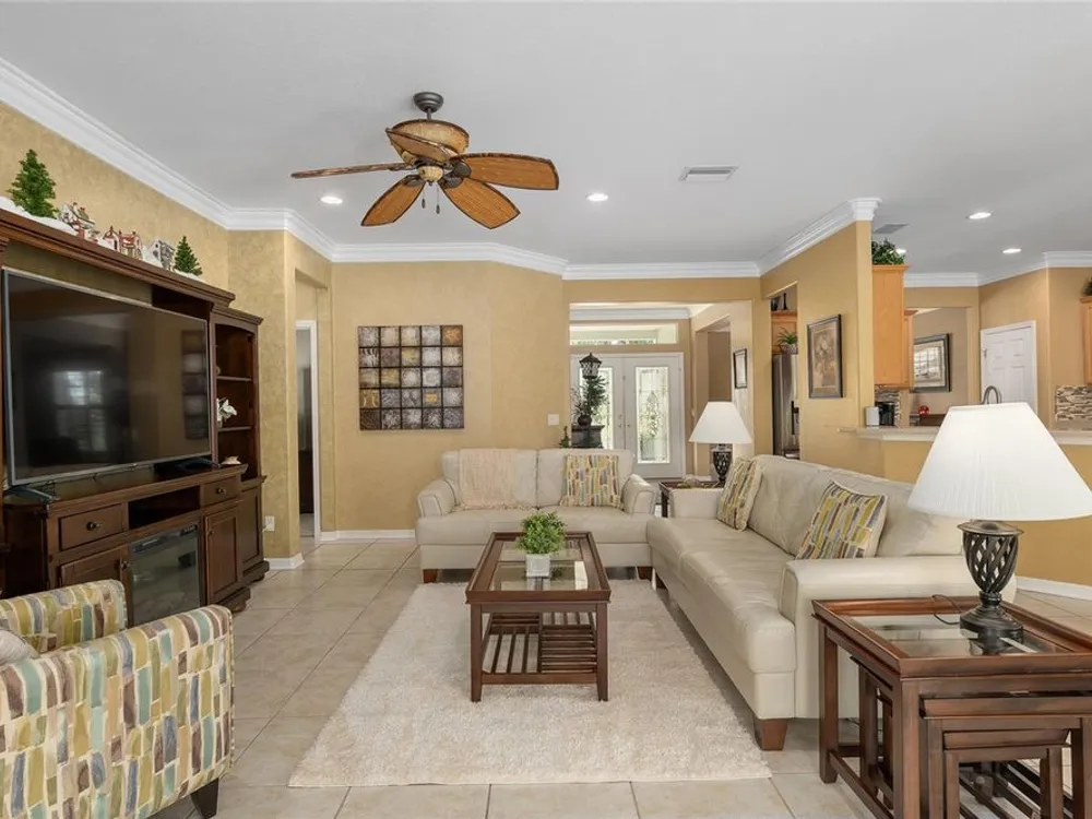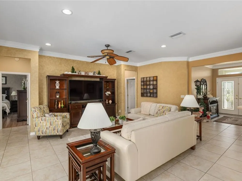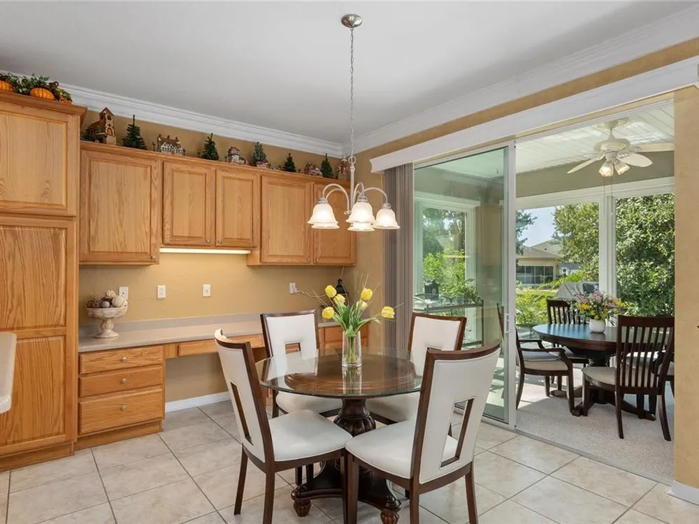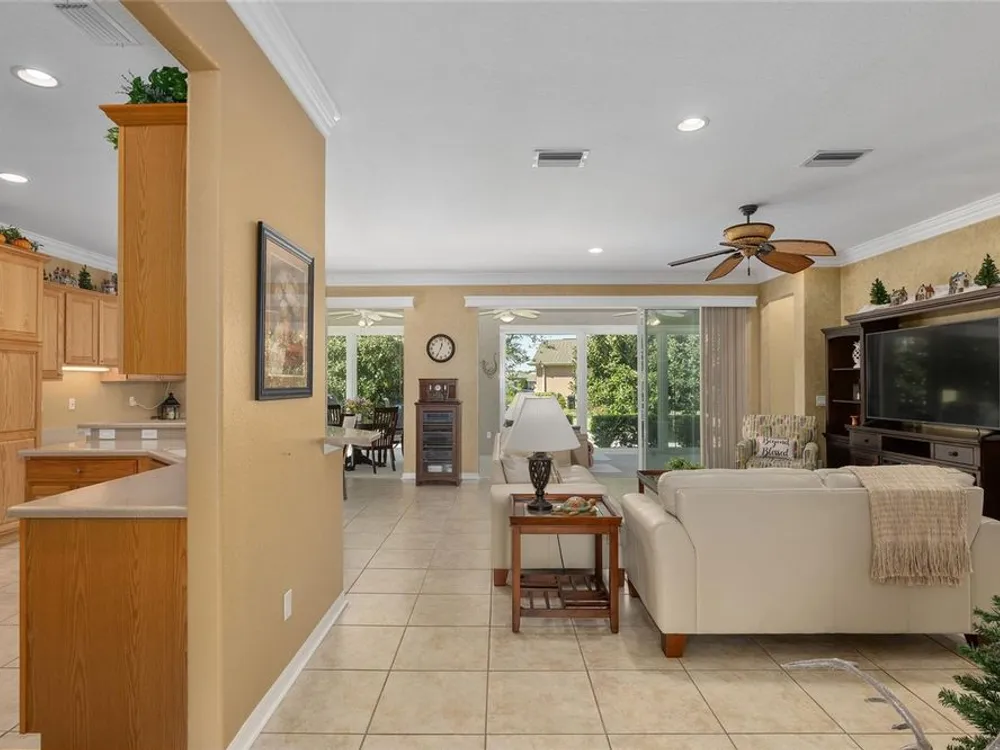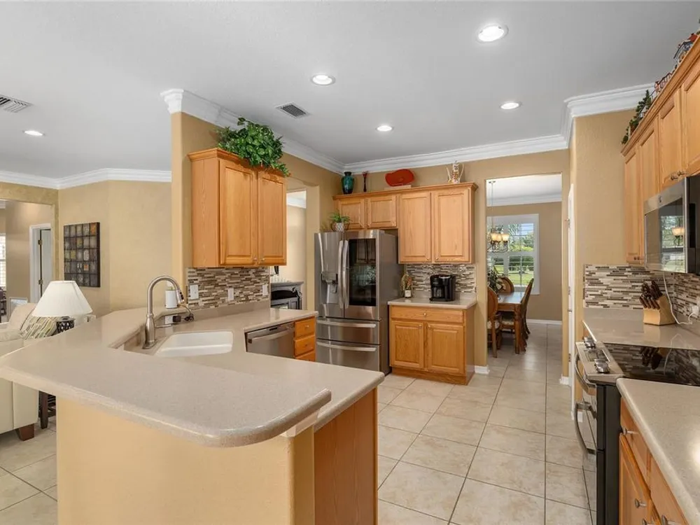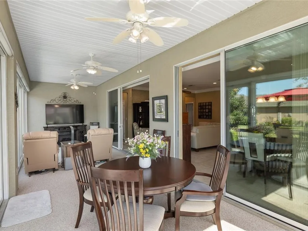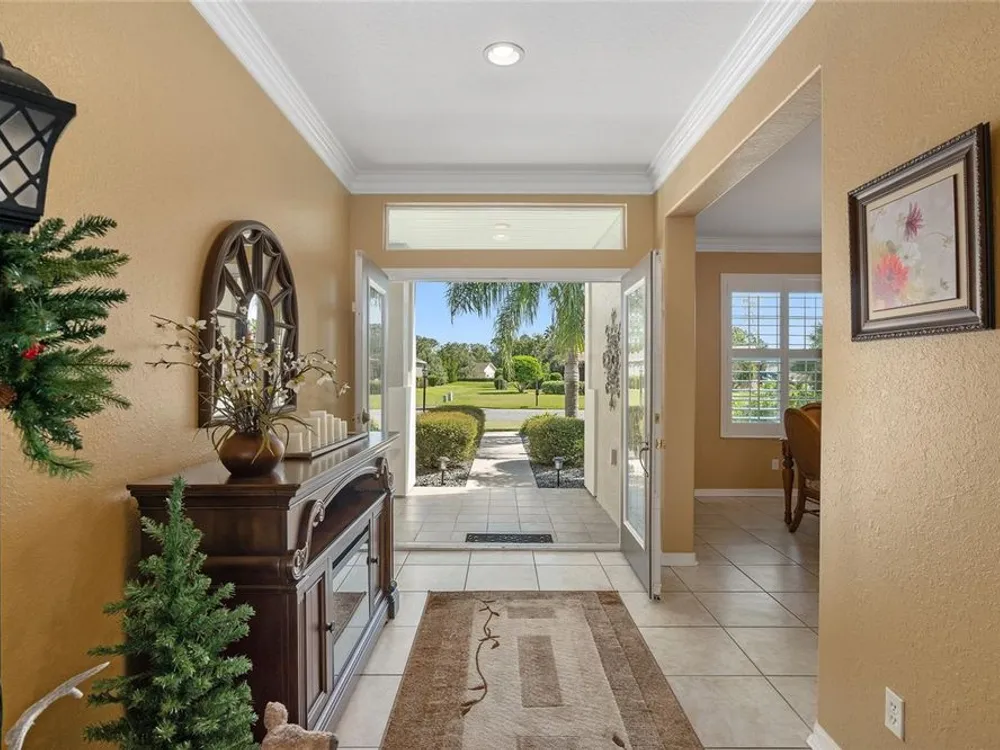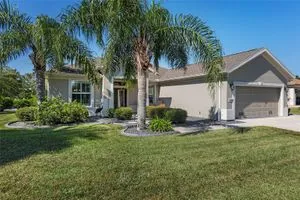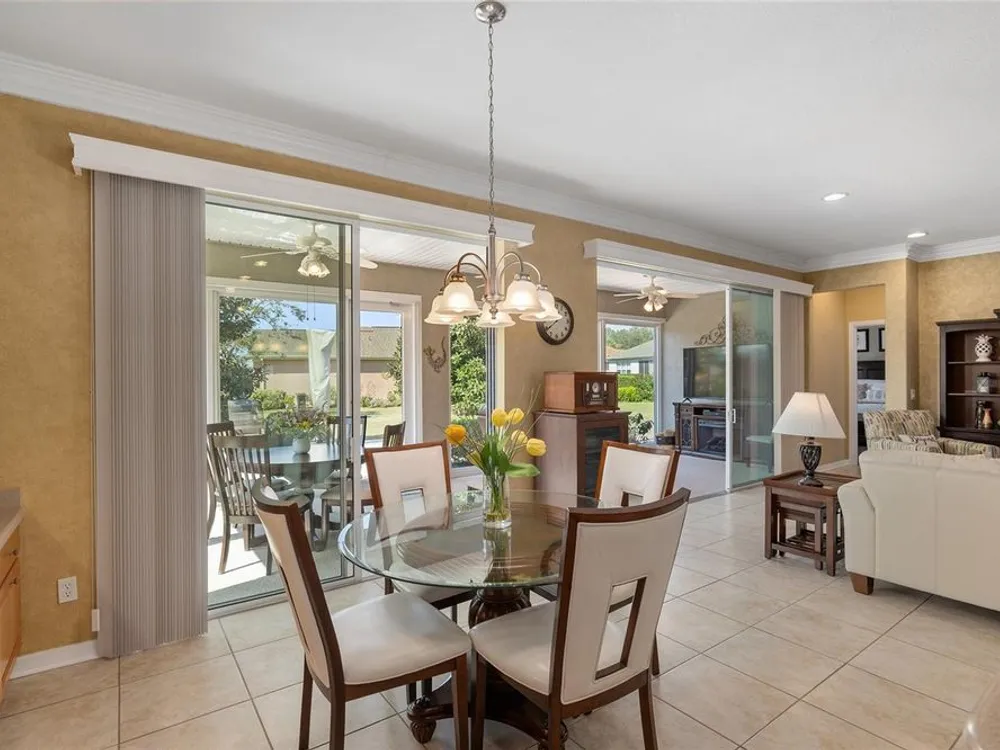 Right out of a magazine, this stunning HANOVER sits on a 1/3 acre oasis in the neighborhood of SHERWOOD. This extremely well maintained 3/2 boasts Concrete Block Stucco Construction, beautiful leaded glass double door entry. This spacious floor plan offers a large dining room as well as an eat-in kitchen. The Kitchen has upgraded tall oak cabinets with roll-out drawers along with Quartz Countertops and tile backsplash, plus additional cabinets with desk space. The primary bath has a tub and a large glassed shower along with taller vanities. Flooring is 18” Tile in main areas and bedroom floors of carpet & engineered wood. The comfortable 10'x32' Lanai has been converted to climate controlled additional living space and has large Argon filled glass windows with remote controlled power solar shades overlooking the elevated 28’x18’ resort-like brick paver patio, an 18’x18’ garden area and the private park-like landscaped back yard. You will find plantation shutters, large crown molding, a private irrigation well, lots of extra insulation, an extended garage with extensive built-in shelving, AND A 20’ DEEP GOLF CART GARAGE. Pipes were replaced in 2021, Exterior Painted in 2024, all new Kitchen Appliances in 2022, New roof 2018, New HVAC 2017…AN SO MUCH MORE. PHOTOS CANNOT CONVEY THE COMFORT OF THIS HOME AND ENJOYMENT OF RELAXING & ENTERTAINING ON THIS OUTSTANDING LANAI AND PATIO. Note: With the lanai opened to the home, this home actually has AN ADDITIONAL 320 SQUARE FEET OF LIVING SPACE MAKING THE TOTAL UNDER GLASS, ROOF, AND AIR CONDITIONING 2,278 SQUARE FEET . AWARD-WINNING Del Webb Spruce Creek Golf & Country Club is a GATED, 3,250 home, +55 Community with over 70 clubs, 3 pools, 3 spas, a Clubhouse, a Fitness Center, Bocce Ball, Shuffleboard, 12 Pickle ball Courts, 7 Tennis Courts, Sand Volleyball, Water Volleyball, Lake Vista Gazebo, Pavilions, Walking Paths and so much more! Come see this beautiful community with a GORGEOUS Tree Canopy on the Boulevard and its Restaurant, Liberty Grille. Come, enjoy the four (4) 9-hole Golf Courses today and begin living your BEST LIFE! IF YOU ARE LOOKING FOR THAT OVER-THE-TOP 3-BEDROOM HOME THAT FEELS LIKE IT IS IN ITS OWN PRIVATE WORLD....YOU MUST SEE THIS HOME!!