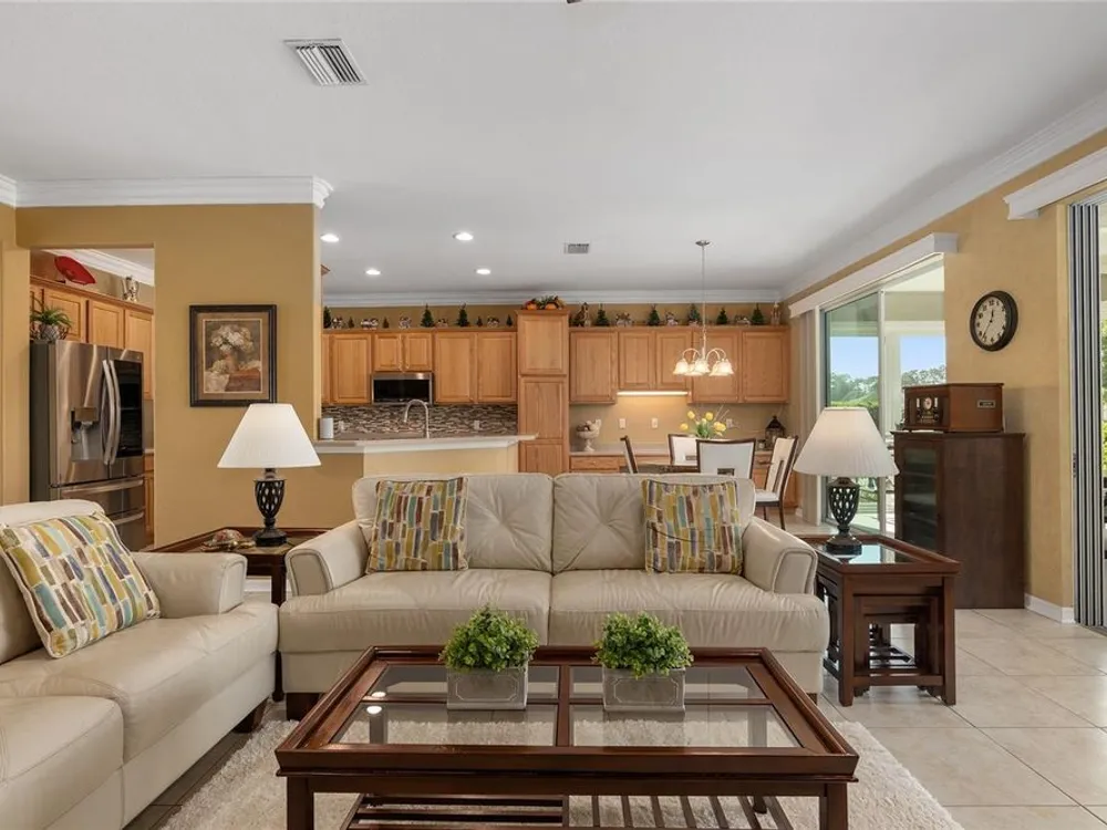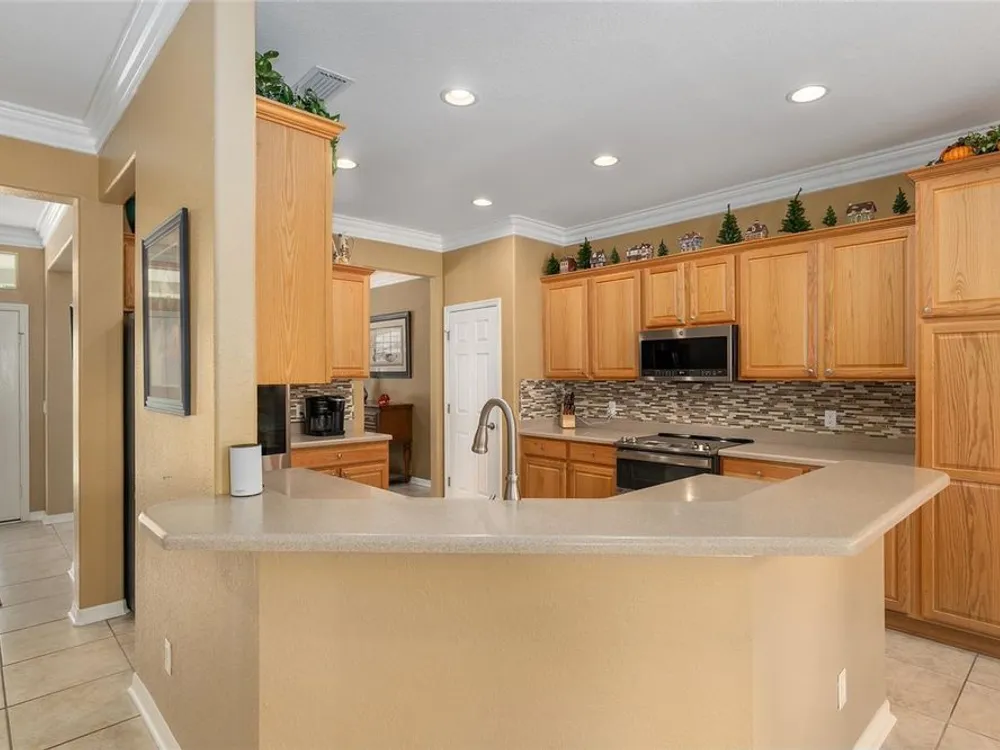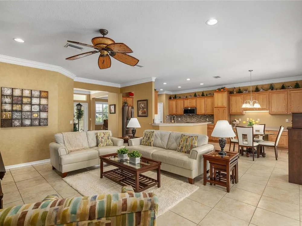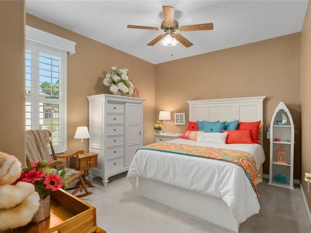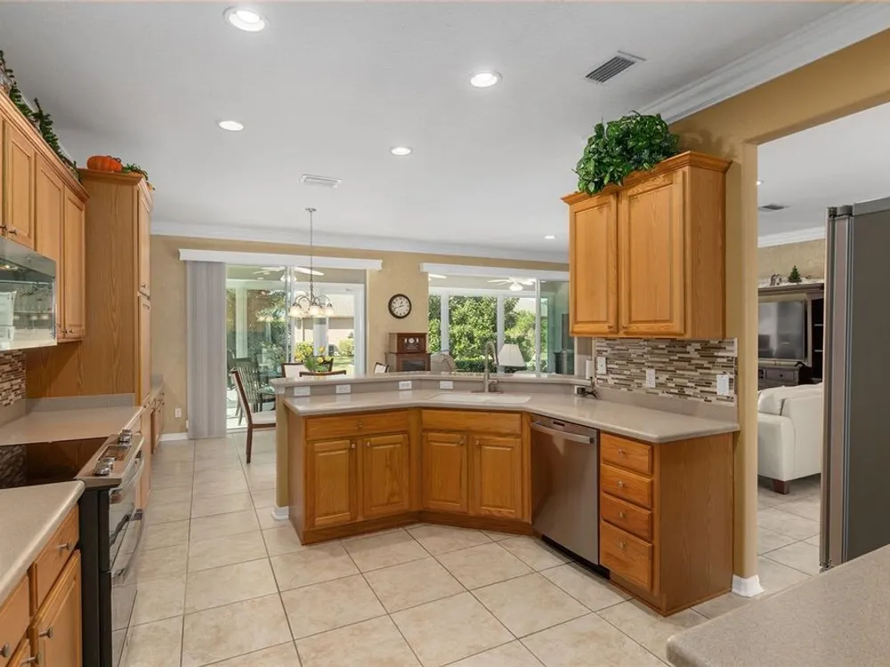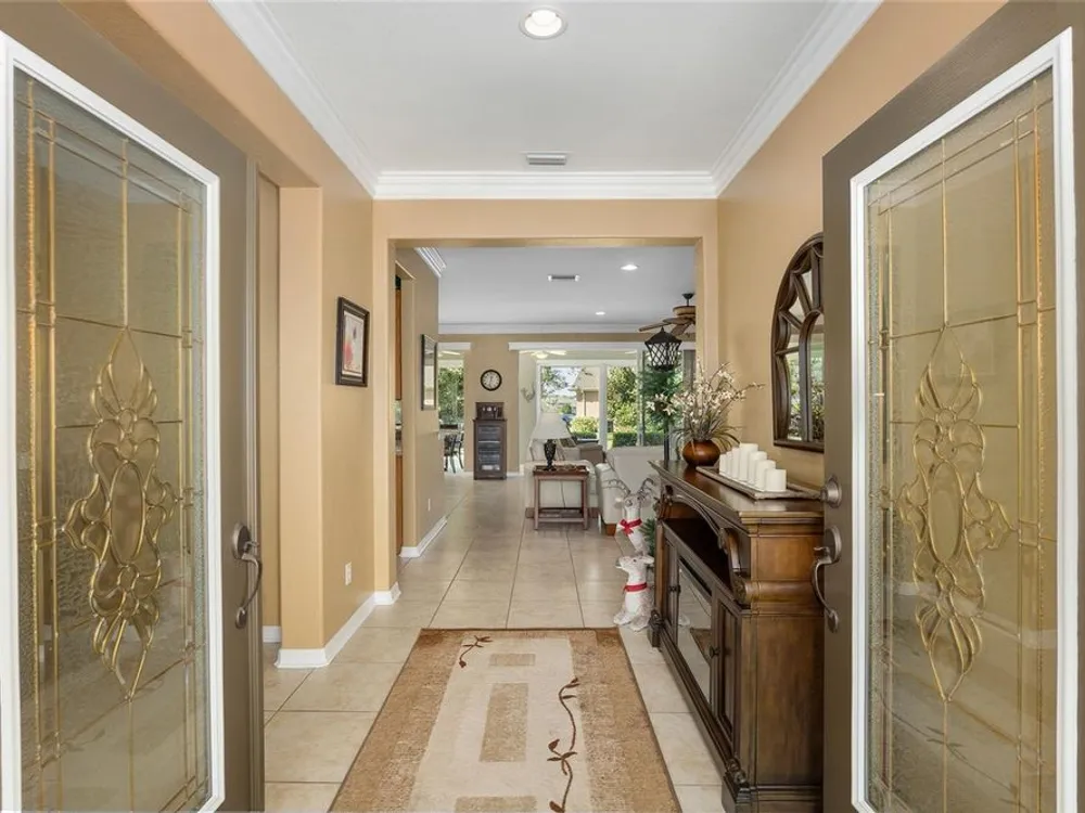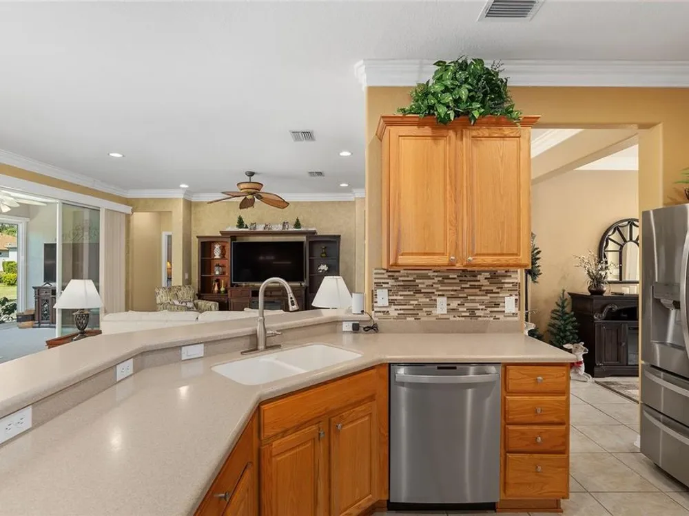 Right out of a magazine, this stunning HANOVER sits on a 1/3 acre oasis in the neighborhood of SHERWOOD. This extremely well maintained 3/2 boasts Concrete Block Stucco Construction, beautiful leaded glass double door entry. This spacious floor plan offers a large dining room as well as an eat-in kitchen. The Kitchen has upgraded tall oak cabinets with roll-out drawers along with Quartz Countertops and tile backsplash, plus additional cabinets with desk space. The primary bath has a tub and a large glassed shower along with taller vanities. Flooring is 18” Tile in main areas and bedroom floors of carpet & engineered wood. The comfortable 10'x32' Lanai has been converted to climate controlled additional living space and has large Argon filled glass windows with remote controlled power solar shades overlooking the elevated 28’x18’ resort-like brick paver patio, an 18’x18’ garden area and the private park-like landscaped back yard. You will find plantation shutters, large crown molding, a private irrigation well, lots of extra insulation, an extended garage with extensive built-in shelving, AND A 20’ DEEP GOLF CART GARAGE. Pipes were replaced in 2021, Exterior Painted in 2024, all new Kitchen Appliances in 2022, New roof 2018, New HVAC 2017…AN SO MUCH MORE. PHOTOS CANNOT CONVEY THE COMFORT OF THIS HOME AND ENJOYMENT OF RELAXING & ENTERTAINING ON THIS OUTSTANDING LANAI AND PATIO. Note: With the lanai opened to the home, this home actually has AN ADDITIONAL 320 SQUARE FEET OF LIVING SPACE MAKING THE TOTAL UNDER GLASS, ROOF, AND AIR CONDITIONING 2,278 SQUARE FEET . AWARD-WINNING Del Webb Spruce Creek Golf & Country Club is a GATED, 3,250 home, +55 Community with over 70 clubs, 3 pools, 3 spas, a Clubhouse, a Fitness Center, Bocce Ball, Shuffleboard, 12 Pickle ball Courts, 7 Tennis Courts, Sand Volleyball, Water Volleyball, Lake Vista Gazebo, Pavilions, Walking Paths and so much more! Come see this beautiful community with a GORGEOUS Tree Canopy on the Boulevard and its Restaurant, Liberty Grille. Come, enjoy the four (4) 9-hole Golf Courses today and begin living your BEST LIFE! IF YOU ARE LOOKING FOR THAT OVER-THE-TOP 3-BEDROOM HOME THAT FEELS LIKE IT IS IN ITS OWN PRIVATE WORLD....YOU MUST SEE THIS HOME!!