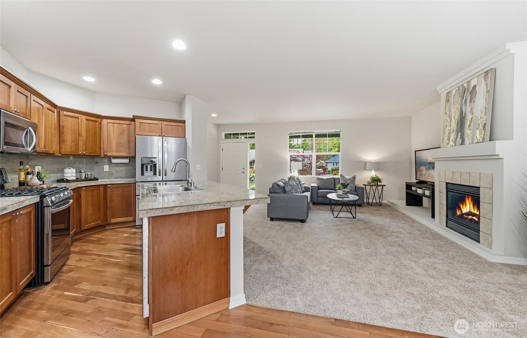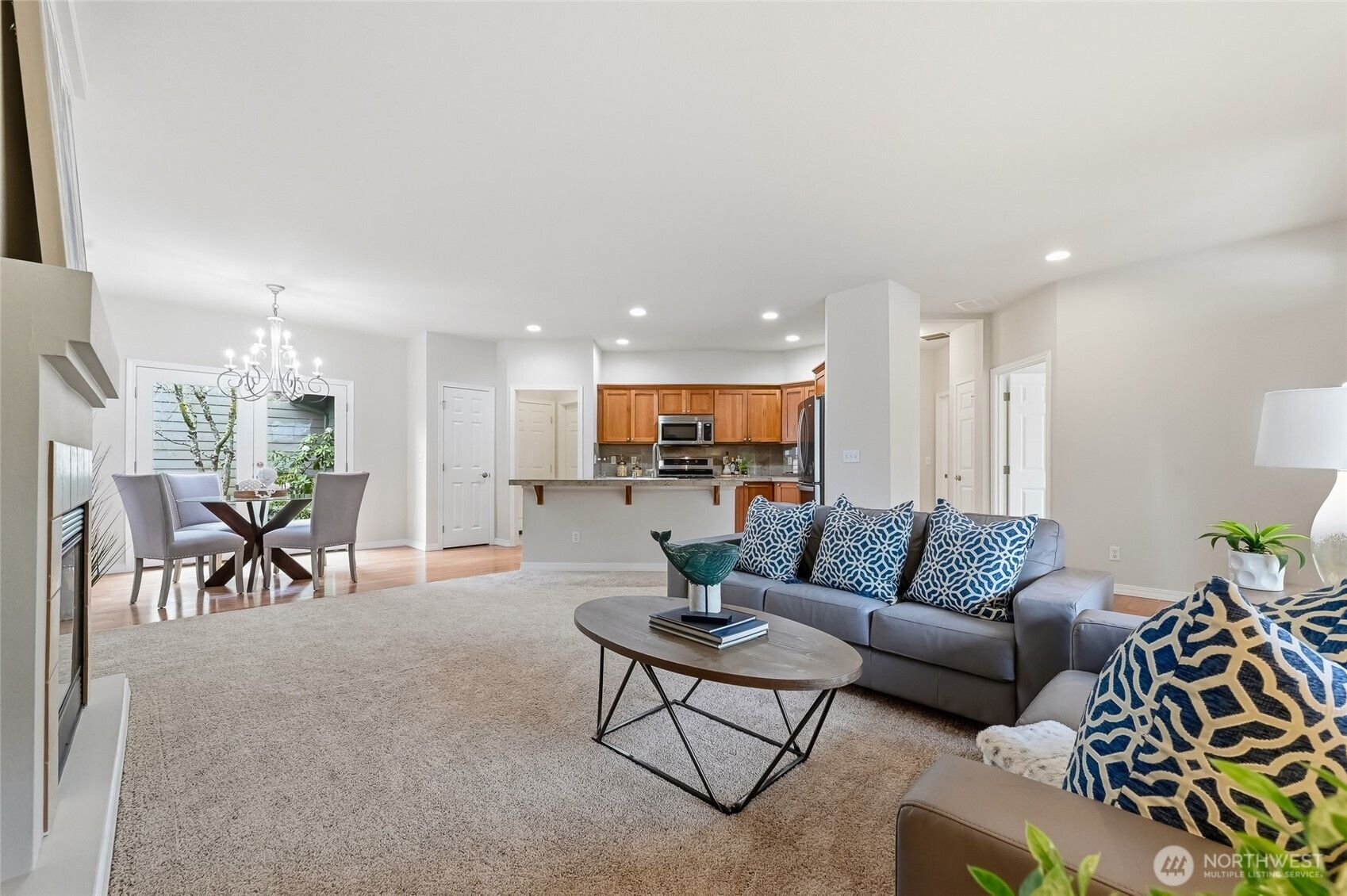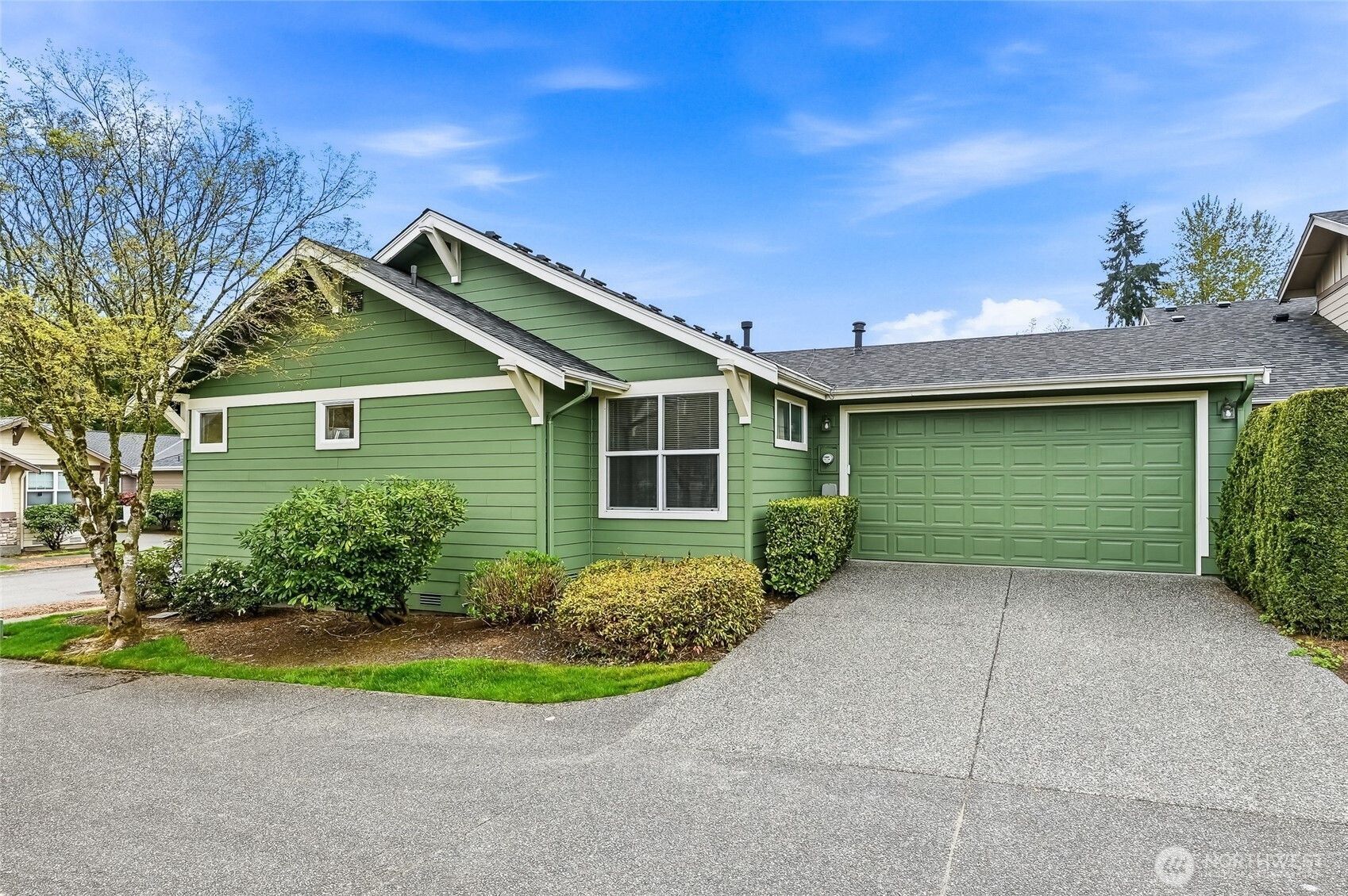 This 3 bedroom Orchard plan home has a spacious feel with high ceilings and open style concept perfect for one level living. The great room space seamlessly connects the kitchen, living and dining areas, creating an inviting space for gatherings with its cozy gas fireplace. The kitchen has ample cabinets, stainless steel appliances and a breakfast bar. Freshly painted and new carpet throughout. Generous primary with a ¾ en-suite and walk-in closet. Two additional bedrooms, one of which makes a nice office. New roof with transferrable warranty and new exterior paint in 2024. EV charger in the 2 car garage with just a gentle slope into the home, no stair entry. Private courtyard-style backyard with a patio and nice garden space. TAs the PNW’s flagship 55+ master-planned community, Trilogy offers more than just a place to live, it's a resort lifestyle with a beautiful clubhouse, fitness center, indoor pool & walking track, pickleball & tennis courts, miles of walking trails and a true sense of community. One occupant must be age 55. No kids under age 18.