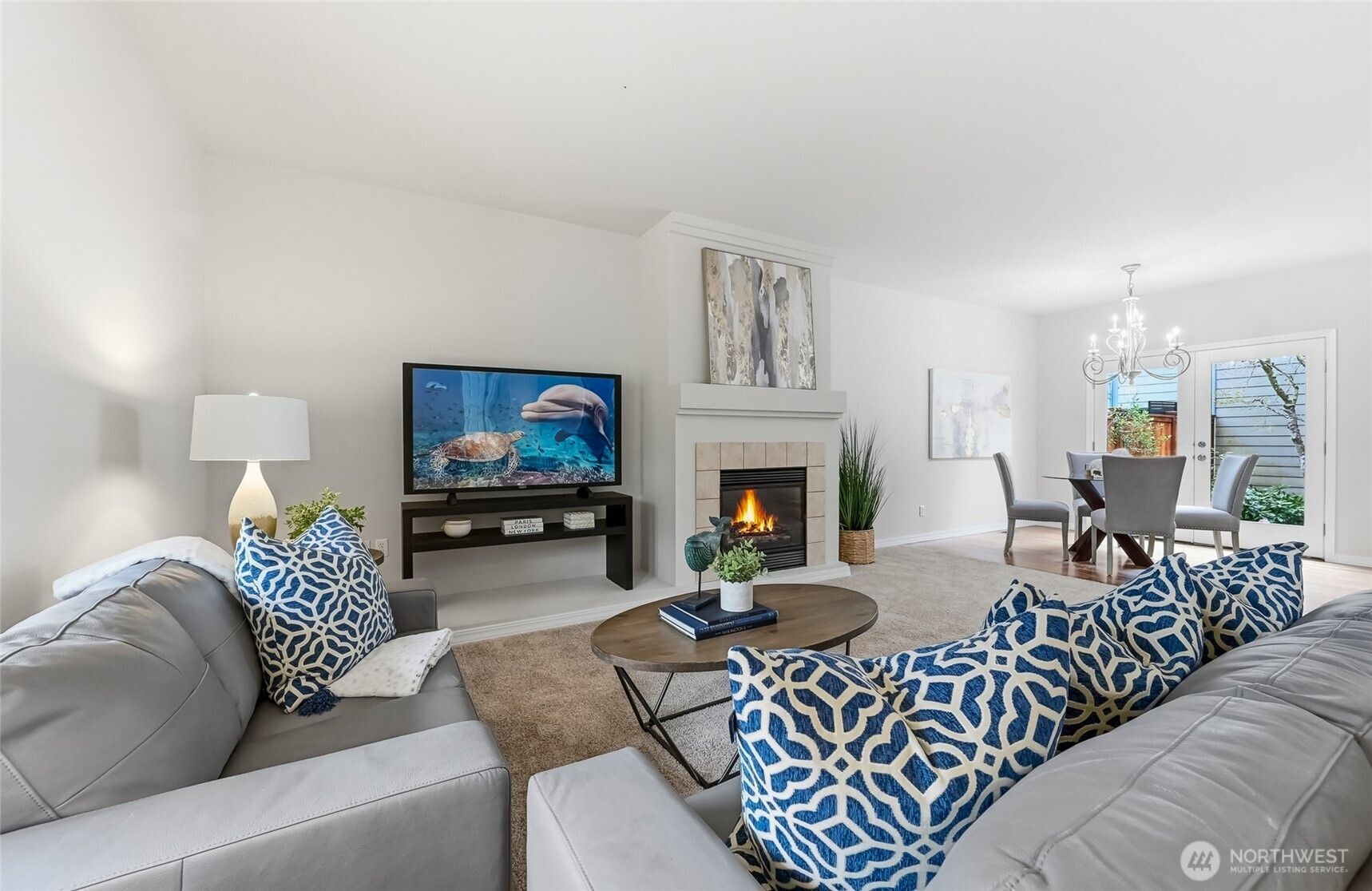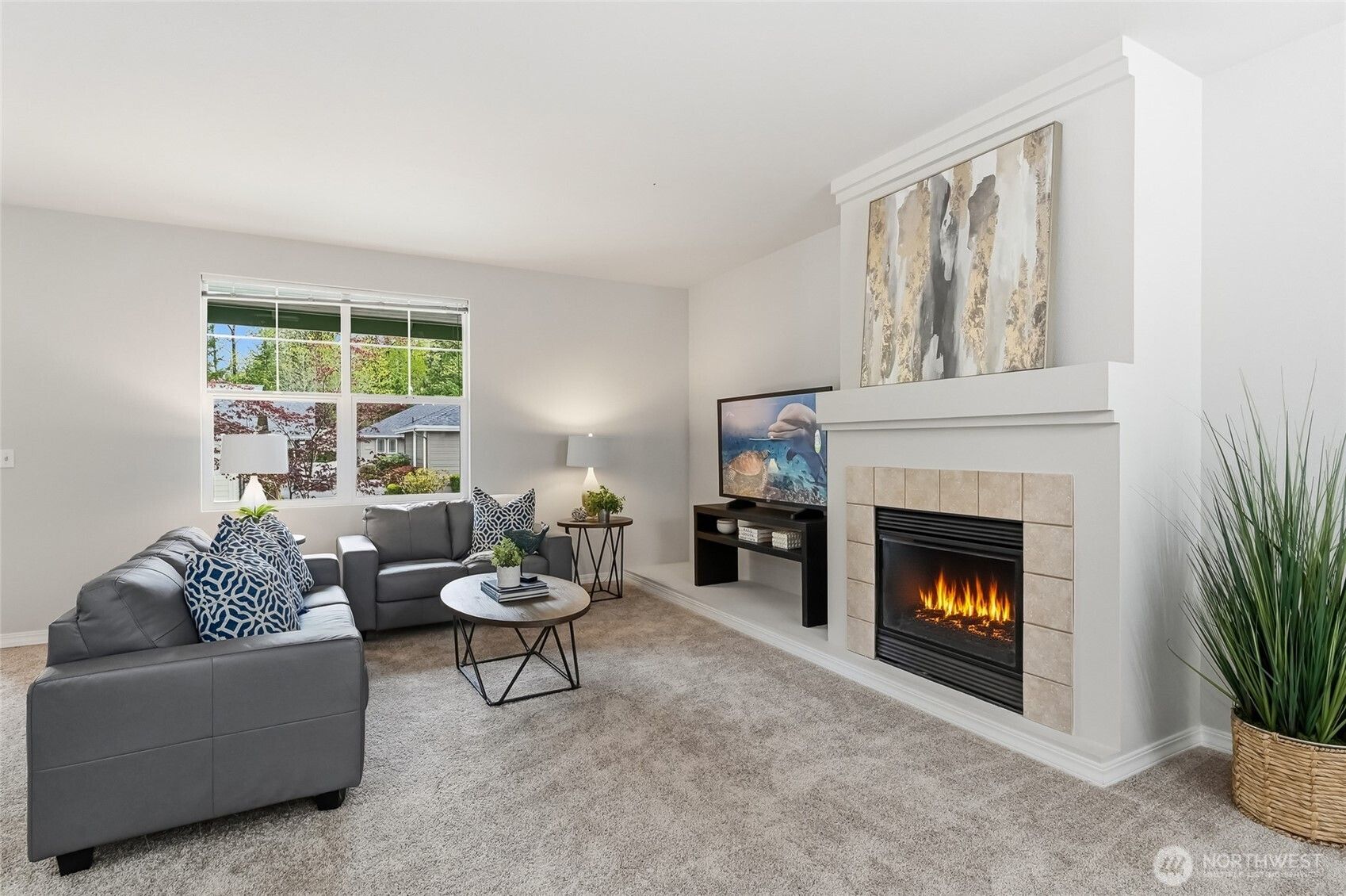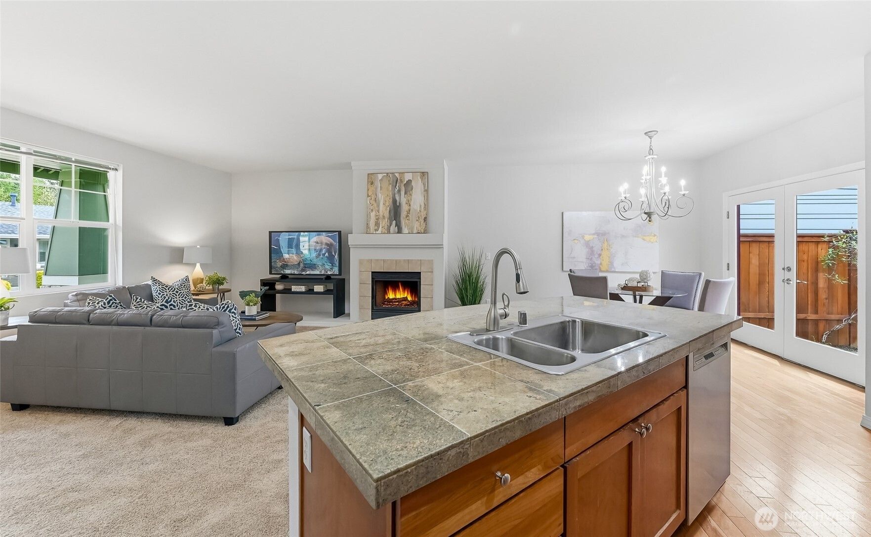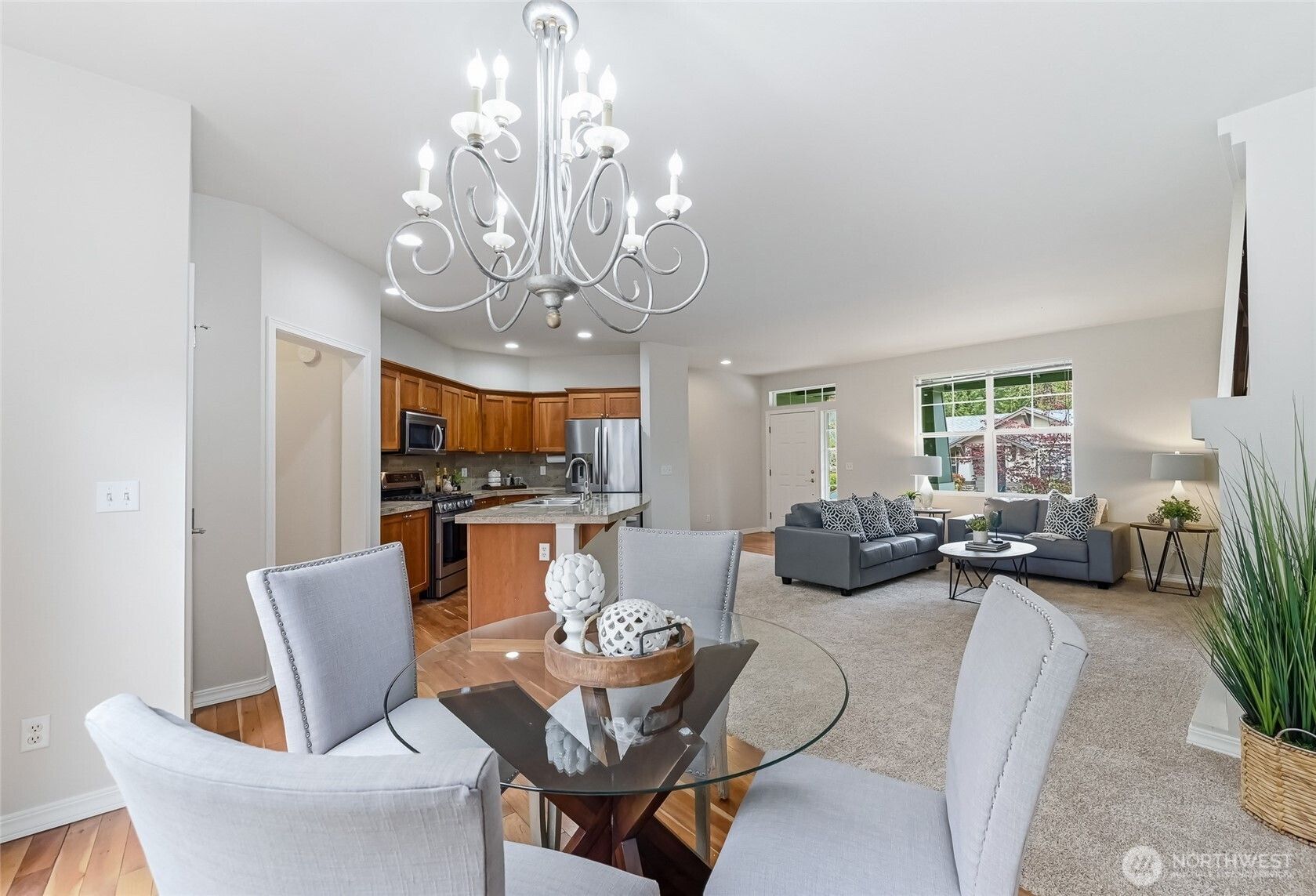 This 3 bedroom Orchard plan home has a spacious feel with high ceilings and open style concept perfect for one level living. The great room space seamlessly connects the kitchen, living and dining areas, creating an inviting space for gatherings with its cozy gas fireplace. The kitchen has ample cabinets, stainless steel appliances and a breakfast bar. Freshly painted and new carpet throughout. Generous primary with a ¾ en-suite and walk-in closet. Two additional bedrooms, one of which makes a nice office. New roof with transferrable warranty and new exterior paint in 2024. EV charger in the 2 car garage with just a gentle slope into the home, no stair entry. Private courtyard-style backyard with a patio and nice garden space. TAs the PNW’s flagship 55+ master-planned community, Trilogy offers more than just a place to live, it's a resort lifestyle with a beautiful clubhouse, fitness center, indoor pool & walking track, pickleball & tennis courts, miles of walking trails and a true sense of community. One occupant must be age 55. No kids under age 18.