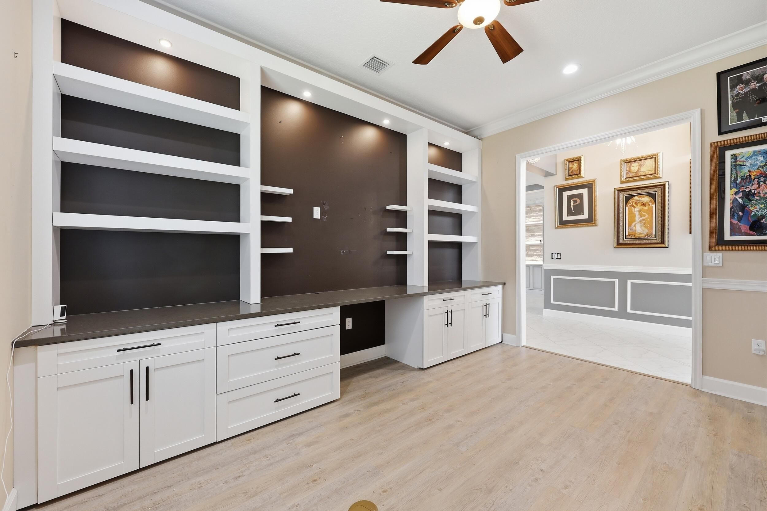 - Built-in Features, Cathedral Ceiling(s), Entrance Foyer, High Ceilings, Kitchen Island, Pantry, Walk-In Closet(s), Split Bedrooms, Custom Mirrors, Impact Glass, Breakfast Area, Eat-in Kitchen, Separate/Formal Dining Room, Entry Level Living Area, Dual Sinks, Main Level Primary, Sitting Area In Primary Bedroom, Separate Shower