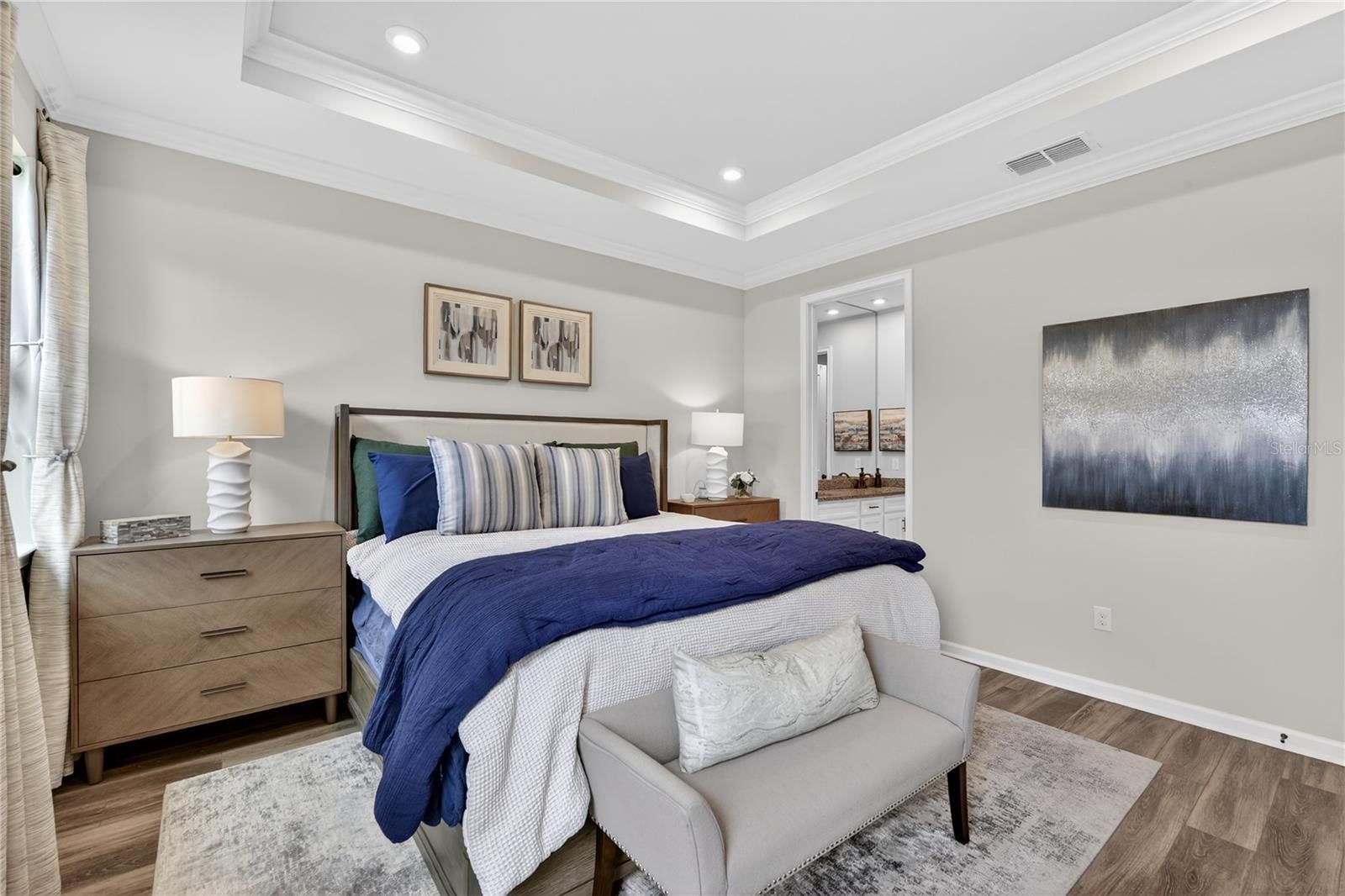 - Ceiling Fan(s), Crown Molding, High Ceilings, In-Wall Pest Control, Kitchen/Family Room Combo, Open Floorplan, Main Level Primary, Split Bedrooms, Stone Counters, Tray Ceiling(s), Walk-In Closet(s), Window Treatments