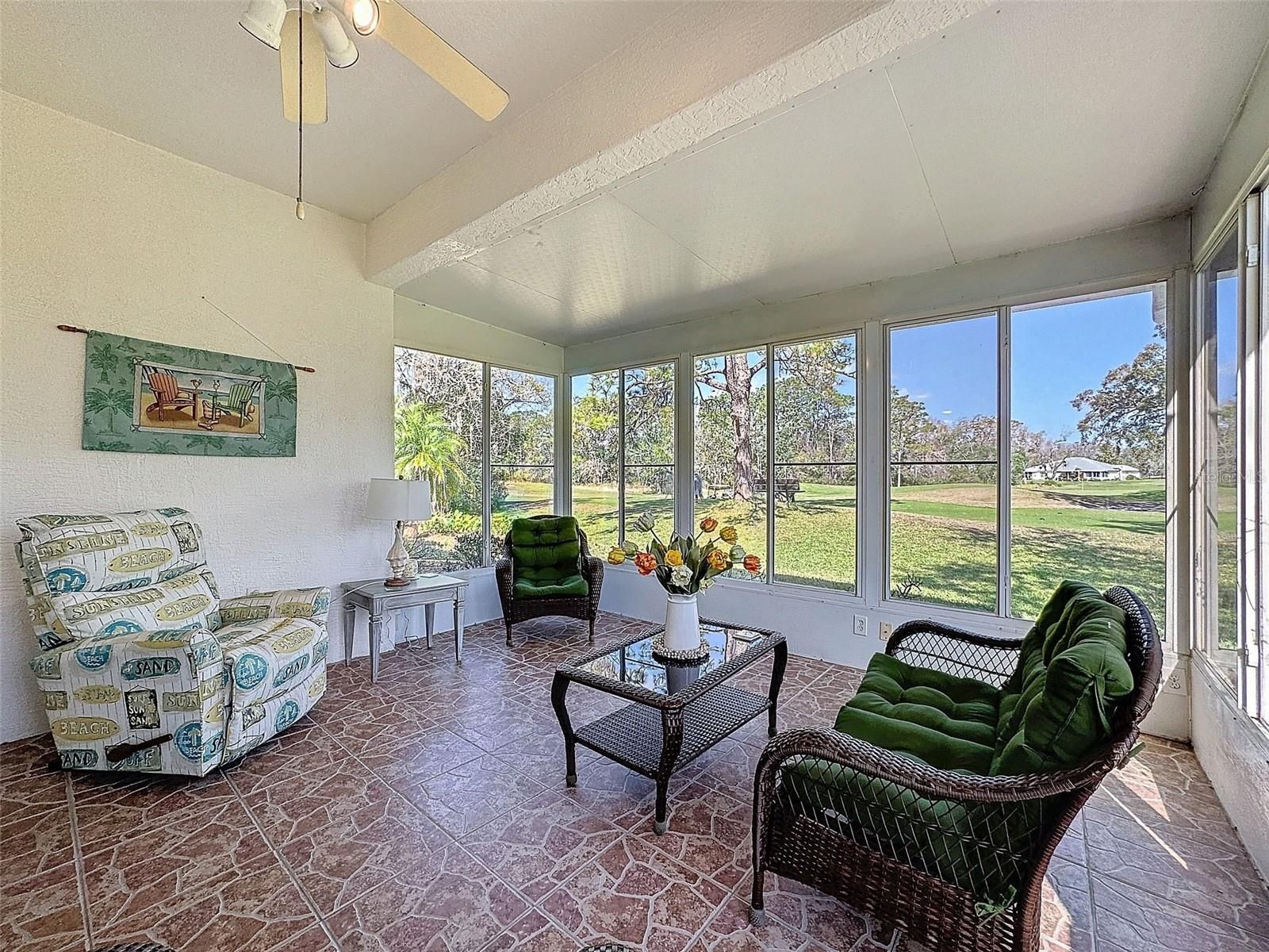 MOTIVATED SELLER! Welcome to a golfer's dream! Located in the coveted 55+ community of the Villas in Summertree, the view of the golf course is spectacular. Stepping into your new home you'll be greeted by a large and inviting kitchen, dining room, and living room where your eyes will be drawn directly to the enclosed lanai and that gorgeous view of the tee off where the reflective windows provide plenty of privacy. 2 split bedrooms adds additional privacy when visitors come to stay. From beautiful flooring to stunning updated bathrooms, from skylights to attic access, there's plenty to love about this home. Roof replaced in 2018 (by association). A/C was replaced in 2020. Double paned, impact resistant windows replaced in 2021. Absolutely no issues from hurricanes Debby, Helene, and Milton! Conveniently located to the Veterans Expressway, U.S. 19, shopping, restaurants, and hospitals. HOA fees include cable, internet, grounds maintenance, painting every few years, and all the amenities which includes a media room, card game room, library, fitness center, pool, jacuzzi, and auditorium where you will enjoy dances, bingo, comedy shows, and more. Don't forget the tennis courts, pickleball, bocci ball, horseshoes, shuffleboard, and the golf course. There's so much to do here you'll never get bored. So, check out the photos, then come see for yourself what this home and community has to offer.