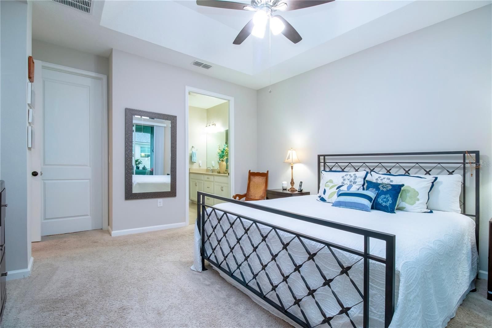 - Ceiling Fan(s), Eat-in Kitchen, High Ceilings, Kitchen/Family Room Combo, Open Floorplan, Main Level Primary, Solid-Wood Cabinets, Split Bedrooms, Stone Counters, Thermostat, Walk-In Closet(s)