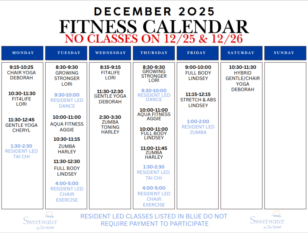 There are plenty of activities available in Sweetwater. Here is a sample of some of the clubs, activities and classes offered here.