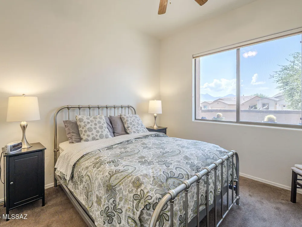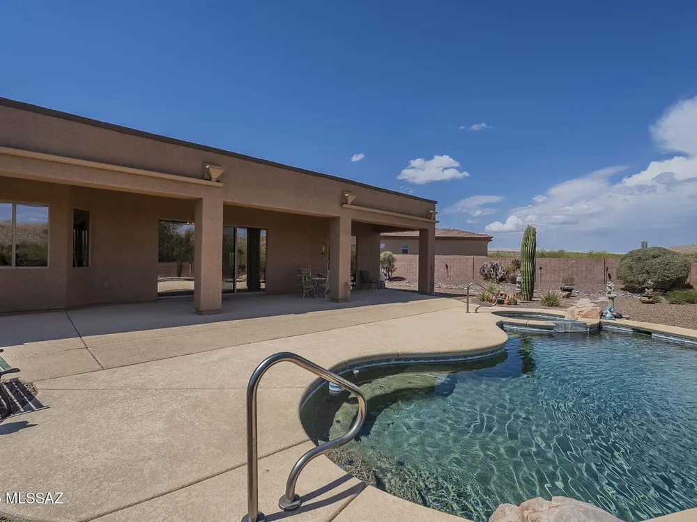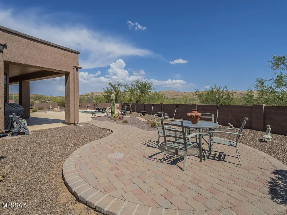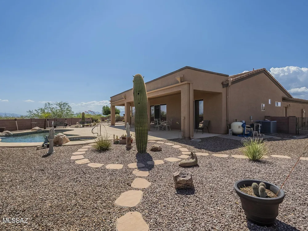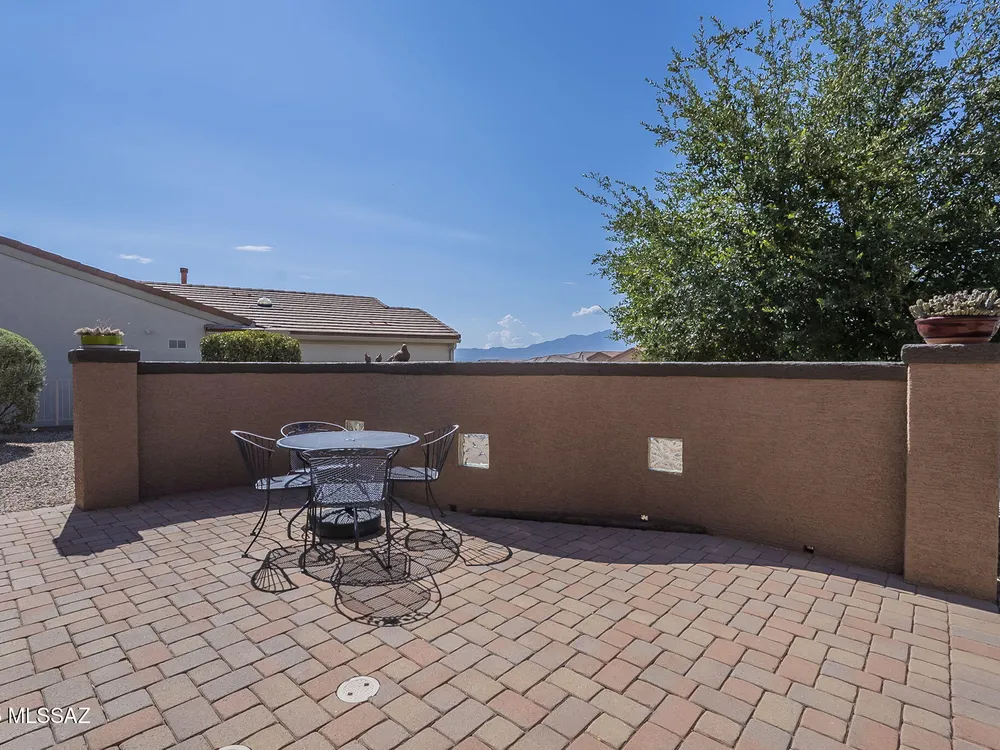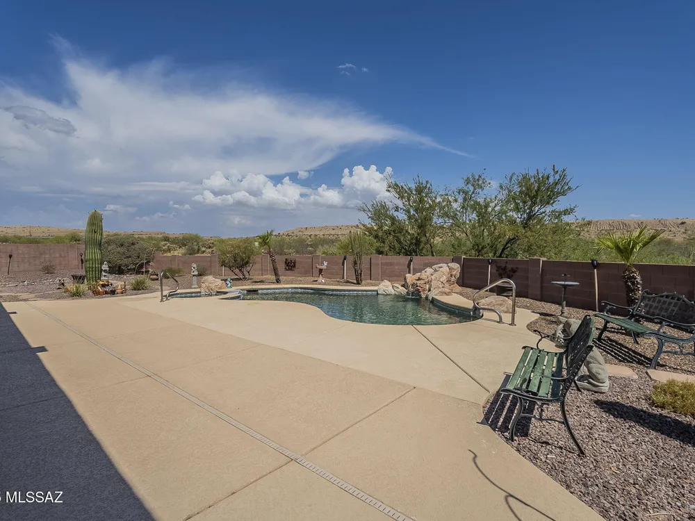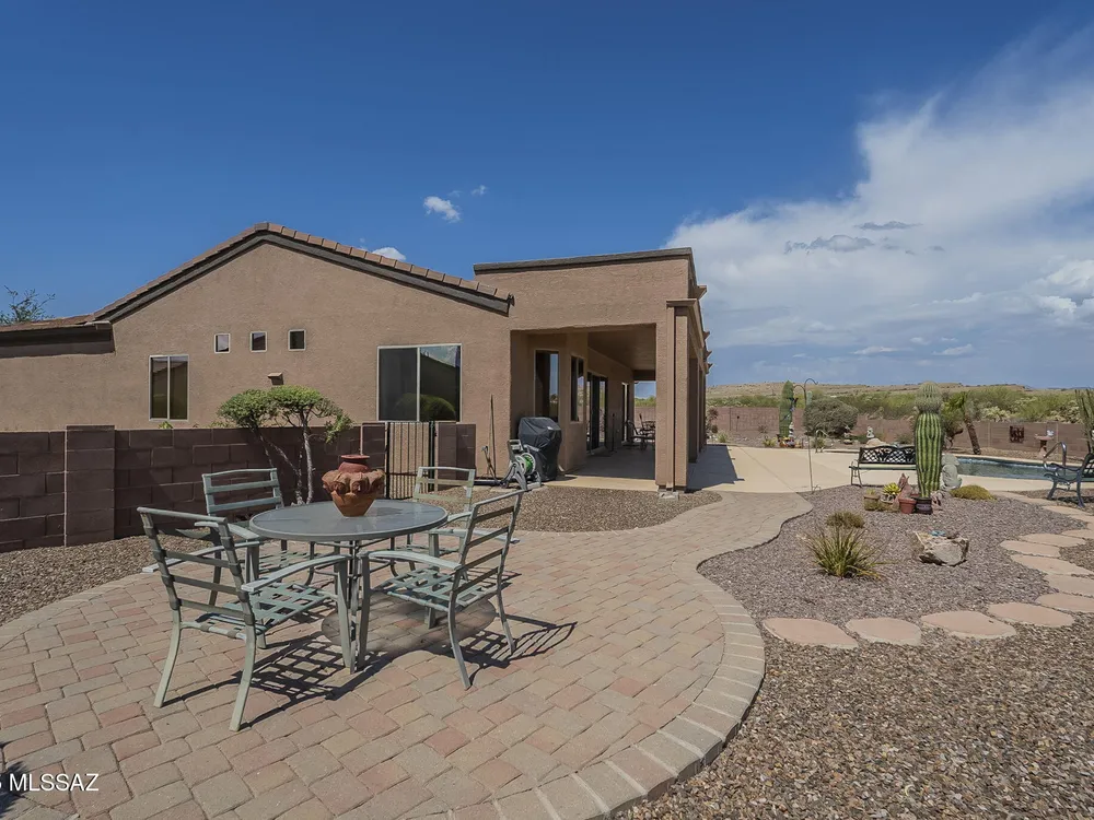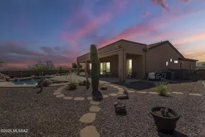 Welcome to your private desert retreat in the highly sought-after 55+ community of Las Campanas at San Miguel in Green Valley, AZ. This beautifully maintained 2-bedroom + den, 2-bath single-family home offers an open great room concept, perfect for both easy living and entertaining. A dramatic 12-foot sliding glass door opens to your backyard oasis, featuring a Pebble Tec, solar-heated pool and spa, fully landscaped with desert-friendly plantings for easy care and year-round beauty. With no rear neighbor, you'll enjoy privacy and uninterrupted views of the nearby foothills. From the back patio and courtyard, take in the ever-changing colors of the Santa Rita Mountains -- a truly breathtaking backdrop to your desert lifestyle.