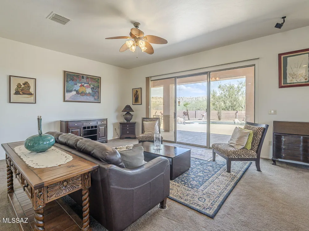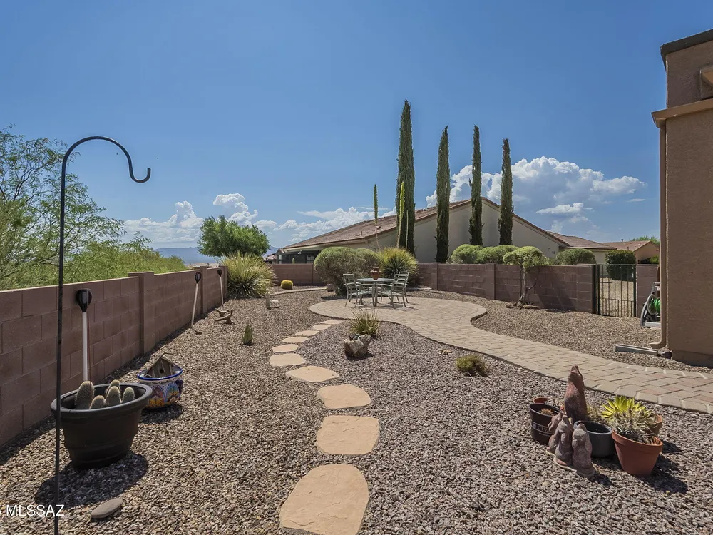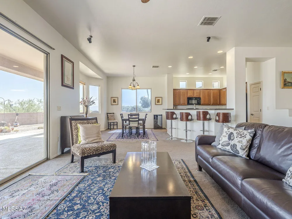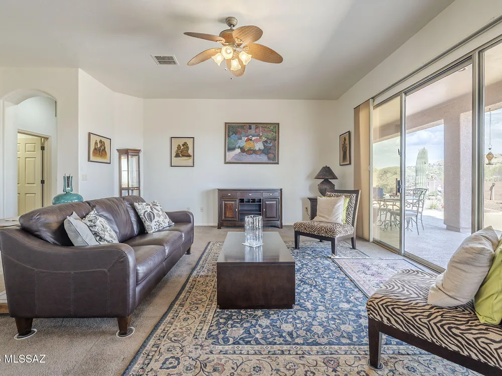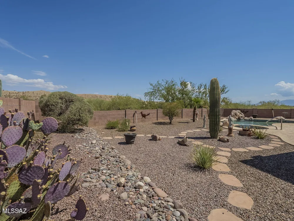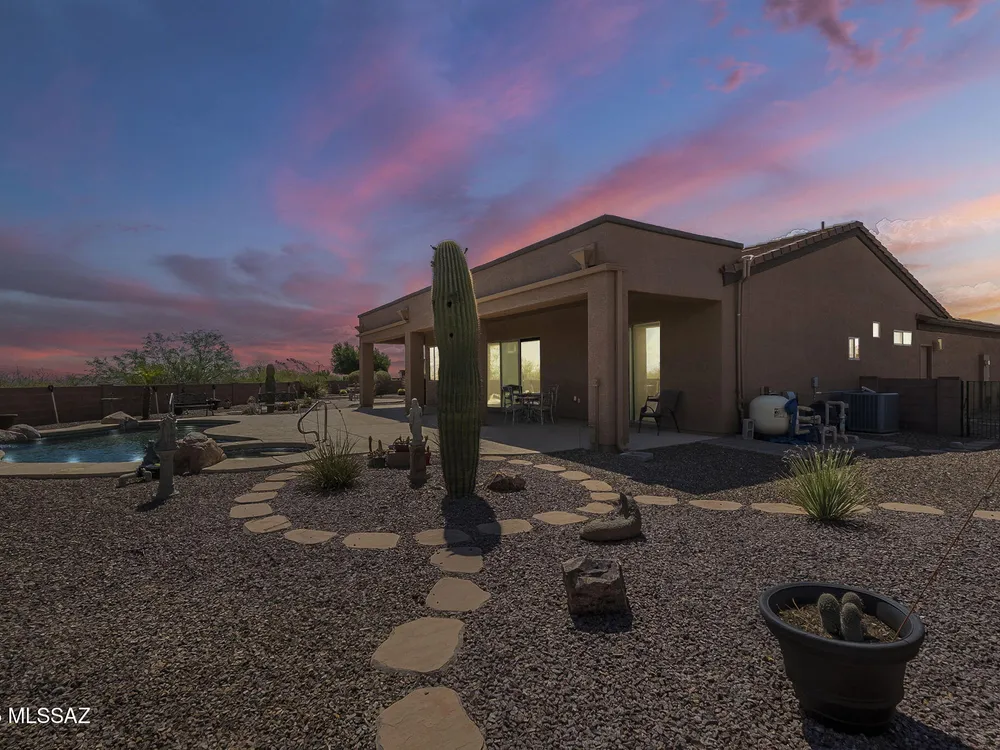 Welcome to your private desert retreat in the highly sought-after 55+ community of Las Campanas at San Miguel in Green Valley, AZ. This beautifully maintained 2-bedroom + den, 2-bath single-family home offers an open great room concept, perfect for both easy living and entertaining. A dramatic 12-foot sliding glass door opens to your backyard oasis, featuring a Pebble Tec, solar-heated pool and spa, fully landscaped with desert-friendly plantings for easy care and year-round beauty. With no rear neighbor, you'll enjoy privacy and uninterrupted views of the nearby foothills. From the back patio and courtyard, take in the ever-changing colors of the Santa Rita Mountains -- a truly breathtaking backdrop to your desert lifestyle.