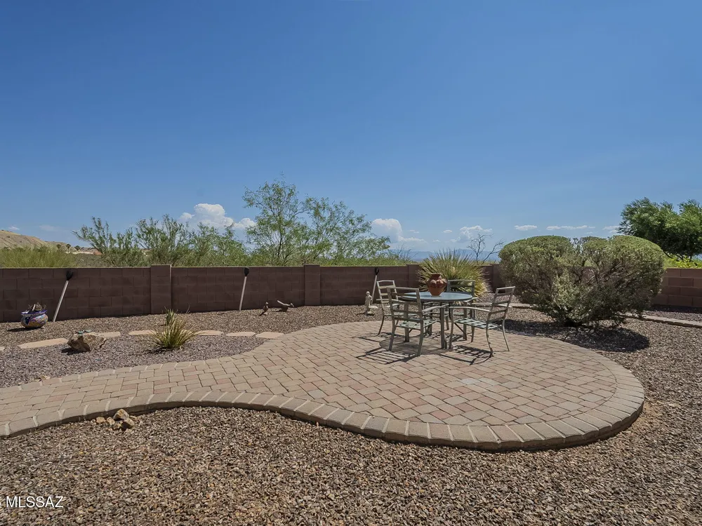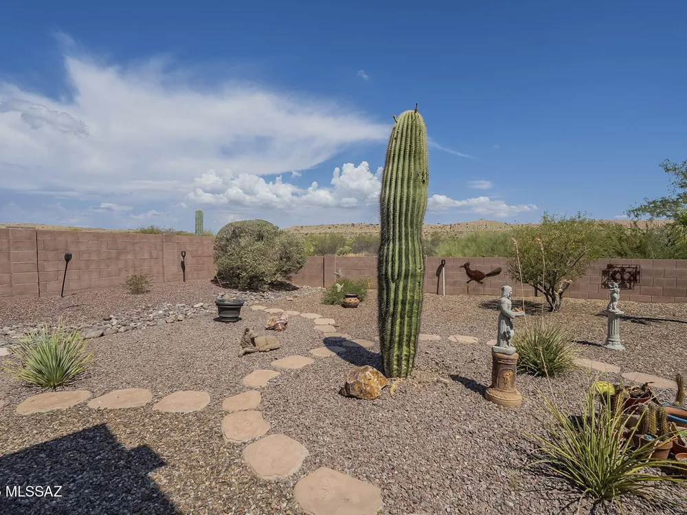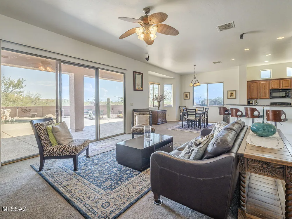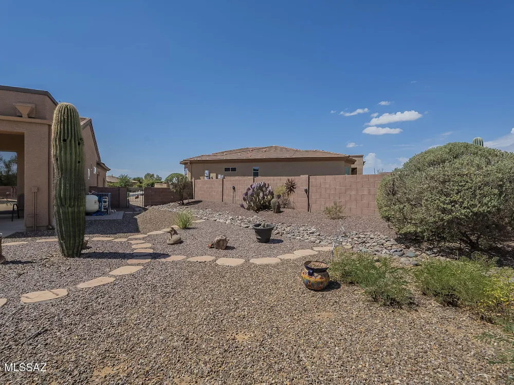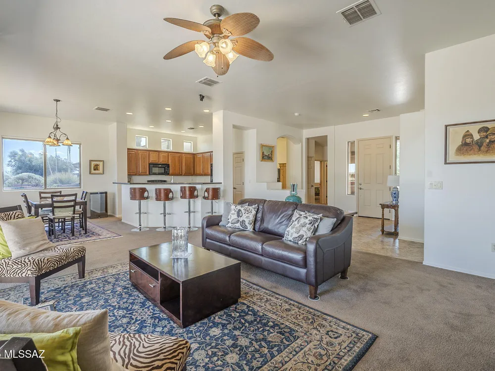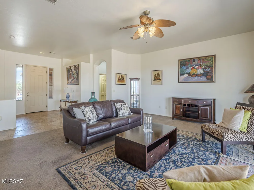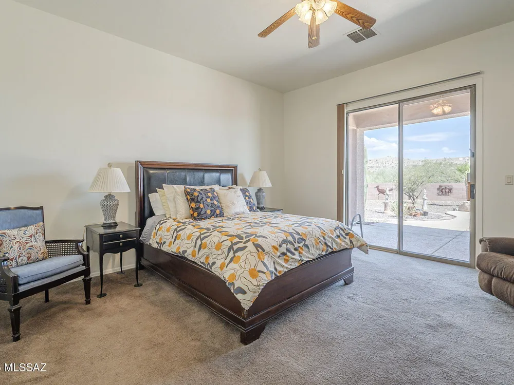 Welcome to your private desert retreat in the highly sought-after 55+ community of Las Campanas at San Miguel in Green Valley, AZ. This beautifully maintained 2-bedroom + den, 2-bath single-family home offers an open great room concept, perfect for both easy living and entertaining. A dramatic 12-foot sliding glass door opens to your backyard oasis, featuring a Pebble Tec, solar-heated pool and spa, fully landscaped with desert-friendly plantings for easy care and year-round beauty. With no rear neighbor, you'll enjoy privacy and uninterrupted views of the nearby foothills. From the back patio and courtyard, take in the ever-changing colors of the Santa Rita Mountains -- a truly breathtaking backdrop to your desert lifestyle.