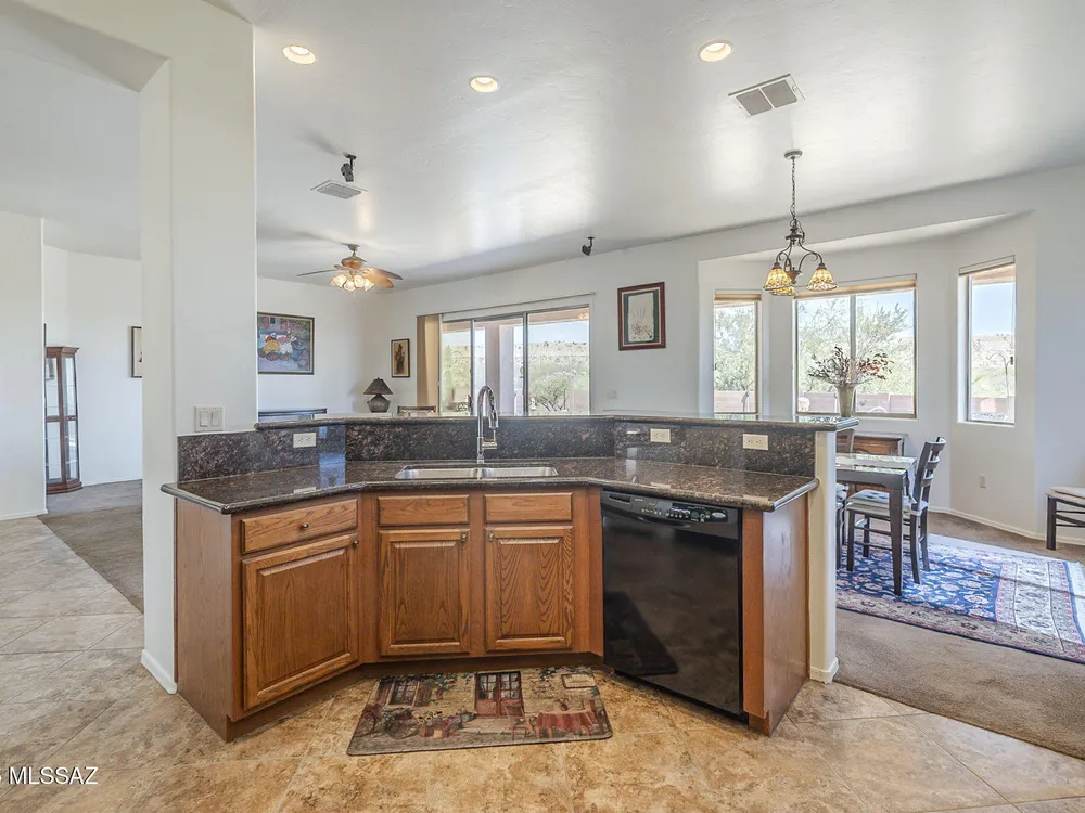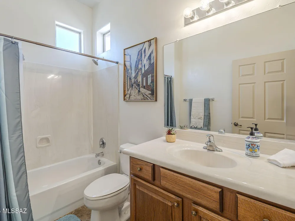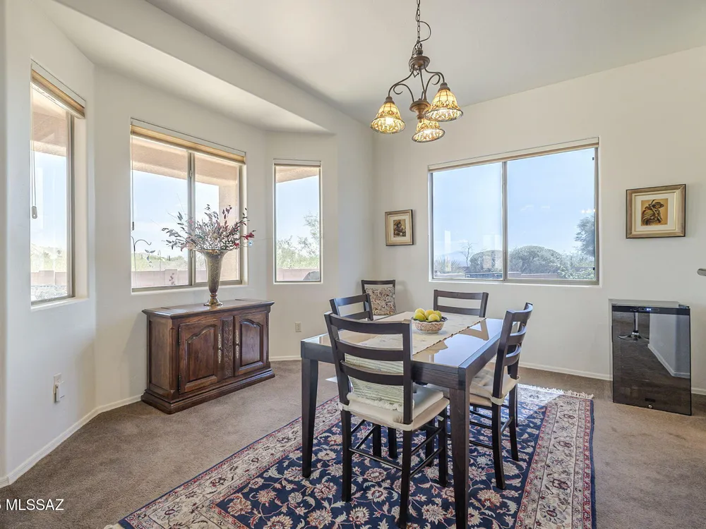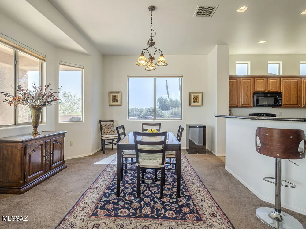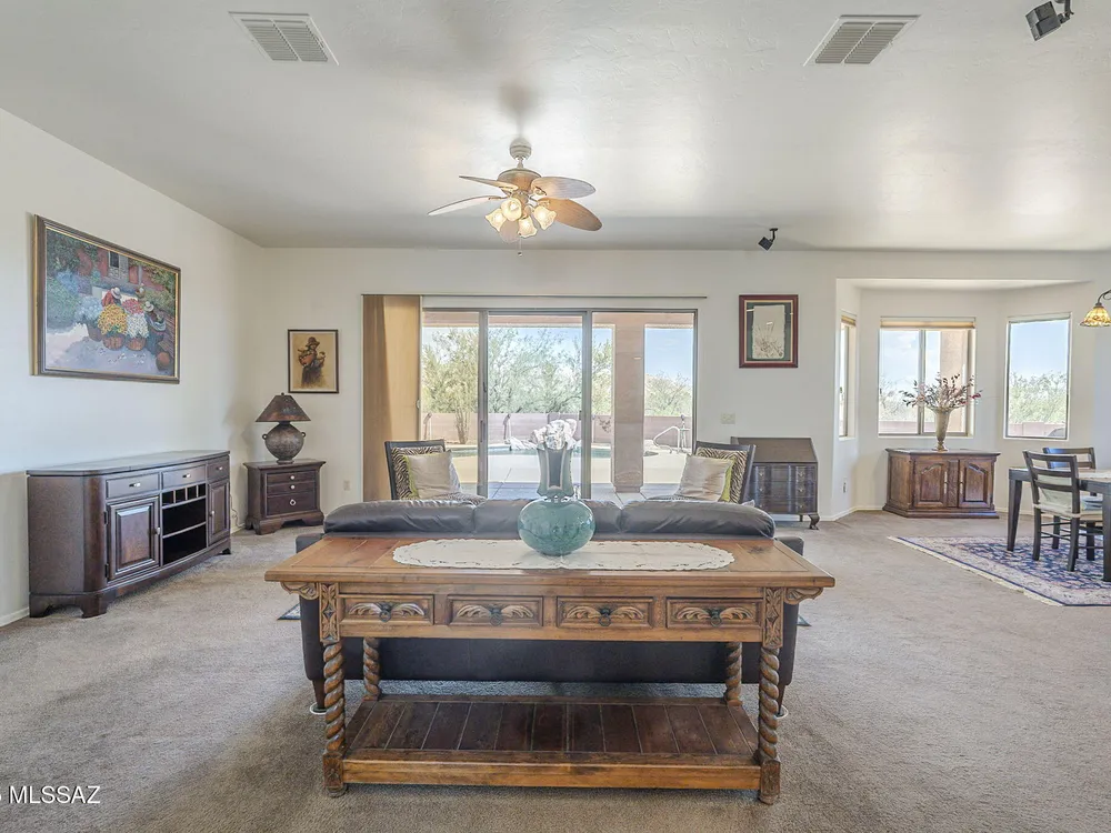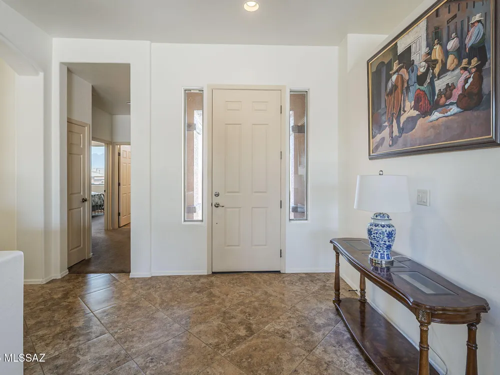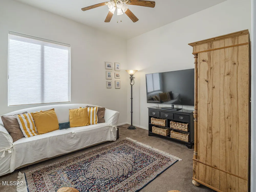 Welcome to your private desert retreat in the highly sought-after 55+ community of Las Campanas at San Miguel in Green Valley, AZ. This beautifully maintained 2-bedroom + den, 2-bath single-family home offers an open great room concept, perfect for both easy living and entertaining. A dramatic 12-foot sliding glass door opens to your backyard oasis, featuring a Pebble Tec, solar-heated pool and spa, fully landscaped with desert-friendly plantings for easy care and year-round beauty. With no rear neighbor, you'll enjoy privacy and uninterrupted views of the nearby foothills. From the back patio and courtyard, take in the ever-changing colors of the Santa Rita Mountains -- a truly breathtaking backdrop to your desert lifestyle.
