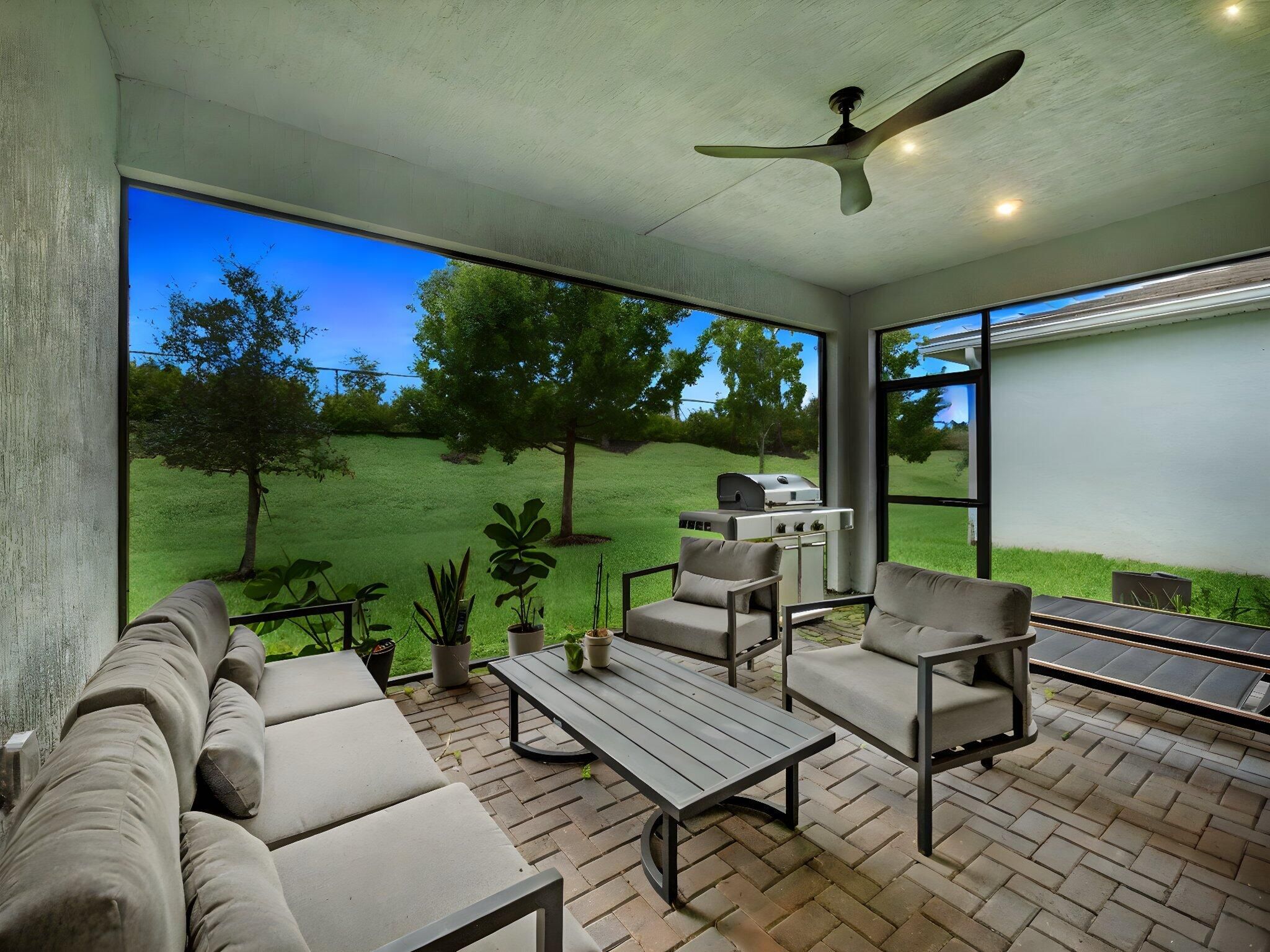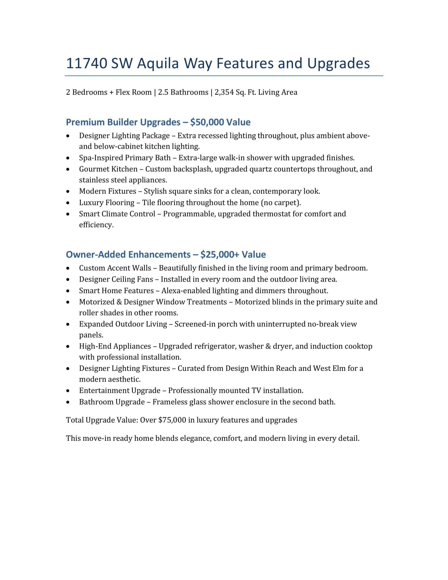 OVER $75,000 in UPGRADES! This exceptional, barely lived-in residence is located within the prestigious 55+ community of Telaro at Tradition and presents in immaculate, like-new condition. Thoughtfully curated with an extensive collection of high-end upgrades, the home offers refined elegance and effortless modern living throughout. Timeless tile flooring flows seamlessly through every room—no carpet—complementing the open-concept design that is ideal for both entertaining and everyday comfort. The chef-inspired kitchen is a true centerpiece, featuring upgraded quartz countertops, a striking designer backsplash, premium stainless steel appliances, a glass-front refrigerator, wall ovens, an induction cooktop, and custom cabinetry lighting both above and below for a warm, sophisticated glow Additional enhancements include abundant recessed lighting, a programmable smart thermostat, and distinctive designer fixtures from Design Within Reach and West Elm. The spa-like bathrooms are beautifully finished with quartz surfaces, modern square sinks, an expansive walk-in shower, and upgraded glass in the guest bath for a sleek, contemporary feel. Designer accent walls in the living area and bedroom add architectural interest, while Alexa-integrated lighting with dimmers creates customizable ambiance throughout. Every roomincluding the screened-in porchis outfitted with stylish ceiling fans. Window treatments are equally refined, featuring motorized blinds in the primary bedroom and elegant roller shades in the main living spaces. Completing the home's turnkey appeal are a top-of-the-line washer and dryer and a mounted television, allowing for an effortless move-in experience. This residence is the perfect blend of luxury, technology, and timeless design. Enjoy year-round outdoor living on the screened patio featuring seamless flooringperfect for relaxing or entertaining. Residents of Telaro enjoy resort-style amenities including a clubhouse, pool, fitness center, and scenic walking trails. The HOA includes cable, internet, lawn care, security, and a full calendar of community events. Ideally located near Cleveland Clinic, top medical facilities, the upcoming Heart of Tradition shopping center, and the future Stars & Stripes Sports Park.