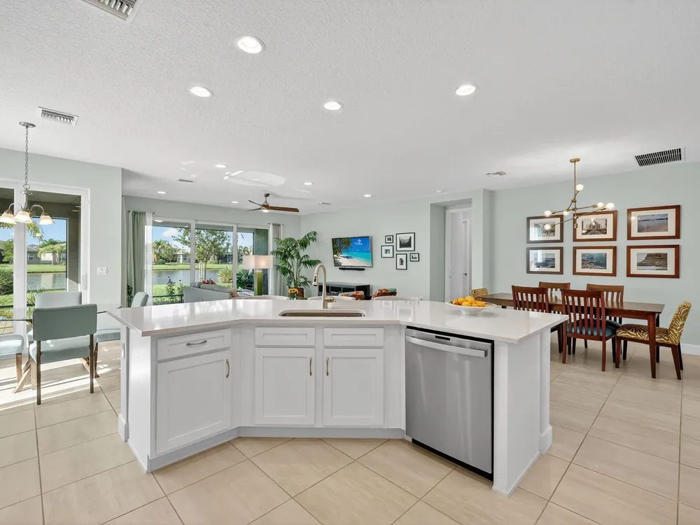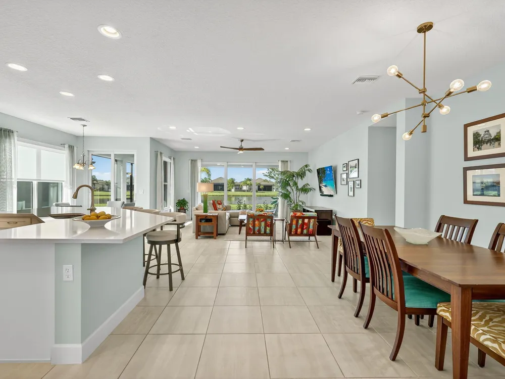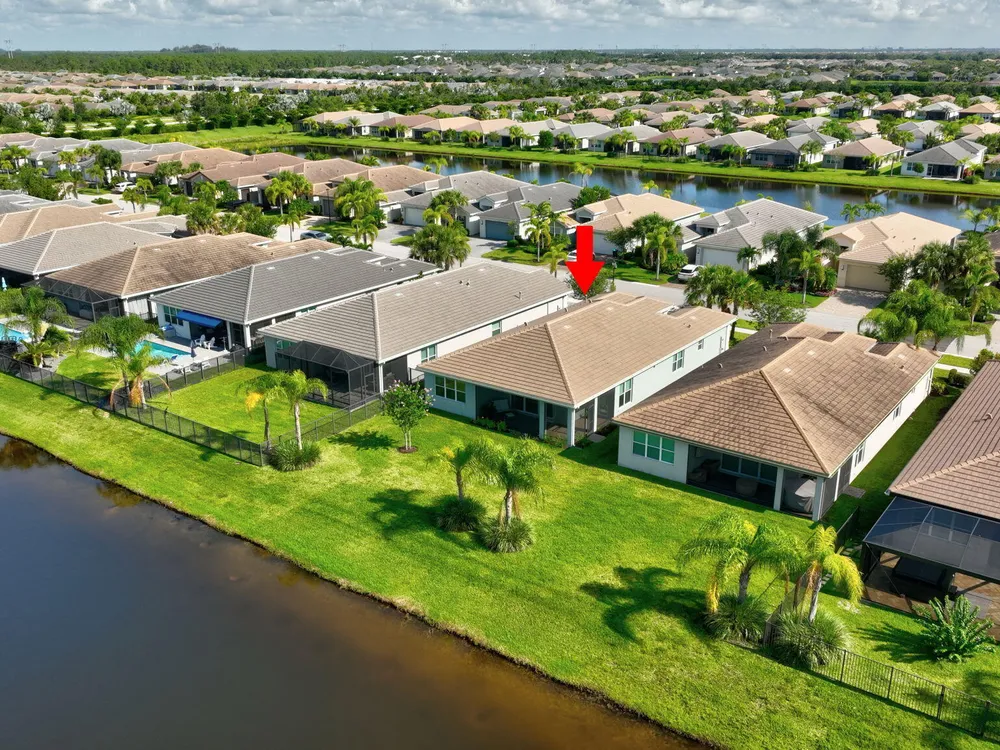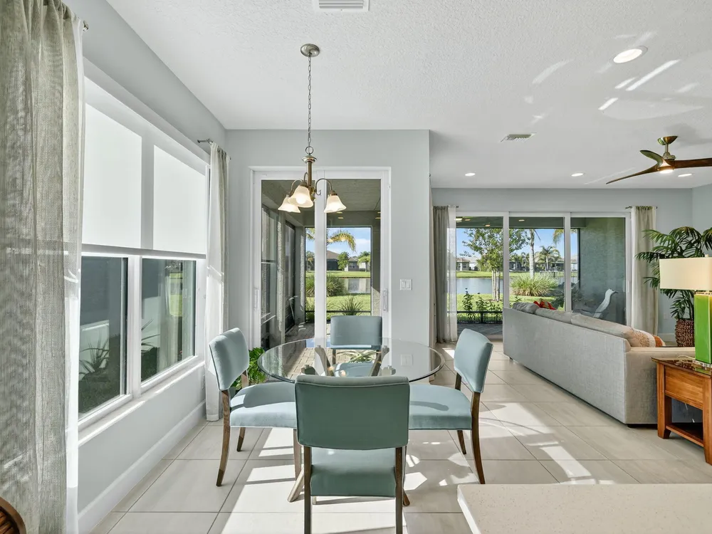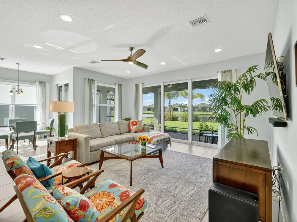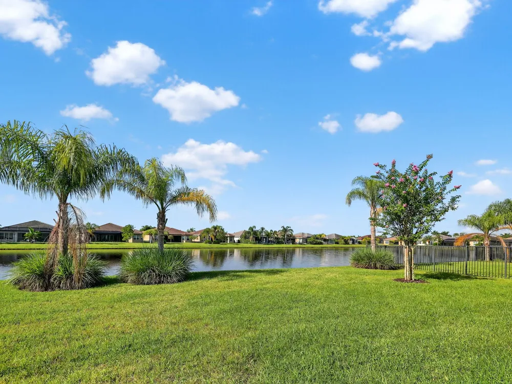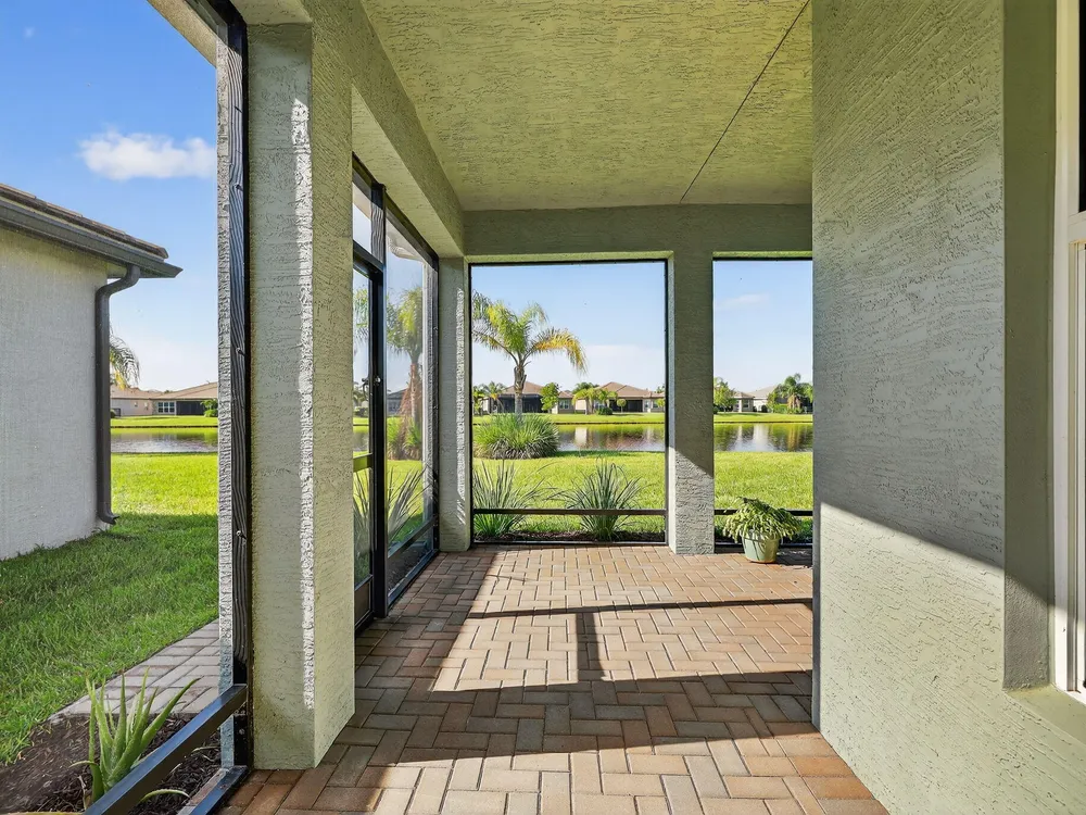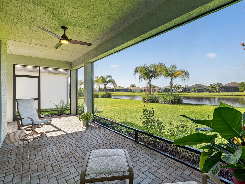 Welcome to your dream home in the sought-after 55+ community of Valencia Cay at Riverland! This beautifully designed Bimini Model sits on an oversized premium lakefront lot, offering breathtaking water views and the perfect blend of luxury, comfort, and lifestyle. Featuring 3 spacious bedrooms, 3 full bathrooms, a den/flex room, and over 2,358 sq. ft. of living space, this open-concept layout is ideal for entertaining and everyday living. The gourmet kitchen boasts quartz countertops, stainless steel appliances, a large island, and upgraded cabinetry, seamlessly flowing into the expansive great room and dining area, all overlooking the large, covered patio and sparkling lake with a south exposure.