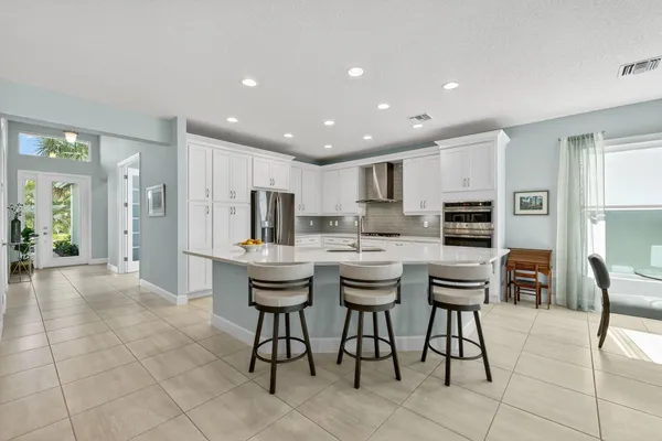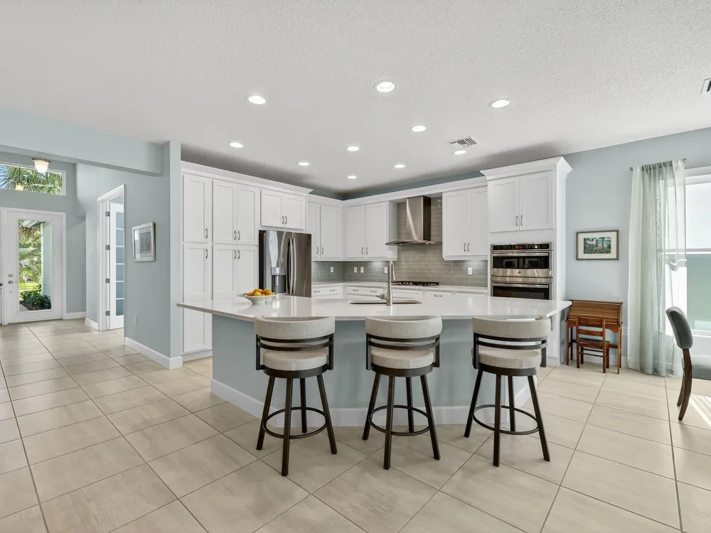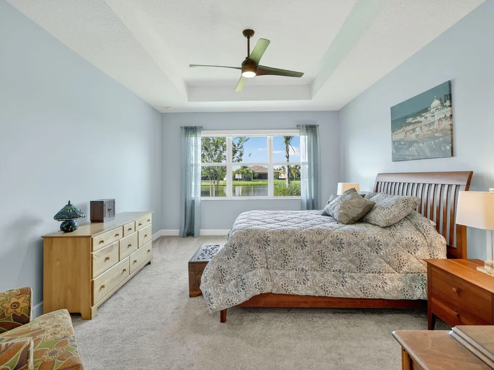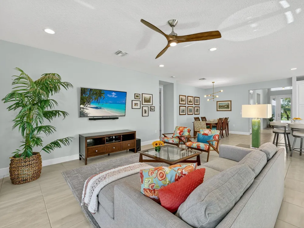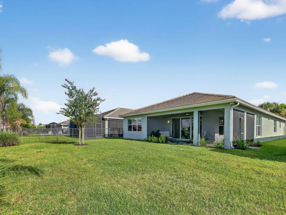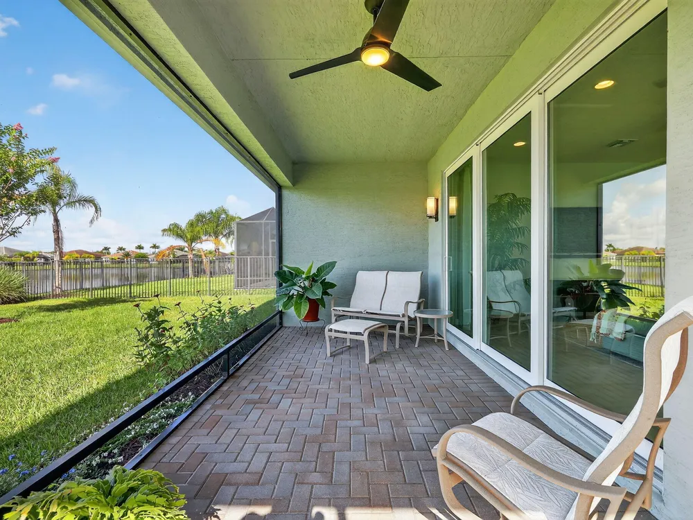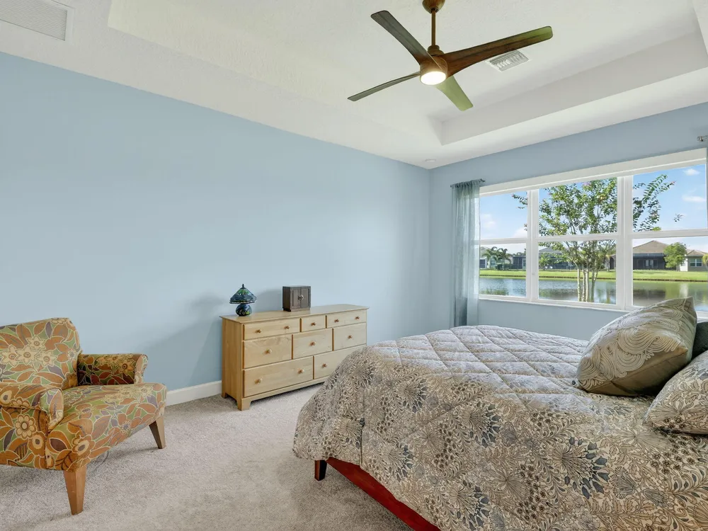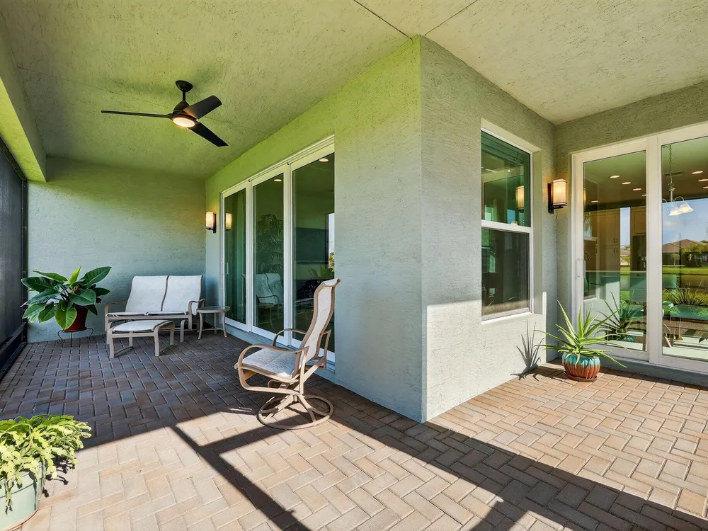 Welcome to your dream home in the sought-after 55+ community of Valencia Cay at Riverland! This beautifully designed Bimini Model sits on an oversized premium lakefront lot, offering breathtaking water views and the perfect blend of luxury, comfort, and lifestyle. Featuring 3 spacious bedrooms, 3 full bathrooms, a den/flex room, and over 2,358 sq. ft. of living space, this open-concept layout is ideal for entertaining and everyday living. The gourmet kitchen boasts quartz countertops, stainless steel appliances, a large island, and upgraded cabinetry, seamlessly flowing into the expansive great room and dining area, all overlooking the large, covered patio and sparkling lake with a south exposure.