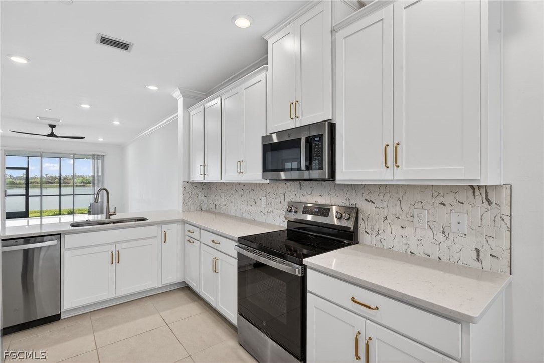 Beautiful 3 BEDROOM, 2 BATHROOM, GROUND FLOOR unit with a panoramic LAKE VIEW, located in the highly sought after community of Esplanade Lake Club. Enjoy LUXURY living in this open-layout design, including a large eat-in kitchen with breakfast nook. Enjoy the comforts of a Newer Unit, with sweeping views of the enormous, lush lake and ample natural light. Multiple upgrades, including crown molding, additional ceiling fans and 3rd BEDROOM with glass French doors and closet (not featured in any other unit in this community). Enjoy your favorite book or morning coffee on the front porch or spacious screened lanai. This unit includes a detached one car garage that offers private storage and parking, as well as the additional convenience of a private driveway. Take advantage of the exclusive amenities at Esplanade Lake Club, one of the most sought-after new-build communities in Southwest Florida, on the shores of the prestigious Lake Como. Unwind at the community amenity center, with a resort-style pool, outdoor Bahama Bar and Grill restaurant, a MASSAGE TREATMENT ROOM for spa services, sports courts featuring tennis, pickleball, and bocce ball, walking trails, pet parks, kayak and paddleboard launch, and space for residents to utilize for socializing, gaming and more! All of this is within the comfort and privacy of a gated, guarded, community. Minutes away from the SWFL International Airport, Gulf Coast Town Center, beaches, hiking trails, spring training sites, area hospitals and much more! COME ENJOY THIS BOATERS’ COMMUNITY & Live the FLORIDA RESORT LIFESTYLE. “Some photos have been virtually staged”