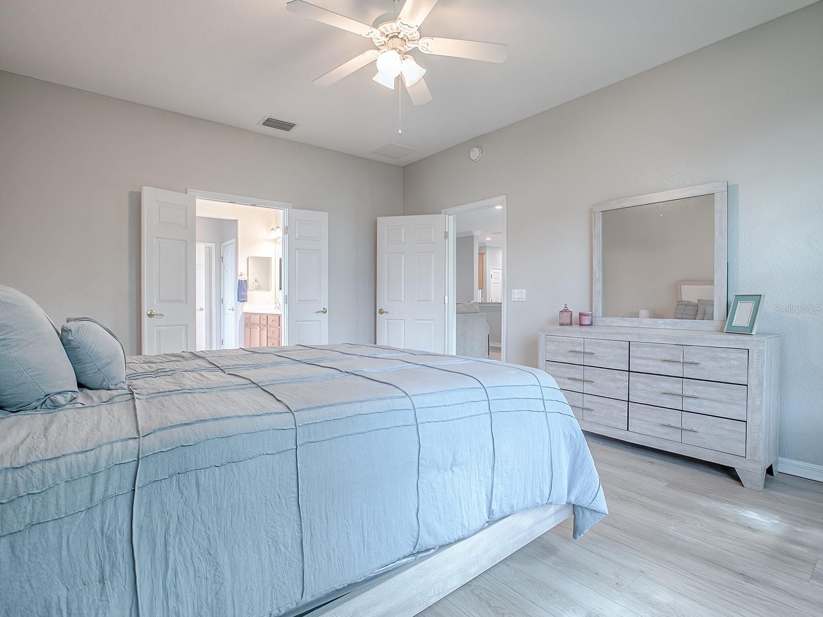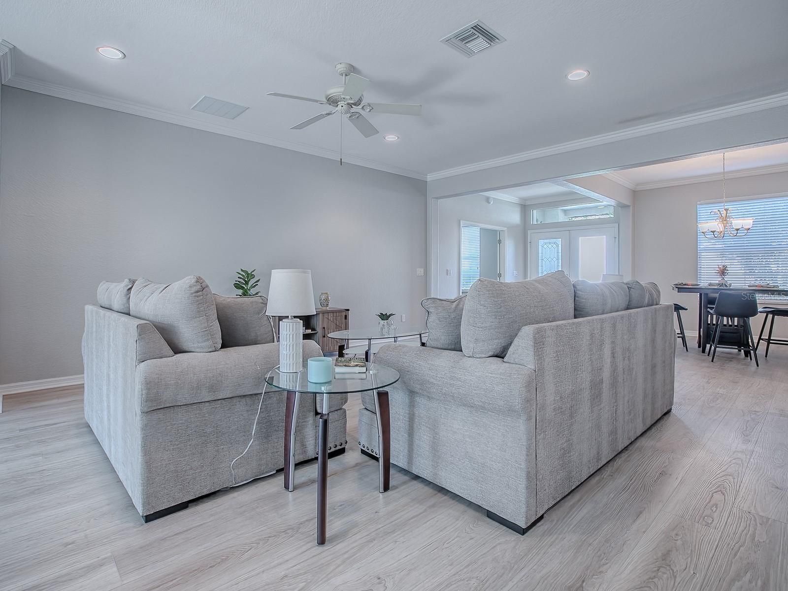 - Ceiling Fan(s), Crown Molding, Eat-in Kitchen, High Ceilings, Living/Dining Room, Open Floorplan, Split Bedrooms, Walk-In Closet(s)
