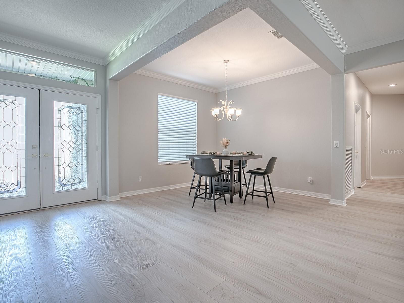 Welcome to Del Webb Spruce Creek Golf & Country Club, a charming 55-plus gated community perfectly situated along the sought-after 441 corridor. This location offers a gateway to a host of adventures, whether you're taking a quick trip on the interstate, visiting the renowned World Equestrian Center in Ocala, enjoying a day out on the tranquil Lake Weir, or indulging in the vibrant entertainment and diverse facilities of The Villages nearby. Everything you need is just a short distance away, enhancing the allure of this delightful golf community. That's not all that there is to offer of course with a fantastic restaurant to attend, indoor and outdoor pools, community centers that hold a wide variety of activities, fitness centers, baseball field, tennis, walking trials dog parks and so much more. With its exceptional curb appeal, this home invites you to experience its beauty and luxury. It features meticulously landscaped gardens, a striking brick paver driveway, and an elegant block-and-stucco exterior, all accented by a majestic double-door entrance framed by stately palm trees. The tandem golf cart garage that pairs with the already spacious garage is sure to catch your attention. When you are thinking of savings, the 2024 roof will keep the figures where they belong or leave plenty of room in the budget for the beautiful decor you want to outfit this spectacular home. Come inside to discover this Johnstown model that exemplifies an incredibly functional floor plan. The inviting entry foyer opens into a cozy front den and a formal dining room, seamlessly flowing into a spacious living area designed for comfort and warmth. The heart of the home, the kitchen, boasts a center island and an abundance of cabinetry, making it a perfect hub for hosting memorable gatherings. Privacy is ensured through a smartly designed split-bedroom layout, with the guest area thoughtfully separated from the main living spaces and from each other as well. The addition of crown molding enhances the grandeur of the high ceilings, while luxury vinyl plank flooring adds an elegant modern touch to this stunning residence. Embrace the outdoors in style with a generously extended lanai, providing a versatile space for entertaining. It opens into an initial enclosed zone, which then leads to a covered, screened lanai, allowing you to enjoy fresh air while staying sheltered from the elements. This home is truly a must see...there is so much that it offers to even the most scrutinizing person. Be sure to make an appointment to experience all of the ways it will be perfect for you.