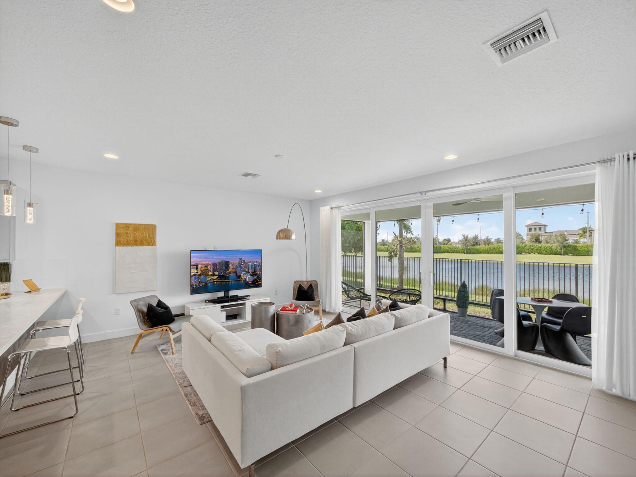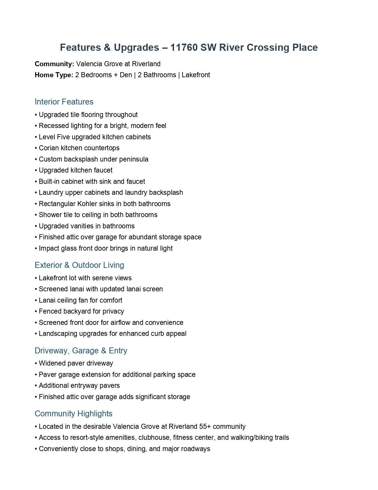 Welcome to this impeccably upgraded 2-bedroom plus den that can be converted into a bedroom, 2-bathroom lakefront home located in the highly sought-after Valencia Grove at Riverland community. Thoughtfully designed for both comfort and style, this residence offers a blend of modern finishes and functional upgrades that make it truly stand out. The impact glass front door fills the entryway with natural light, leading into an open-concept living space adorned with upgraded tile flooring throughout, recessed lighting, and a spacious layout ideal for entertaining or everyday living. The gourmet kitchen features level five upgraded cabinets, sleek Corian countertops, a custom backsplash under the peninsula, and an upgraded kitchen faucet. Additional touches such as the built-in cabinet with sink and faucet, laundry upper cabinets, and coordinating laundry backsplash enhance both convenience and aesthetic appeal. The bathrooms have been beautifully upgraded with rectangular Kohler sinks, elegant vanities, and shower tile extending all the way to the ceiling, providing a spa-like atmosphere. Outdoor living shines with a screened lanai featuring an updated screen enclosure and ceiling fan, perfect for relaxing while enjoying tranquil lake views. The fenced backyard and upgraded landscaping create a private oasis, while the widened paver driveway, paver garage extension, and additional entryway pavers contribute to the home's impressive curb appeal. Practical upgrades include a screened front door, finished attic over the garage offering abundant storage, and thoughtful enhancements throughout the home that balance style with functionality. Located within Valencia Grove at Riverland, residents enjoy resort-style amenities, scenic walking and biking trails, and an active 55+ lifestyle. With its modern upgrades, serene lakefront setting, and exceptional attention to detail, this home is the perfect combination of luxury and comfort.
