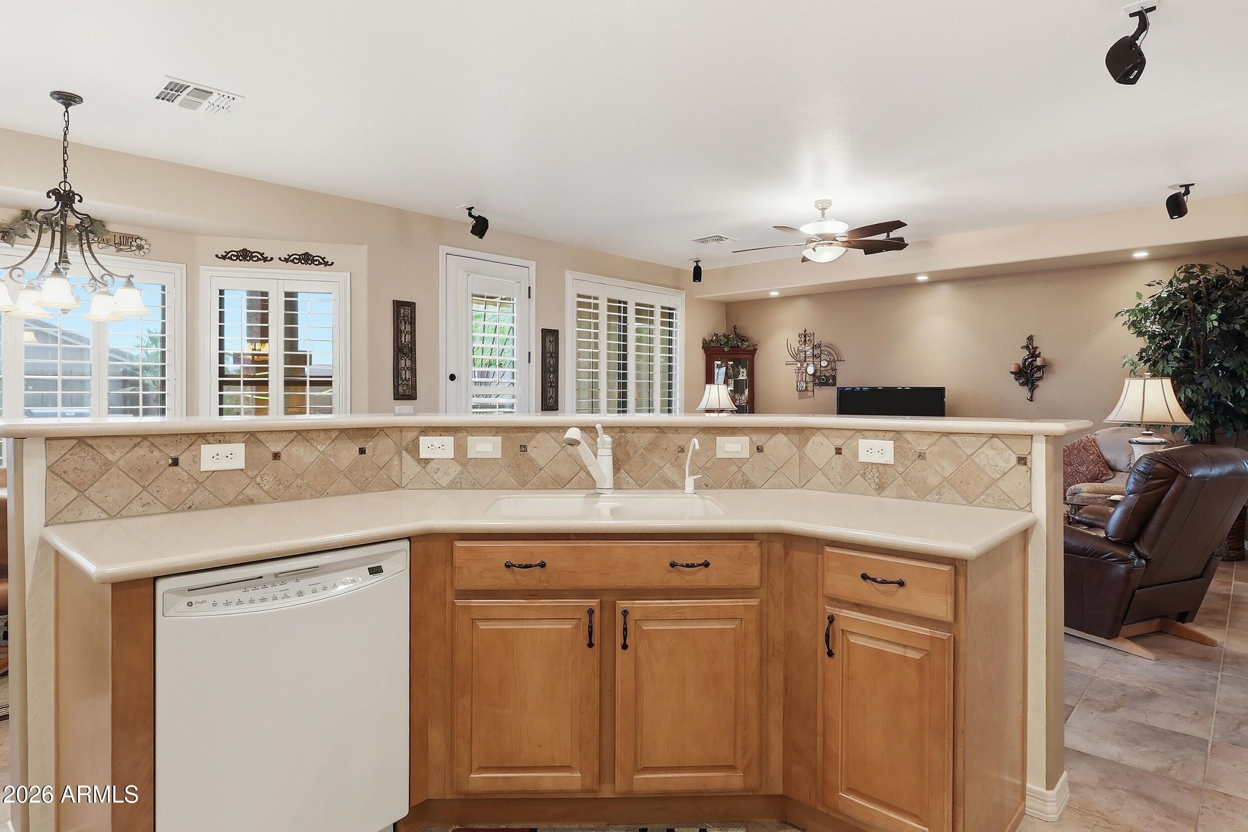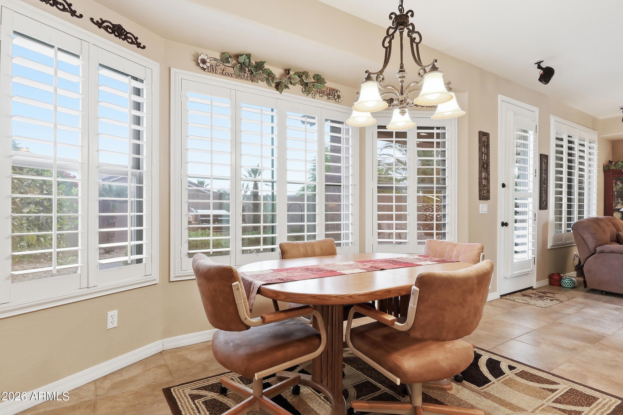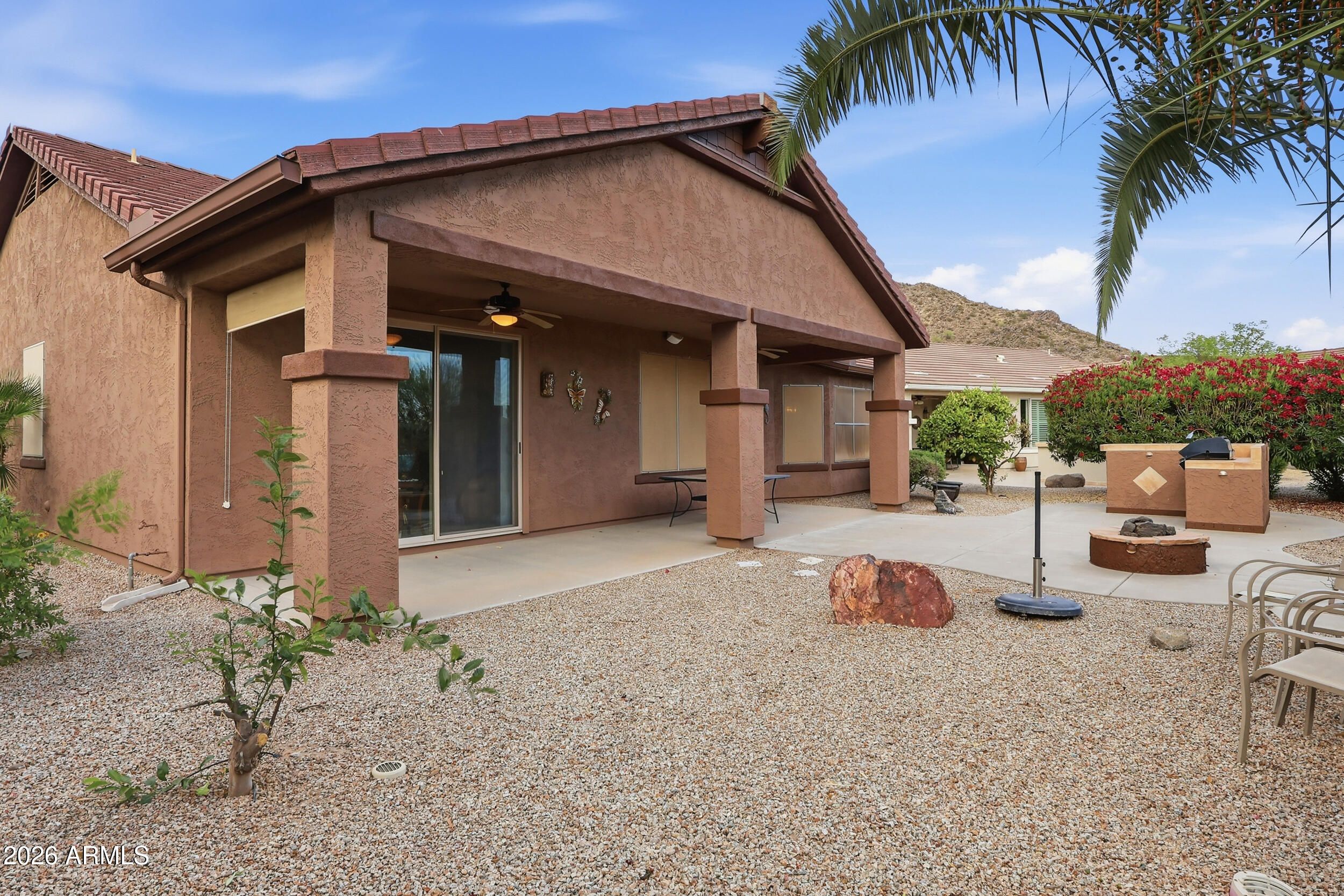 Well-maintained and move-in-ready Ledgestone model in gated Solera at Johnson Ranch. Lightly lived in as a seasonal home, offering a clean and comfortable feel throughout. The kitchen features an oversized island, Corian counters, tile backsplash, and ample cabinet storage. Plantation shutters, neutral flooring, and a functional layout create an easy everyday flow. The backyard is designed for low-maintenance outdoor living with a covered patio, gas firepit, and built-in BBQ. The exterior has been freshly painted. Home is being sold furnished, offering a true turnkey opportunity. Enjoy Solera's golf course community with clubhouse, heated pool/spa, fitness center, and activities.