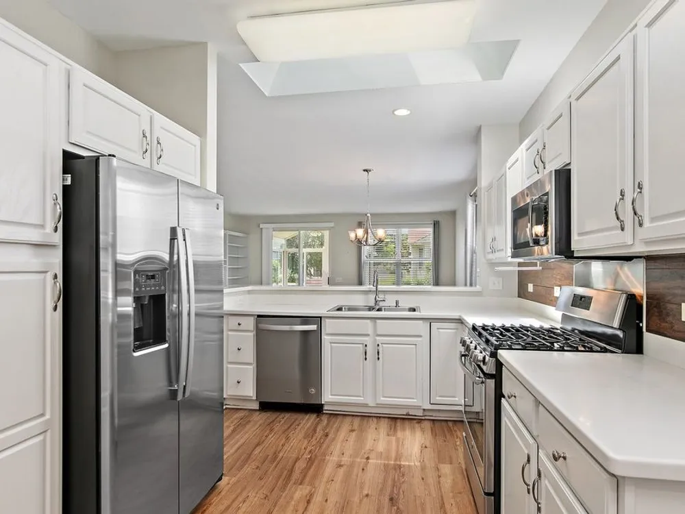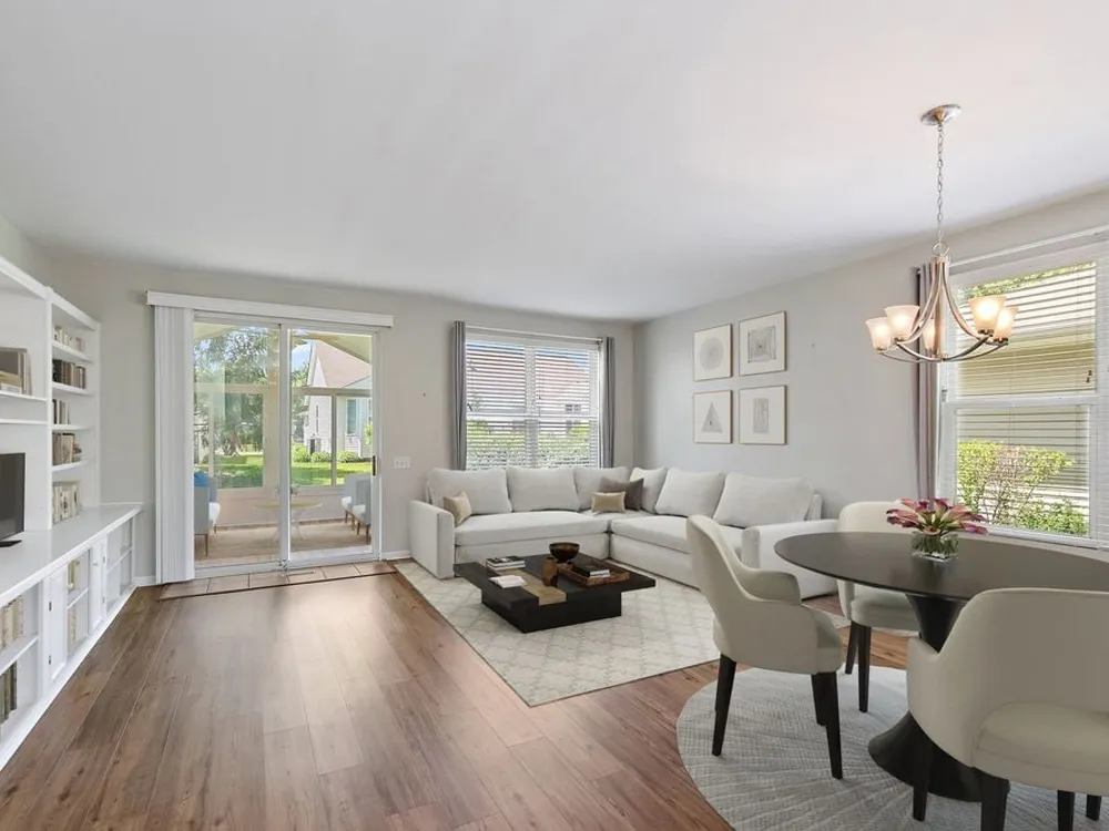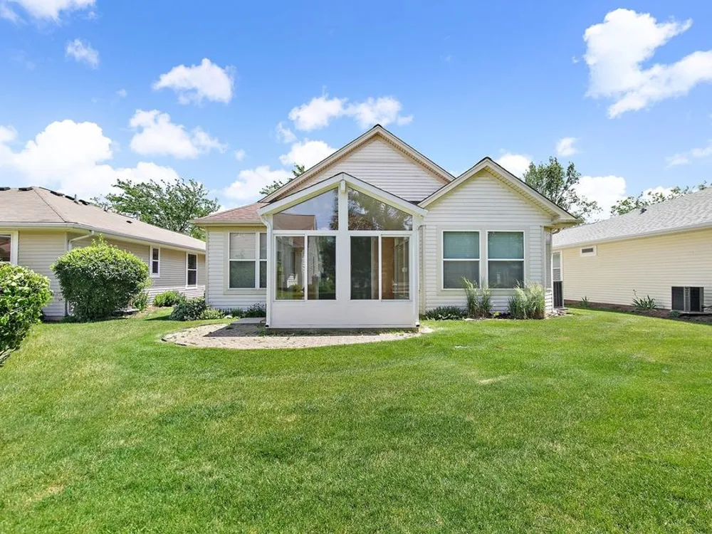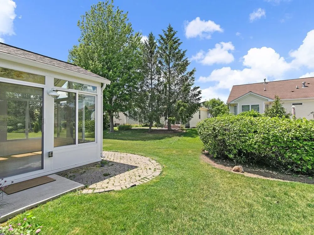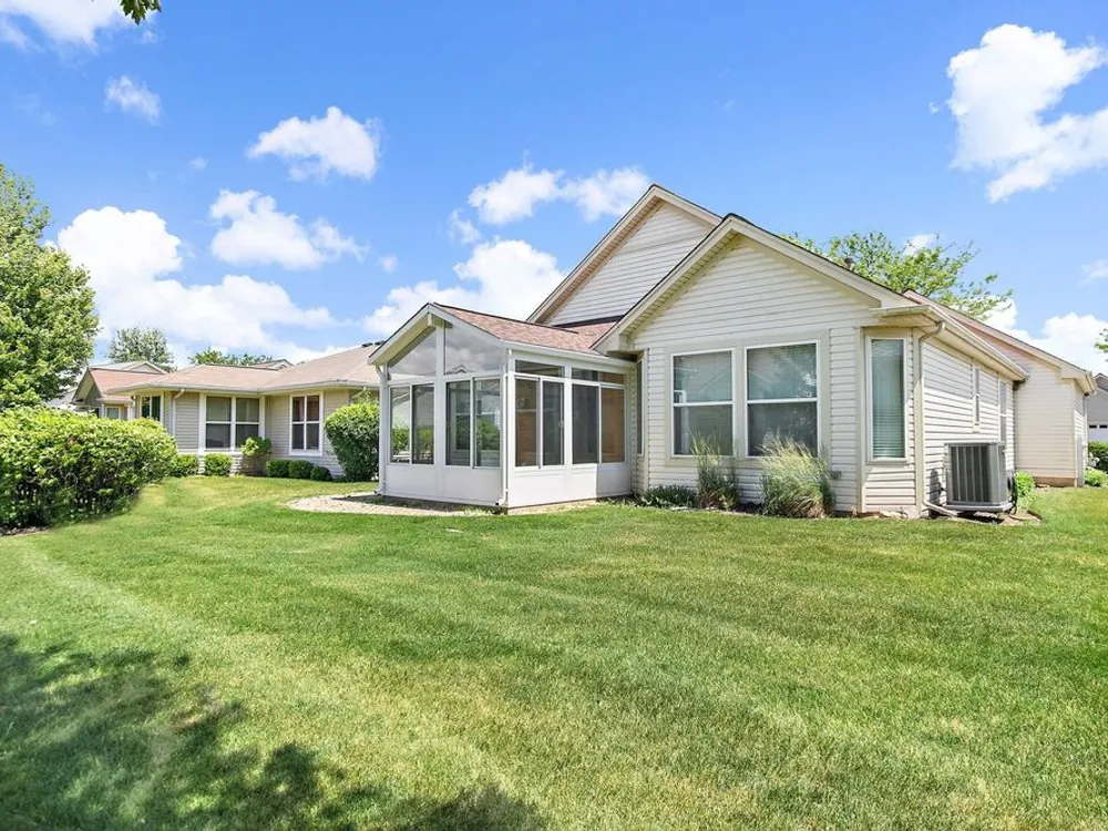 Don't miss your chance to enjoy resort-style living in one of the area's top 55+ communities, offering pools, tennis courts, an indoor track, fitness centers, on-site dining, clubs, a theater, and so much more! Home has had only 2 owners! Step inside and be welcomed by all new flooring that flows seamlessly throughout the home. The kitchen is bright and functional, featuring all stainless steel appliances, a peninsula bar, and a skylight that fills the space with natural light. Just off the kitchen is a cozy eating area-ideal for casual meals. The spacious living room and dining room are combined into one open area, perfect for entertaining or relaxing, with built-in shelving adding character and storage. From here, step into the sunroom through sliding glass doors, where vaulted ceilings and a ceiling fan create a light and airy atmosphere. The sunroom offers direct access to the backyard's brick paver patio, perfect for outdoor enjoyment. The primary bedroom features a walk-in closet and a private en suite bathroom with a standing shower. The second bedroom offers high ceilings and wood laminate flooring, while the full hallway bathroom includes both a tub and shower combo. A dedicated laundry room off the oversized garage adds convenience to everyday living. Extra storage space is available above the garage. Newer mechanicals and appliances in 2020.