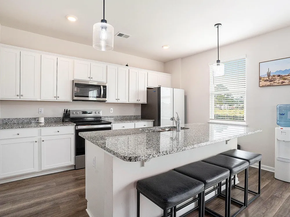 - Breakfast Bar, Kitchen Island, Stainless Steel Appliances, Solid Surface Counters