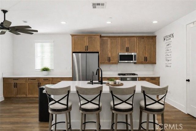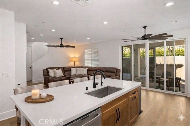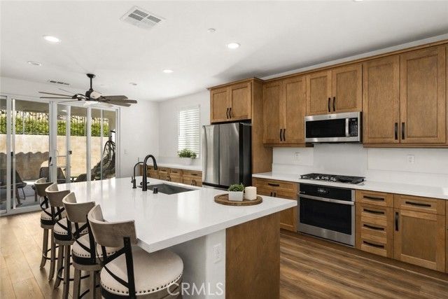 Freshly reduced to $649,988, this 2022-built home in guard-gated Terramor offers a rare combination of newer construction, flexible living space, and fully paid solar. Inside, the open-concept layout is designed for modern living, with upgraded flooring, a fireplace, built-in speakers, wired ethernet, and a spacious great room that connects seamlessly to the kitchen and dining areas. The kitchen is upgraded with quartz countertops, GE Profile stainless steel appliances, soft-close cabinetry, and a generous pantry. A first-floor flex room with closet offers an easy option for a fourth bedroom, office, or guest space. Upstairs, the primary suite includes a walk-in closet and large walk-in shower, along with two additional bedrooms, including one with its own walk-in closet. A full laundry room with sink and storage adds everyday convenience. The backyard is thoughtfully designed for low-maintenance enjoyment, with pavers, artificial turf, and a covered patio with gas hookup for relaxing or entertaining. Additional features include epoxy garage floors, EV charging capability, water softener, drinking water filtration, tankless water heater, and energy-efficient systems throughout. Located within the guard-gated Terramor community, residents enjoy access to resort-style amenities, parks, trails, dog parks, and community events. Move-in ready, energy efficient, and well equipped for the way people live today, this home is an exceptional opportunity in one of Terramor’s most sought-after neighborhoods.