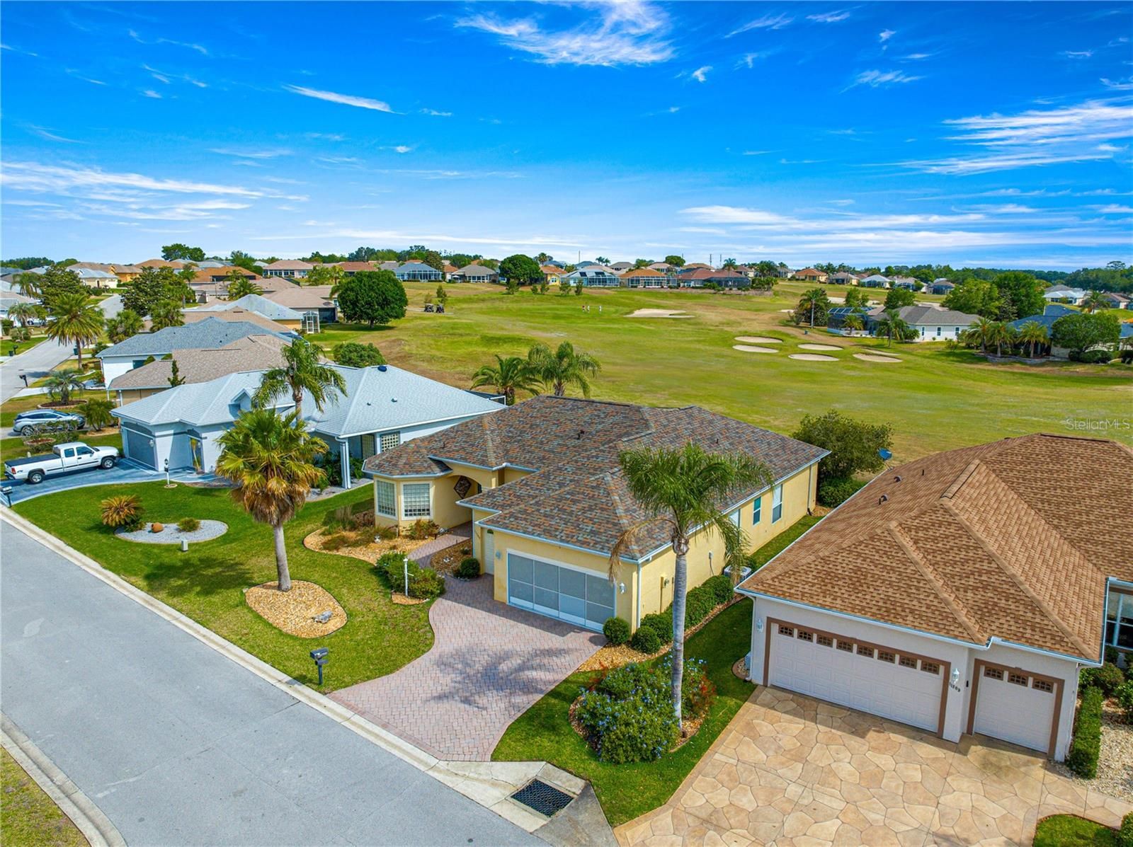 HUGE PRICE DROP because Seller's timeline has changed! BUILDER'S MODEL ON THE GOLF COURSE! This stunning and popular San Marco model is a find! Upgraded to the hilt and updated so all you have to do is move-in! The Builder spared no expense in creating this home. The brick paved driveway sets the stage for what to expect on the inside. 14 foot ceilings with crown molding and built-ins greet you as you enter the main door, but your eyes will be drawn to the panoramic golf course views to the back of the home. This home knows how to show off the views with display windows or sliders from every room to the back of the home including the kitchen. The living room has built-in cabinets that make a great space for all your books. The kitchen is light and bright with white quartz counters and 48" raised panel white cabinets. The huge island is perfect to gather around. The family room is adjacent to the kitchen making it a great place to relax and entertain. The office/den is currently being used as a bedroom with pocket doors but can easily be converted back giving you so much flexibility. The primary bedroom has a sitting area too that features a desk and overhead cabinets. LVP flooring in all the main areas and upgraded carpet with an 8lb pad in the bedrooms gives this home the perfect blend of that wow factor and comfort. The bedrooms are set in a split formation for maximum privacy. Speaking of privacy, the view and serenity from the lanai and birdcage to the back of the home is stunning. You can watch all the play on the par 4, 12th hole of this championship course. The 2.5 car garage gives you plenty of room for all your toys. The washer and dryer stay with the home. Roof was updated in 2020, A/C in 2024, newer water heater and fresh paint are just a few of the updates in the home. Stonecrest is a 55+ gated golf course community with tons of amenities such as 4 pools (1 indoor), pickleball courts, softball, 18 hole championship golf course, Broad Stripes Golf & Social Club, walking paths, pastures, meadows and over 80 different clubs to join! Stonecrest is just a bridge away by golf cart to the Villages. Come see why we are proud to offer this home for sale!