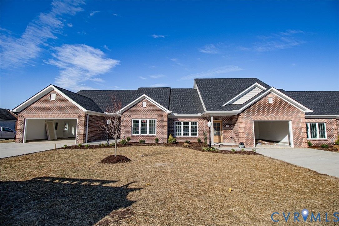 Discover effortless, single level living in this beautifully appointed 1,351 sq. ft. rancher located in the desirable age restricted community of Cobblestone. With 2 spacious bedrooms, 2 full baths, and an inviting rear patio, this all brick home offers modern elegance with low maintenance comfort. Step inside to a bright, open living room featuring vaulted ceilings and stunning waterproof hardwood flooring throughout. The kitchen and baths showcase luxurious quartz countertops, a ceramic tile backsplash, and custom painted cabinetry. Enjoy stainless steel appliances, a ceramic tile shower, and tastefully tiled bathrooms designed with quality and style in mind. A dual-fuel heat pump and tankless water heater provide year-round efficiency. Distinctive quoin-corner brickwork, a mahogany wood front door, and lush front yard sod with irrigation add refined exterior touches. Move-in ready and crafted with exceptional detail, this Cobblestone rancher is the perfect blend of comfort, style, and convenience.