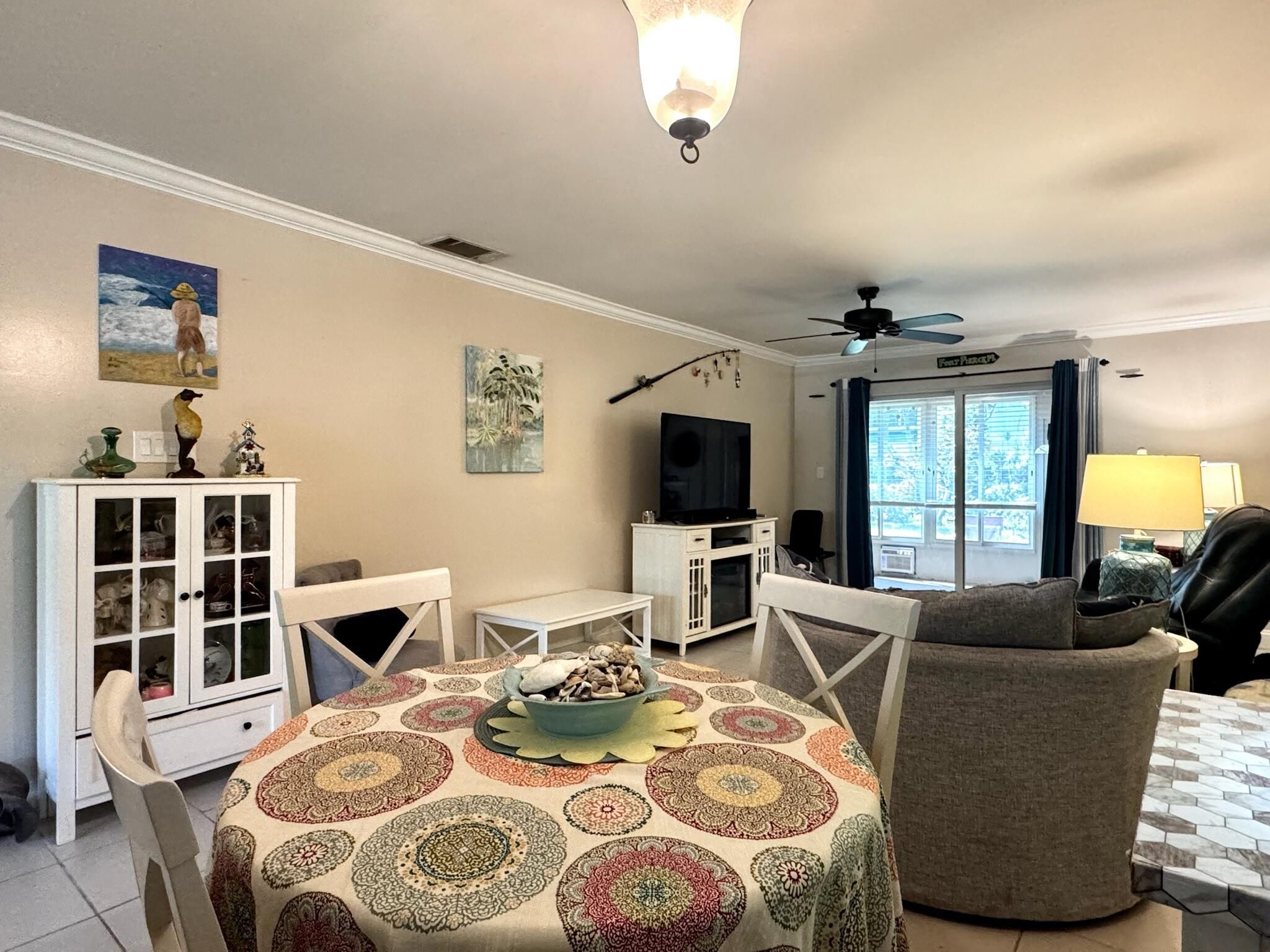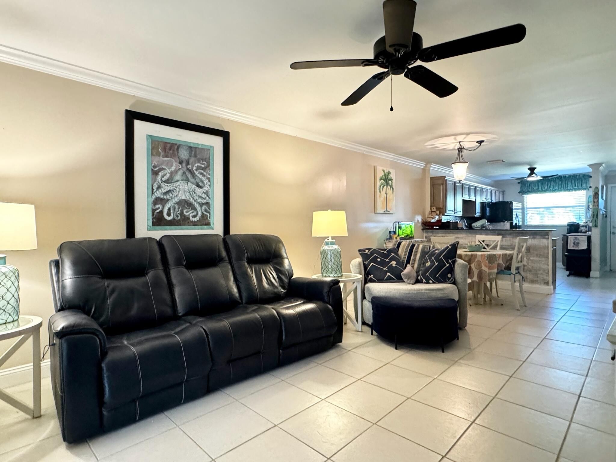 Experience relaxed island living in this beautifully maintained 2/ 2 ground floor unit on S.Hutchinson Island in the 55 plus development of the Colonnades. This condo features a coastal chic vibe with tile throughout for easy living and effortless style. The open concept living and dining area flows seamlessly into the enclosed Florida room offering extra living space year round with the added convenience of a storage closet. The kitchen boasts plenty of cabinetry complemented by sleek black appliances and gorgeous granite countertops. The breakfast bar offers additional seating and is perfect for casual dining. This condo combines comfort, style and convenience. Minutes from the beach, shopping and dining it is ideal for full time living or a seasonal retreat. Roof installed 2024.