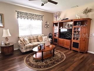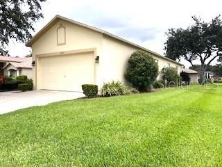 This Victoria III home sits on a large corner lot and has beautiful landscaping. Just inside the front door you are met with an open Foyer, a charming Bay Window providing plenty of natural daylight, Laminate flooring (new in 2022), and 10-foot ceilings. The home received a new Roof in 2023, and the HVAC was replaced in 2018. The open Dining Room is complete with a custom chandelier, and an opening into the Kitchen to assist in serving. The Kitchen boasts granite counters, stainless appliances, and nook area for that morning coffee or a quick lunch bite. There is also a gracious Family room just off the Kitchen allowing the food prep to be done while engaging in family activities. The main bedroom has double walk-ins, slider, and ceiling fan. The ensuite has dual sinks, a glass enclosed shower, and linen closet. Just on the other side of the home you will find a guest bedroom and bath, plus the third bedroom is being used as a den/office. The expanded Lanai is screened and has a ceiling fan to keep that air moving on warm days. The Laundry room includes a newer washer/dryer and shelving, with plenty of room for that task, and the garage has an elevated ceiling allowing more room for storage. Heritage Pines is a very active community with an 18-hole private golf course, lighted tennis/pickleball courts, Olympic size swimming pool and spa. The Clubhouse offers the best in dining and entertainment, plus crafts/clubs for every interest. This is a retirement lifestyle that is hard to beat!