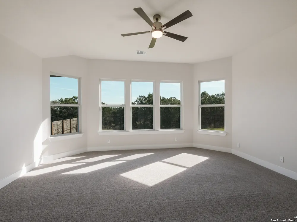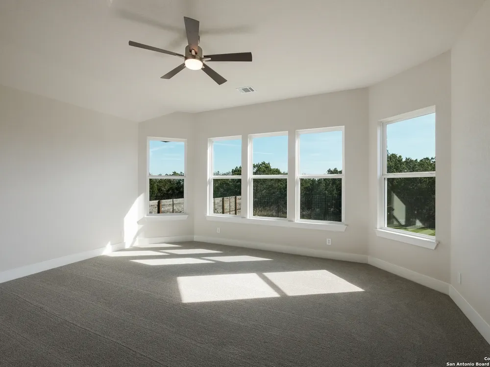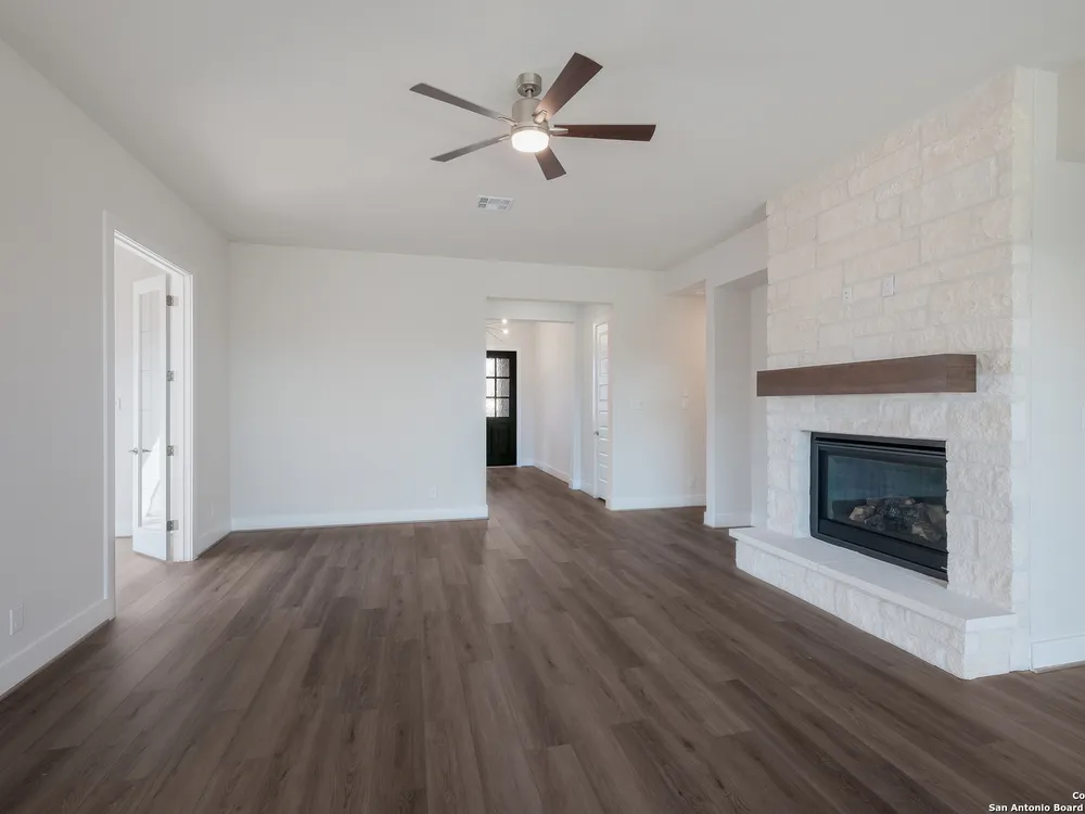 ** MOVE-IN READY ** Discover your dream home at 1182 Catnip in New Braunfels, TX. This 4-bedroom, 3-bathroom house offers an impressive 2,691 square feet of living space, perfect for those seeking comfort and style. Step inside to find a thoughtfully designed interior featuring a private flex room, ideal for a home office or hobby space. The family room boasts a cozy fireplace, creating a warm and inviting atmosphere for gatherings. Enjoy picturesque views from the bay windows in both the dining area and master bedroom, bringing natural light and charm to these spaces. The master suite is a true retreat, complete with a luxurious soaking bathtub and walk-in shower. Throughout the home, you'll find elegant white cabinets, soothing gray wall paint, and durable vinyl flooring in main areas. The kitchen is a chef's delight, featuring decorative backsplash, a 5-burner gas cooktop, and ample counter space for culinary creations. Outdoor living is a breeze with an extended covered patio measuring 16x16 feet, perfect for al fresco dining or simply relaxing. The property backs up to a serene green space, providing a peaceful backdrop for your daily life. Located in the vibrant Vintage Oaks community, residents enjoy access to an array of amenities including 5 miles of maintained trails, a Tuscan-style clubhouse, and a 7,800+ sq. ft. fitness club. The resort-style Olympic-sized pool, lazy river, and children's playground offer endless entertainment for all ages. Sports enthusiasts will appreciate the tennis courts, soccer field, and baseball field. Schedule your viewing today and experience the best of New Braunfels living.
