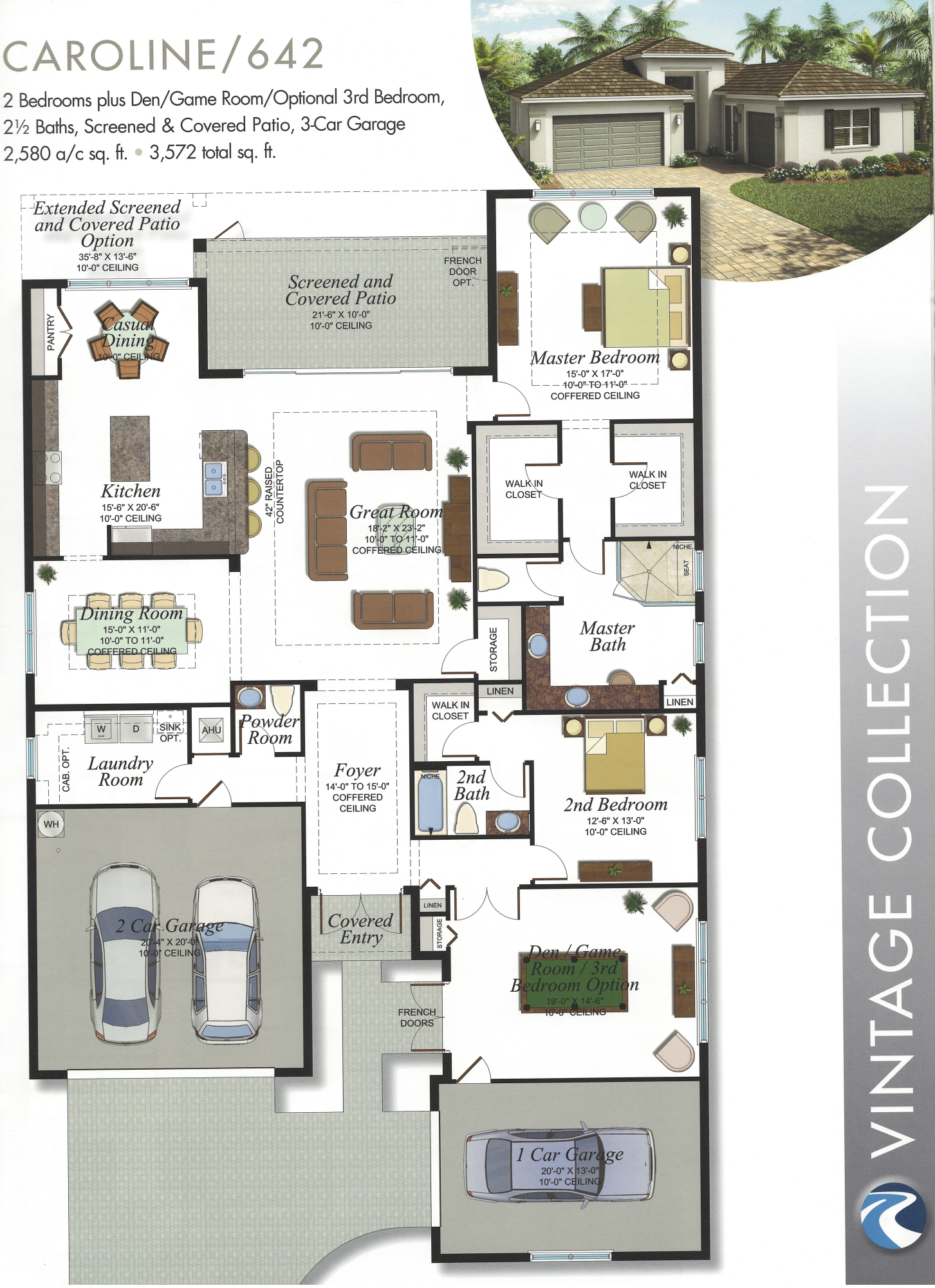 Move-in Ready Home in Valencia Cay at Riverland's 55+ Active Adult Community. Don't hesitate! This stunning Caroline Model home is ready for move-in at Valencia Cay/Riverland, and it's a one-of-a-kind gem that can't be replicated. There's no need to wait for new construction, which can take up to 18-24 months. Experience the best of the Valencia lifestyle now in this Vintage Series Caroline Model home located in a 55+ active adult community. This gorgeous home boasts 2 bedrooms, 2 full baths, 1 half bath, and a Club Room that could easily be converted into a third bedroom. The open floor plan includes a Kitchen, Great Room, and Dining Room, all with striking tropical views of the private backyard.