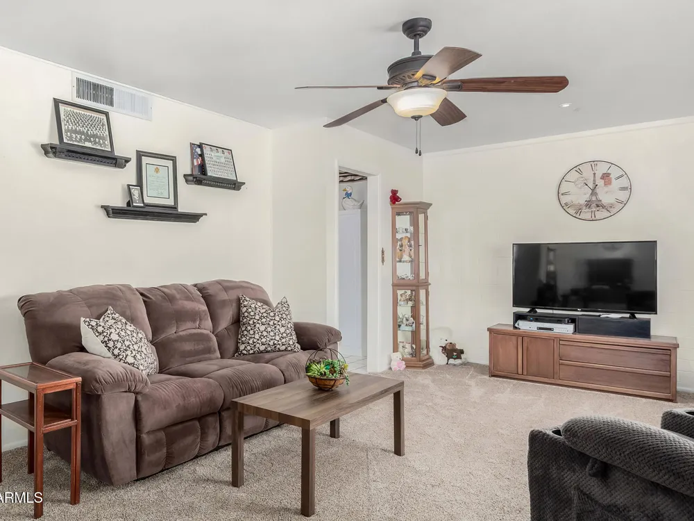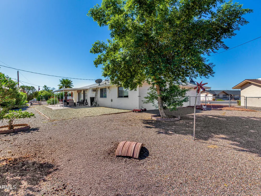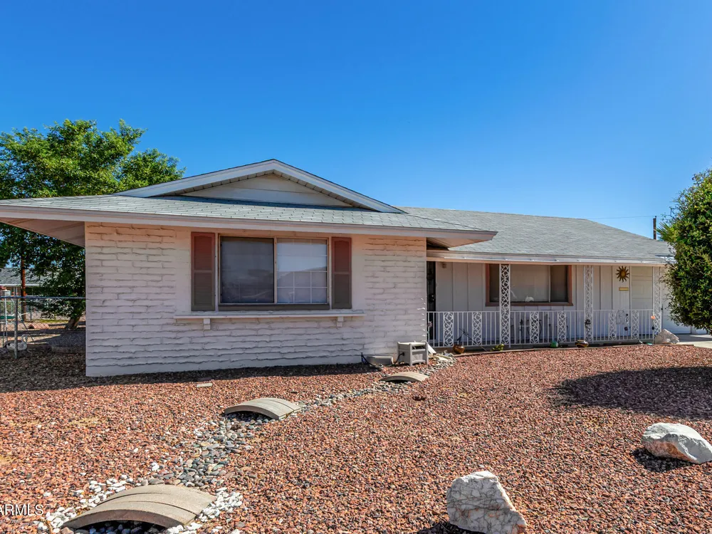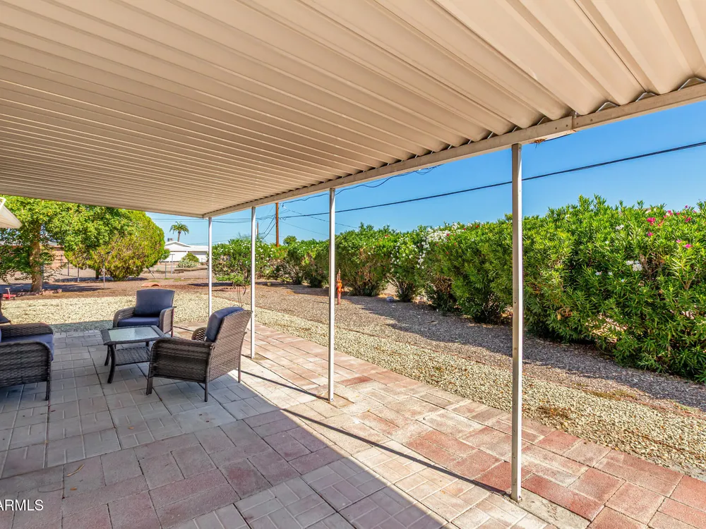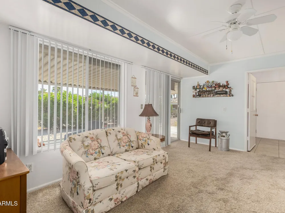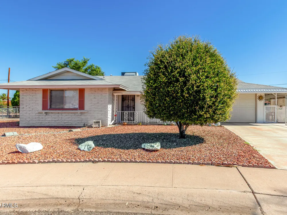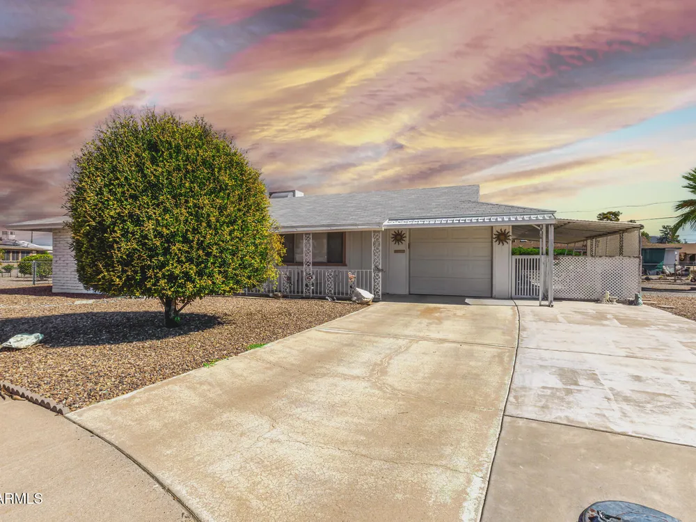 Welcome to this lovely 2-bedroom, 2-bath detached home with a 1-car garage, ideally situated on a peaceful cul-de-sac in Sun City. The property features a yard with mature trees and house with thoughtful design. Inside, the spacious living room creates a bright and open feel. The Arizona room is fitted with dual-pane windows, providing comfort and energy efficiency year-round. Bonus! Covered parking for your golf cart. The kitchen is designed with convenience in mind—featuring pull-out shelving in both the sink and stove cabinets for easy storage. Additional highlights include seven ceiling fans, and two generously sized bedrooms.